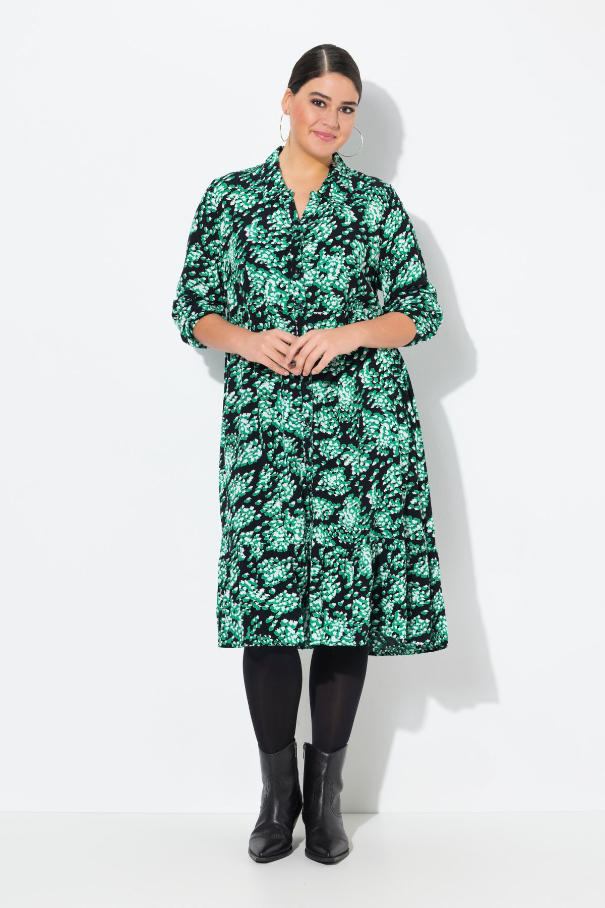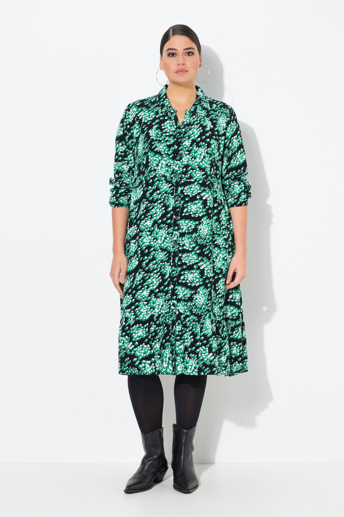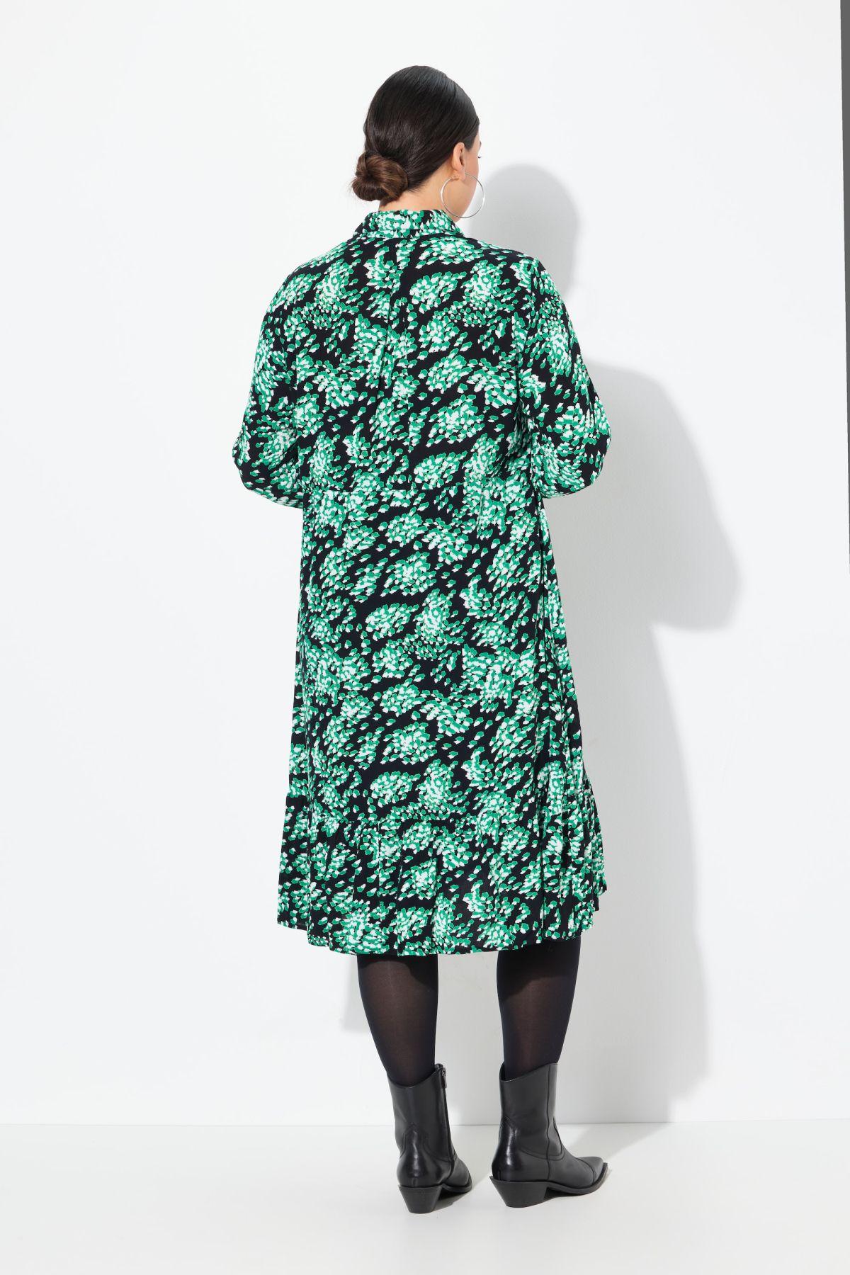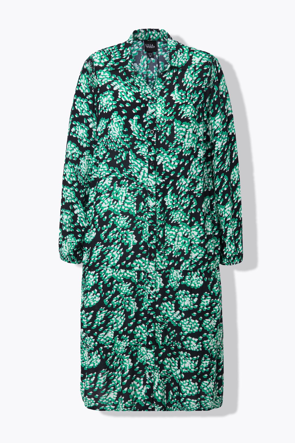 Рокля тип риза с графичен принт като напръскан с със спрей. От лека, фина материя и разкроен силует. С яка, копчета отпред и дълги ръкави.