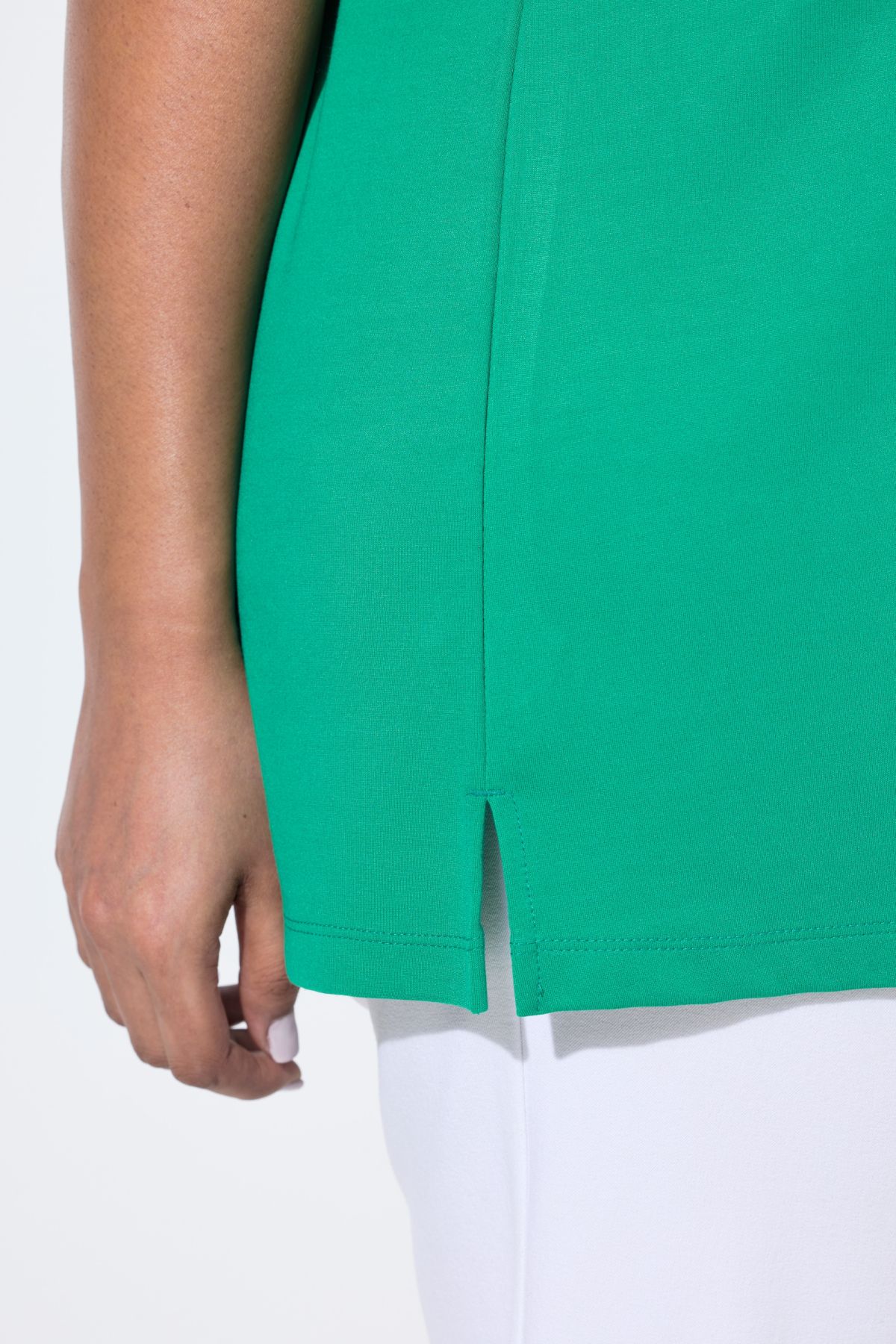 Тениска с мъниста на кръглото деколте. С къси ръкави. От мека, еластична материя.