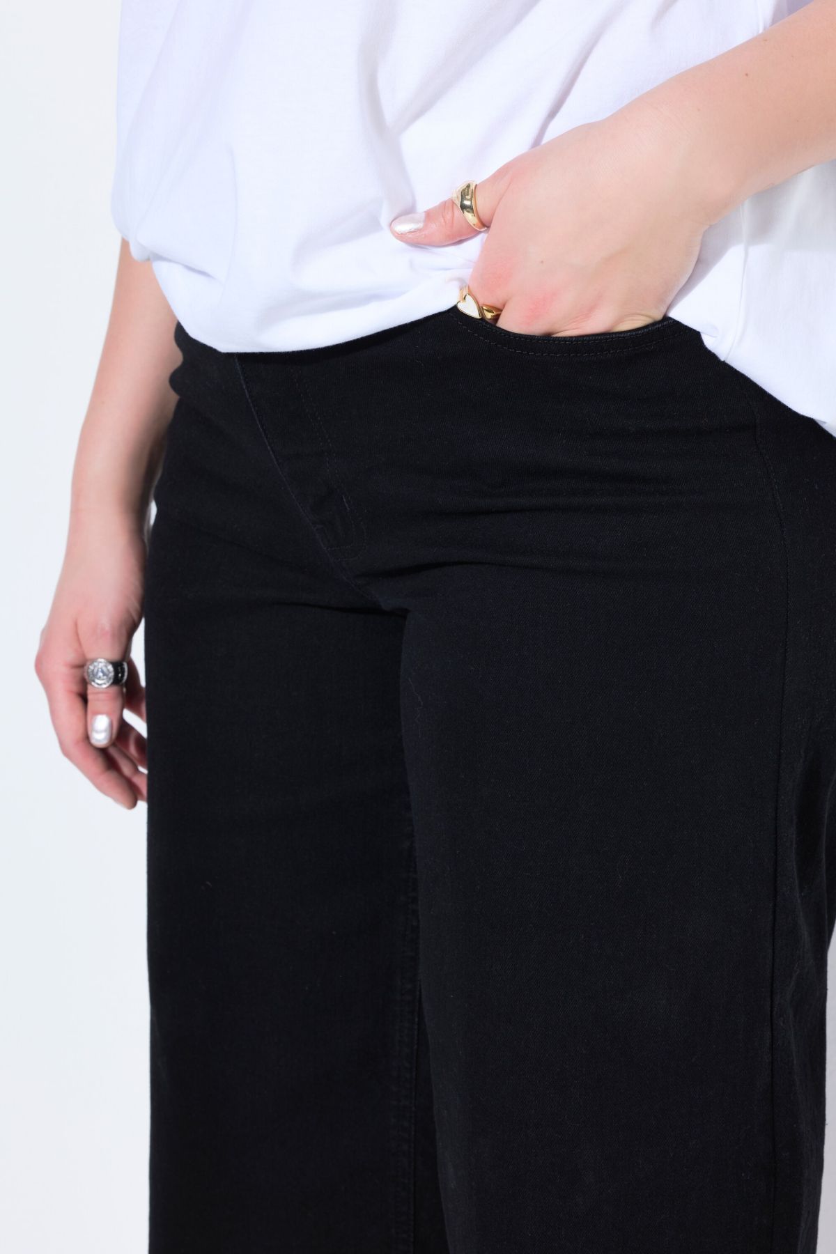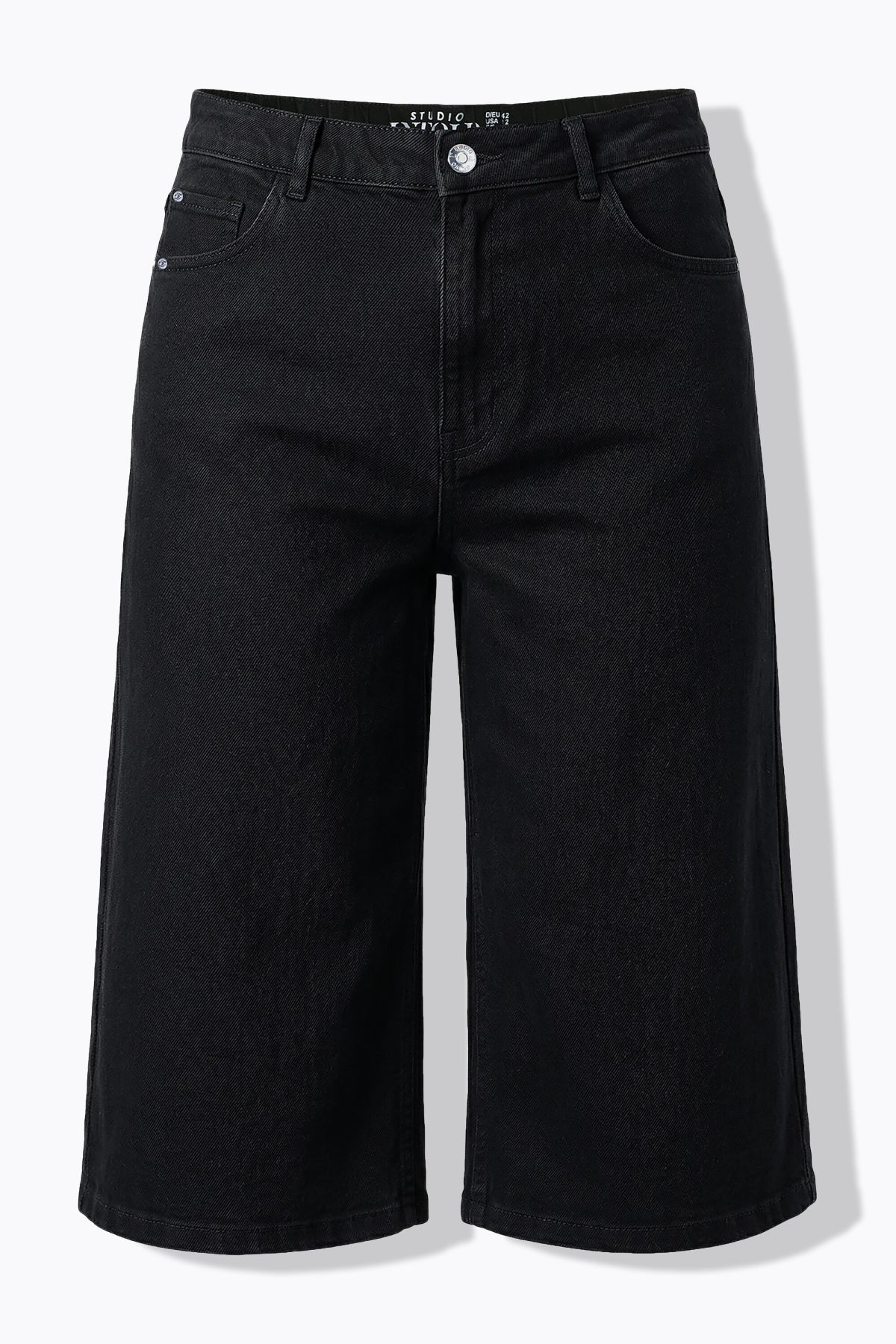 Дънкови шорти с модерна широка визия и комфортна кройка. С фиксирана талия с гайки за колан, копче и цип отпред.