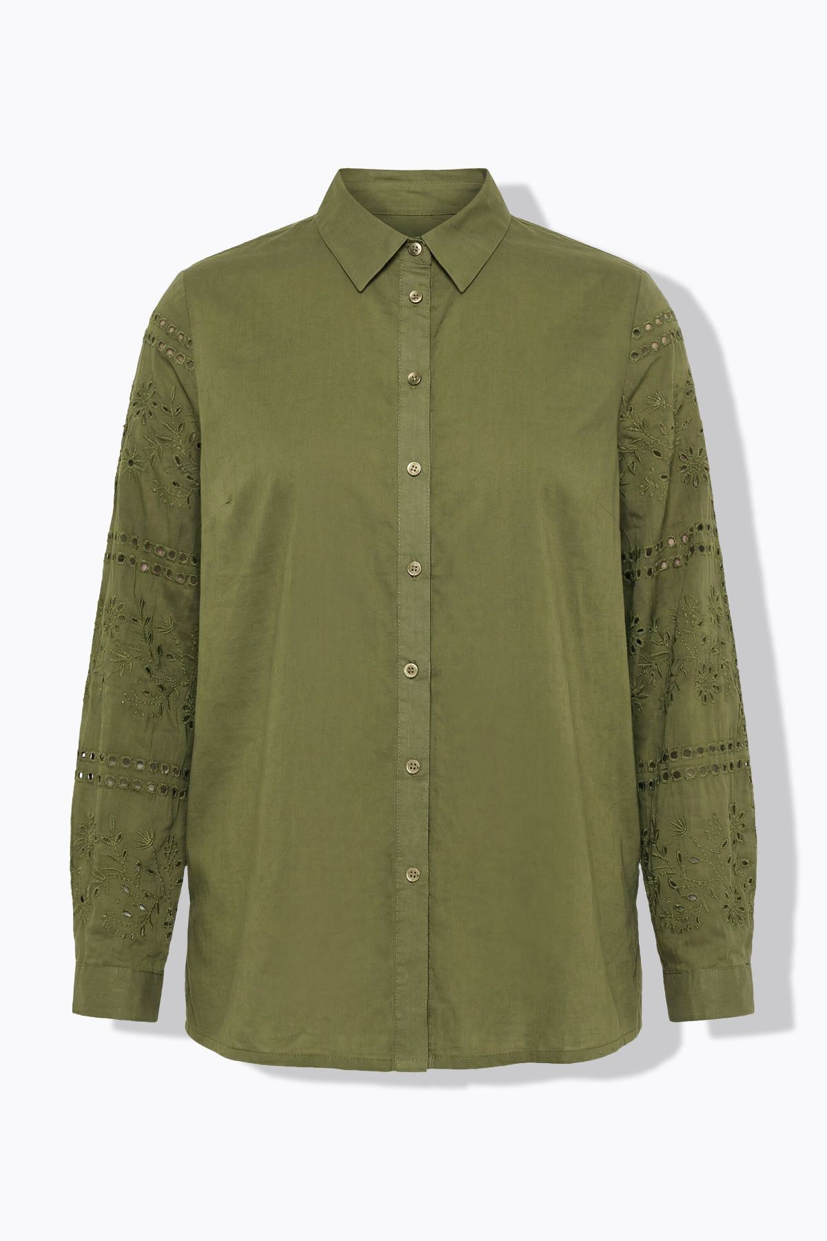 Риза с дантелени акценти с яка, копчета отпред и дълги ръкави с маншет с копче. С овърсайз кройка. От мека, памучна материя.