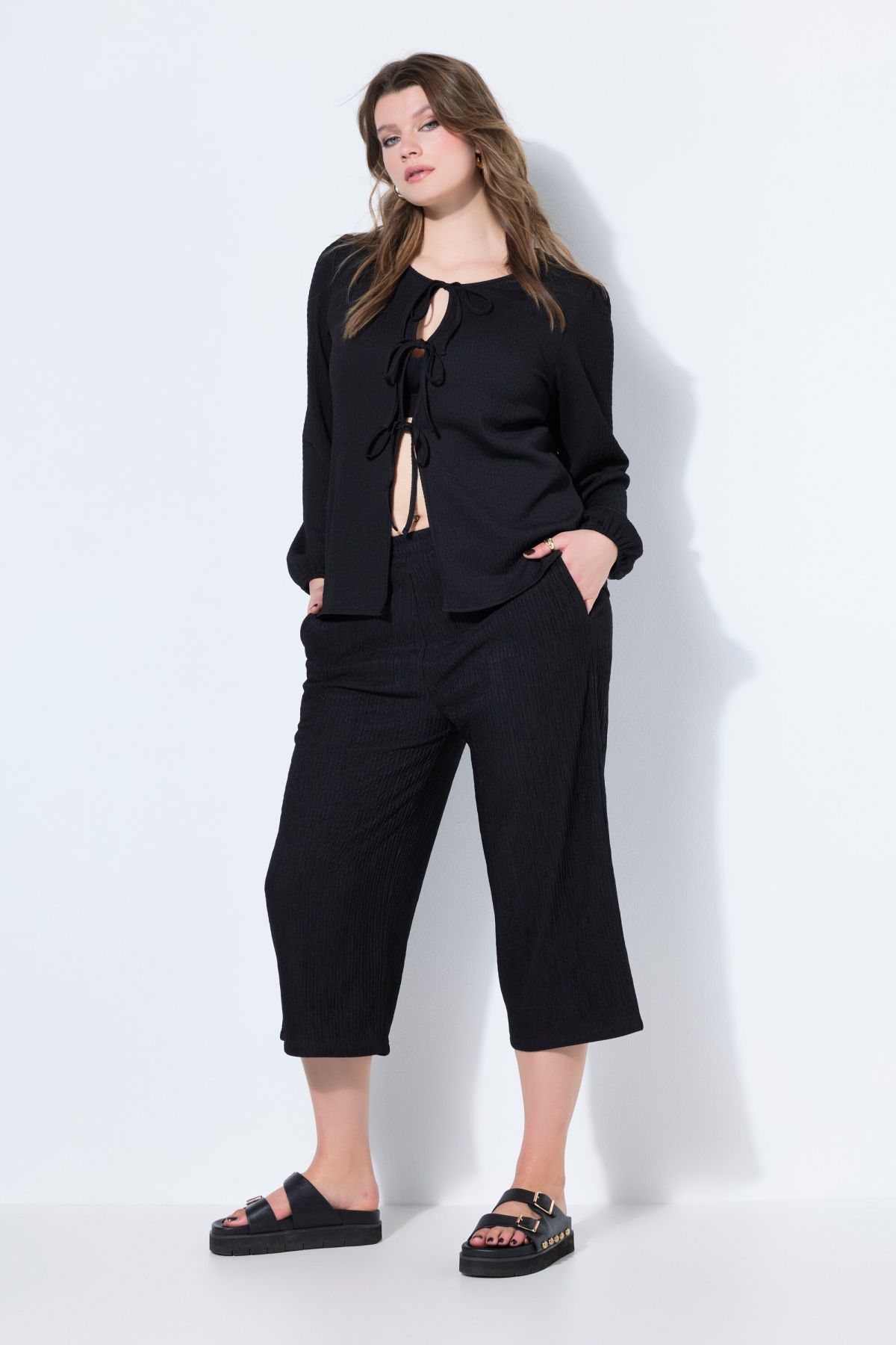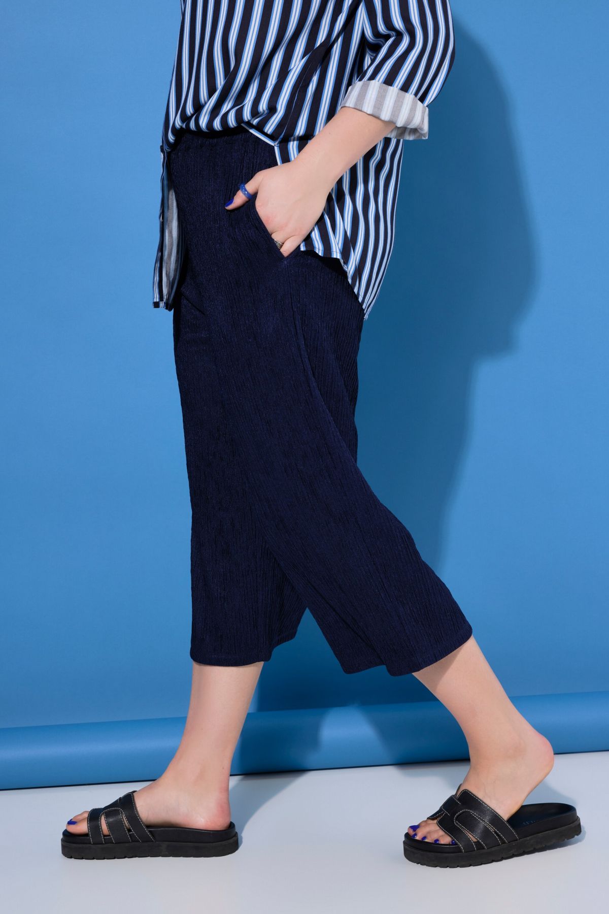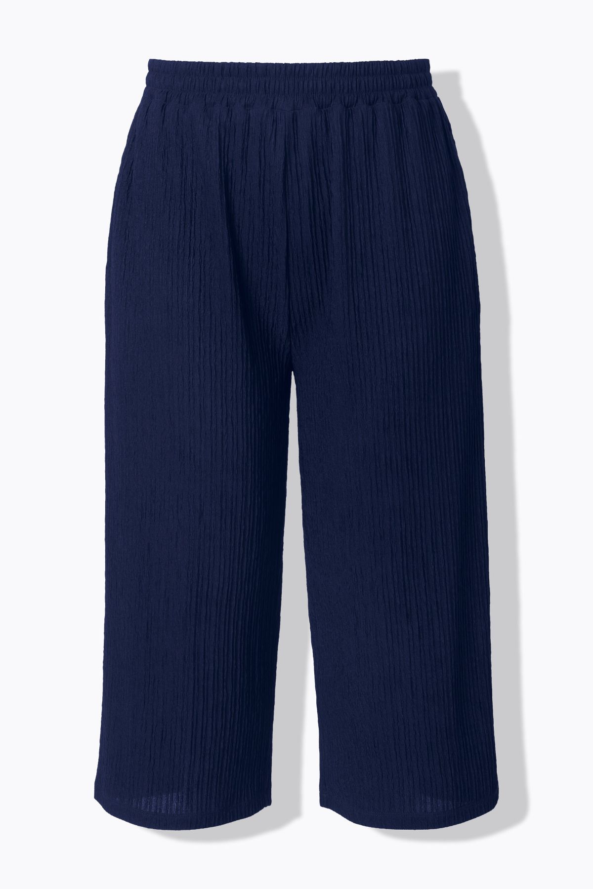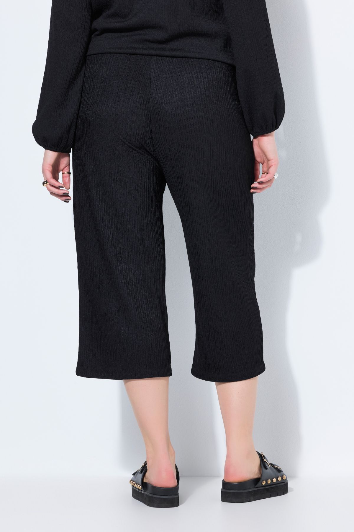 Панталон от прохладна трикотажна материя с широки крачоли и по - къса дължина. С еластична талия и странични джобове.