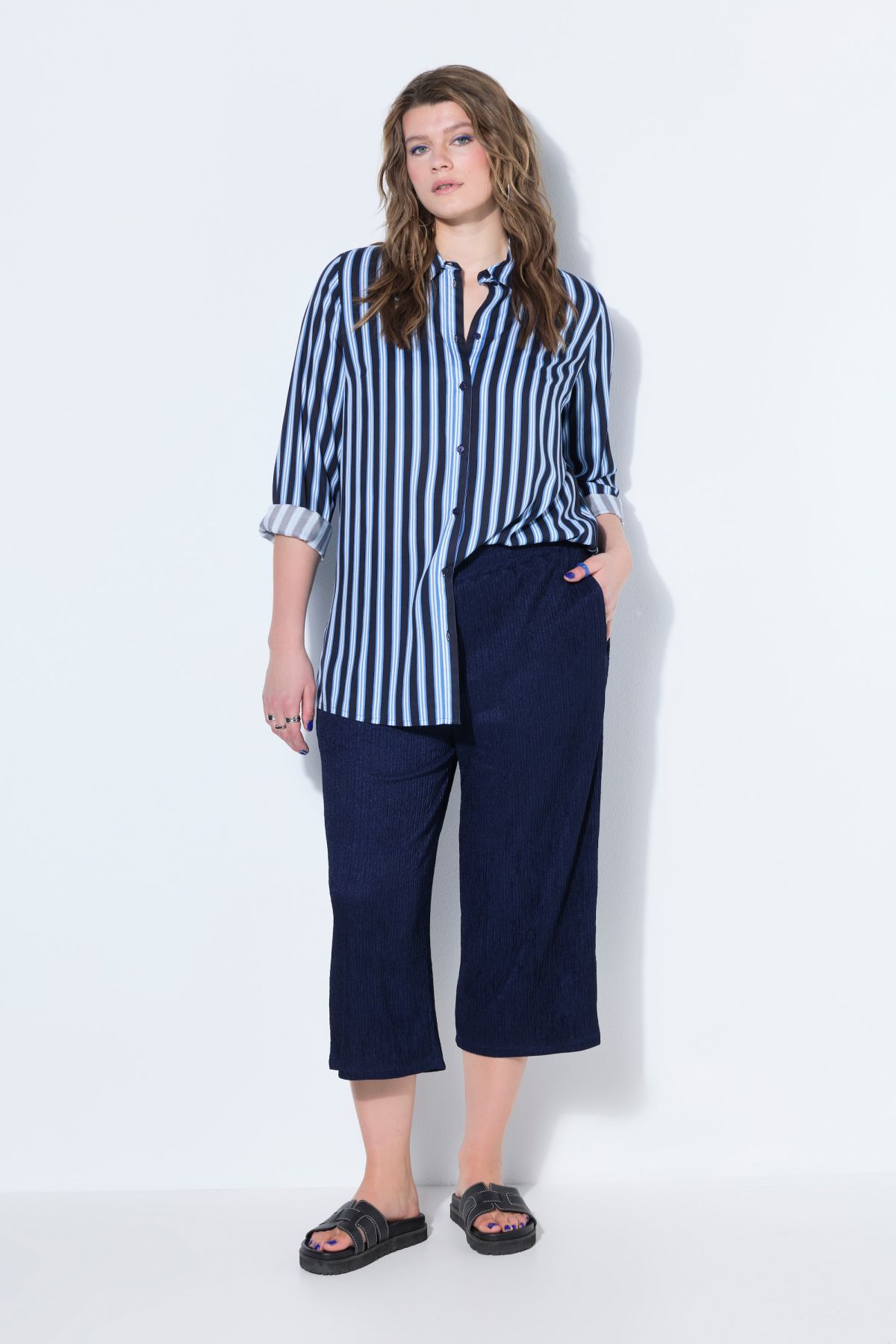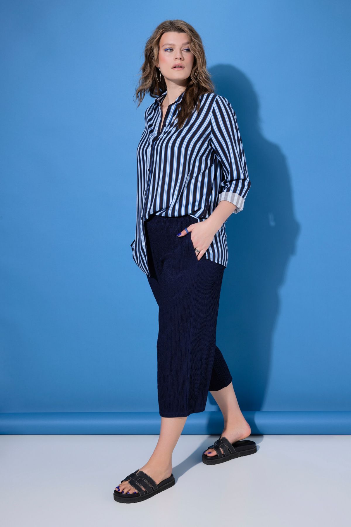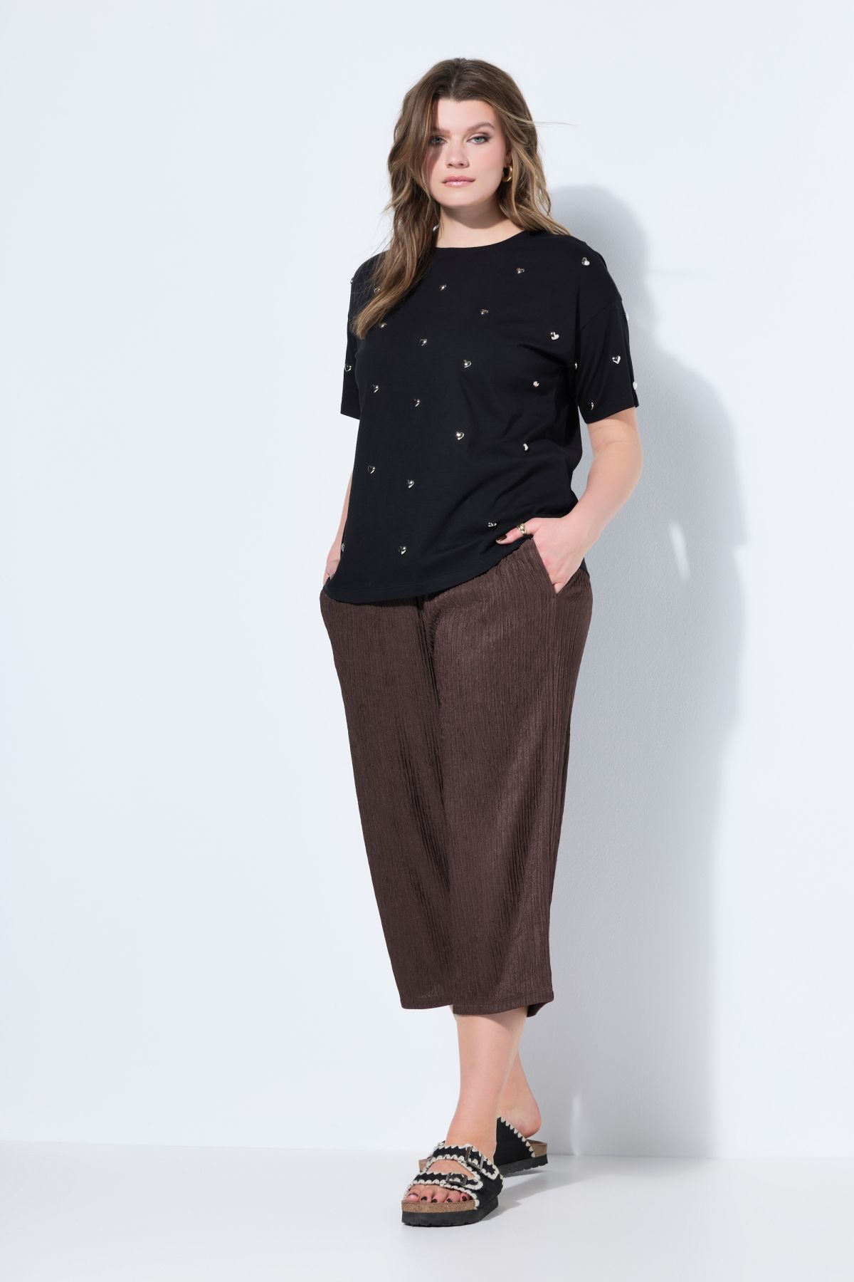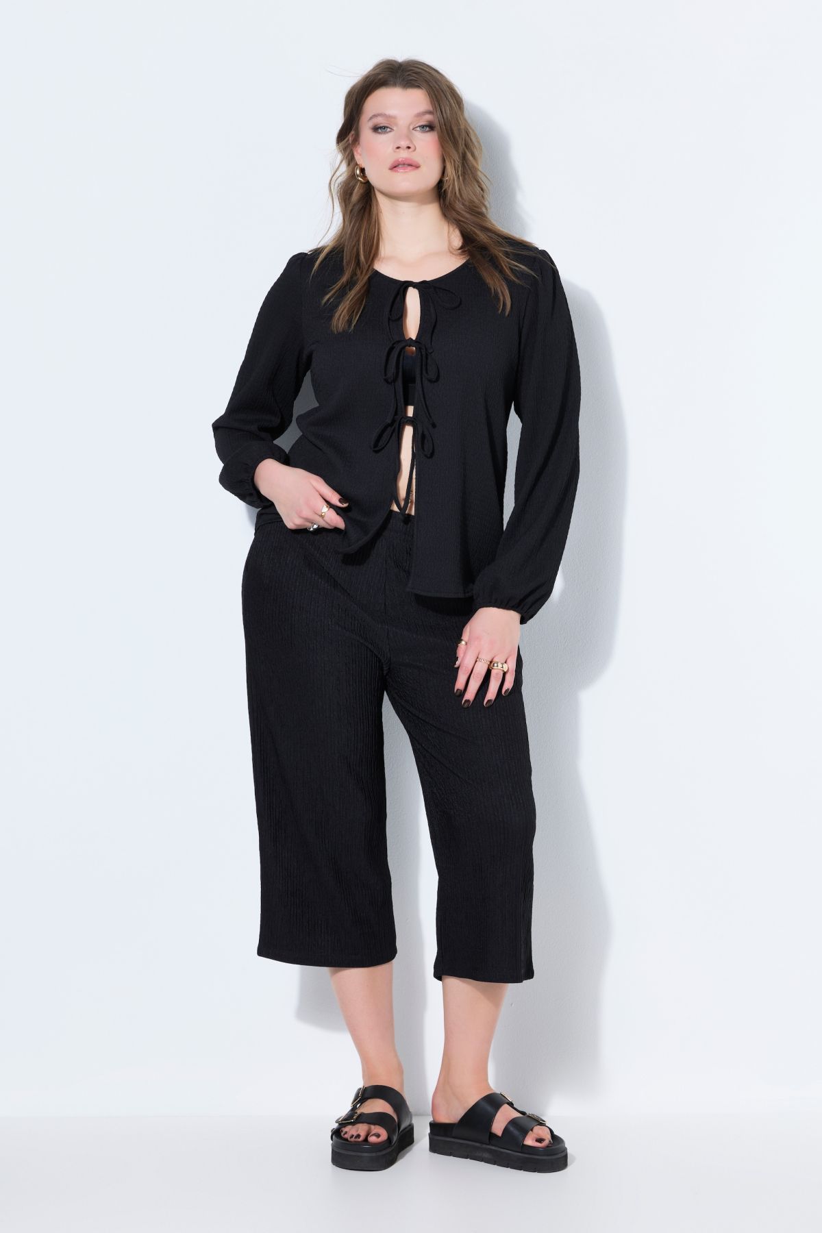 Панталон от прохладна трикотажна материя с широки крачоли и по - къса дължина. С еластична талия и странични джобове.