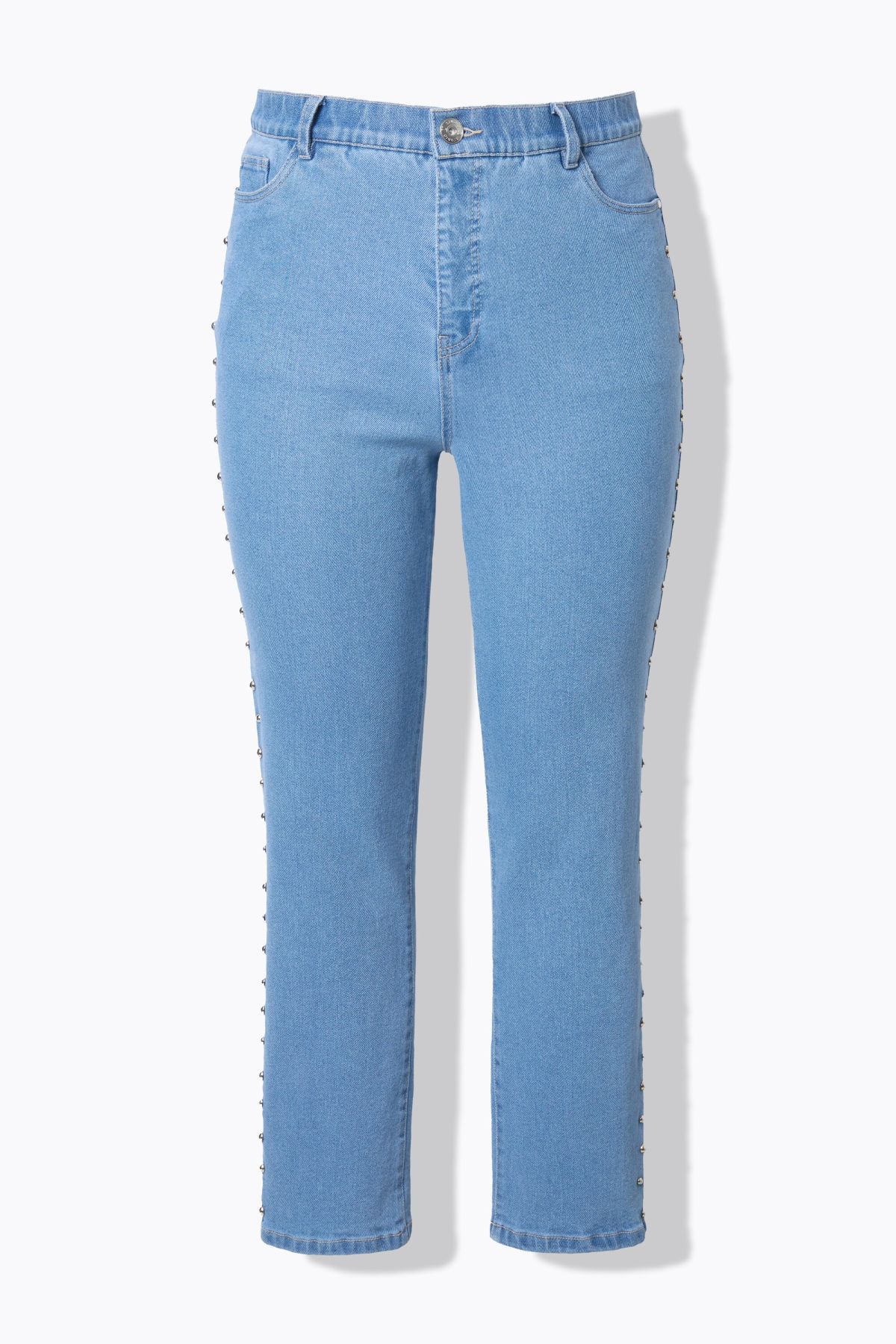 Дънки тип Mom с декоративен акцент и ресни на подгъва. Дизайн с фиксирана талия с гайки за колан копче и цип отпред. С 5 джоба.
