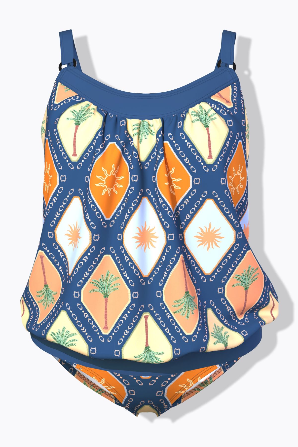 Танкини с геометрични акценти. С горнище с кръгло деколте и комфортни презрамки, които се регулират и еластичен подгъв. С подплата отпред. С долнище тип бикина с подплата.