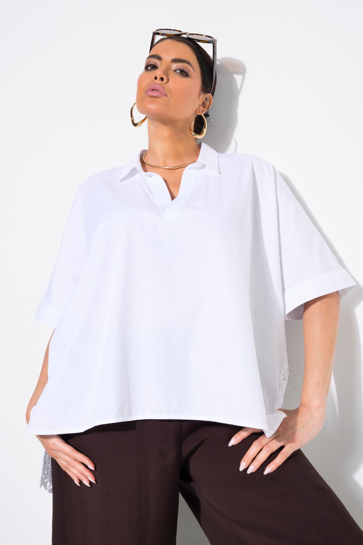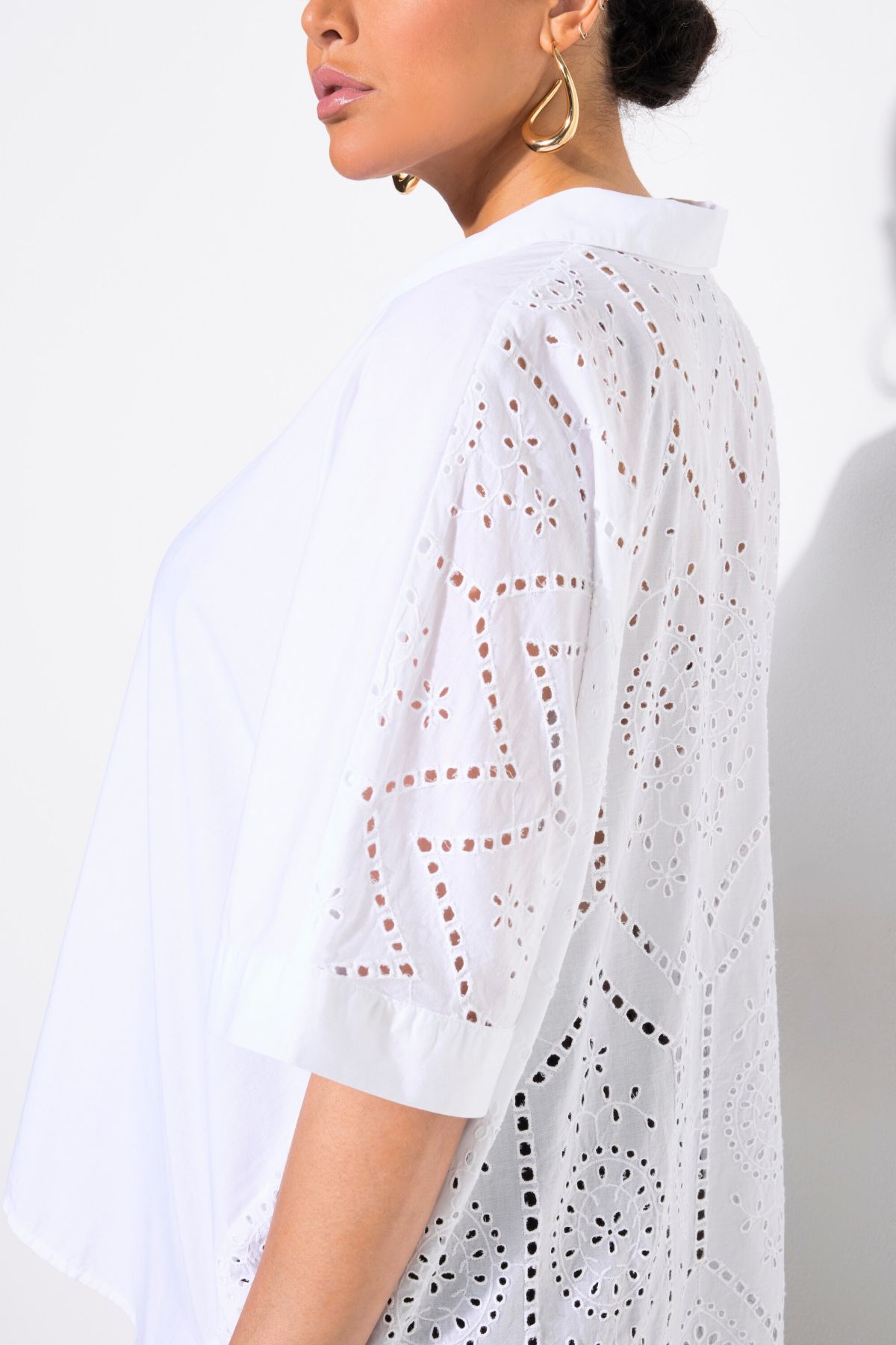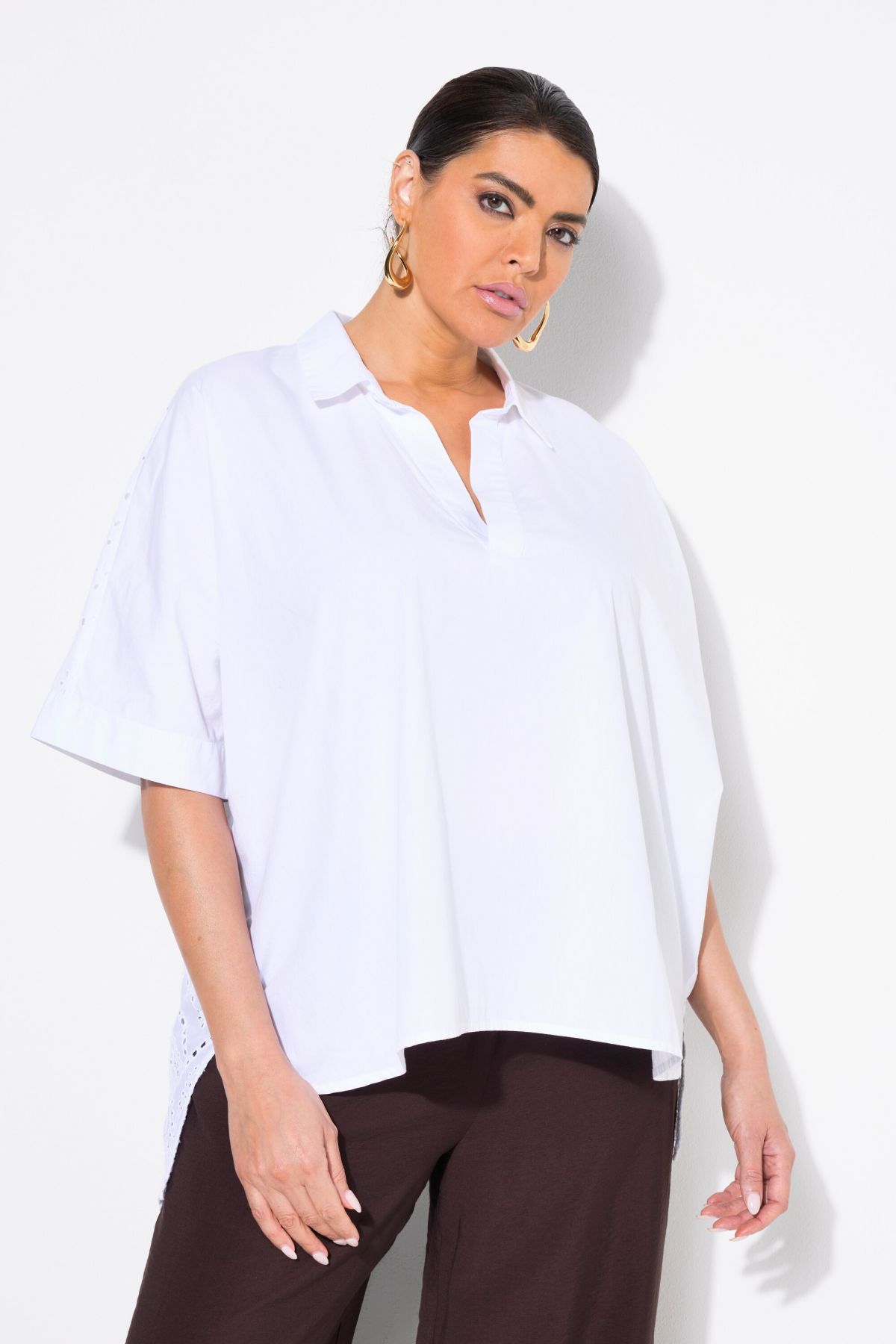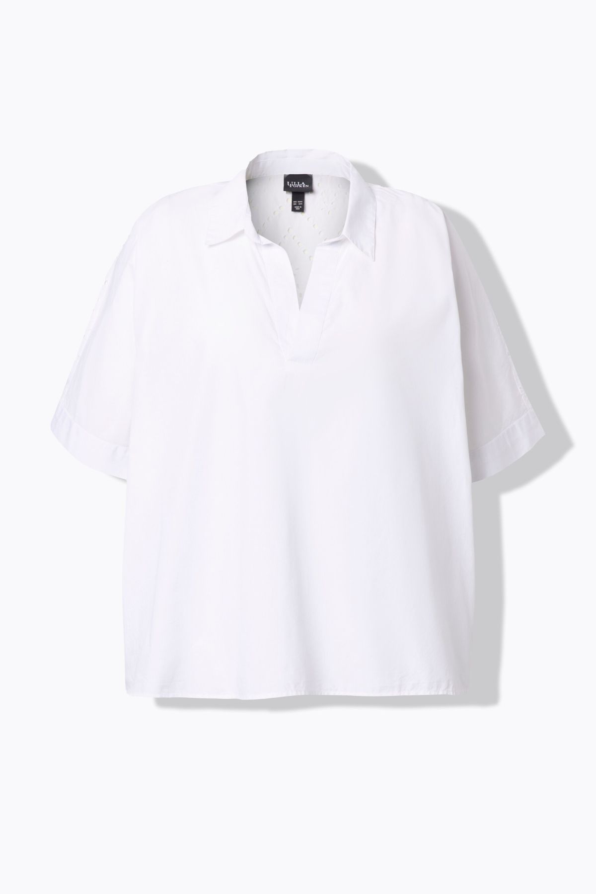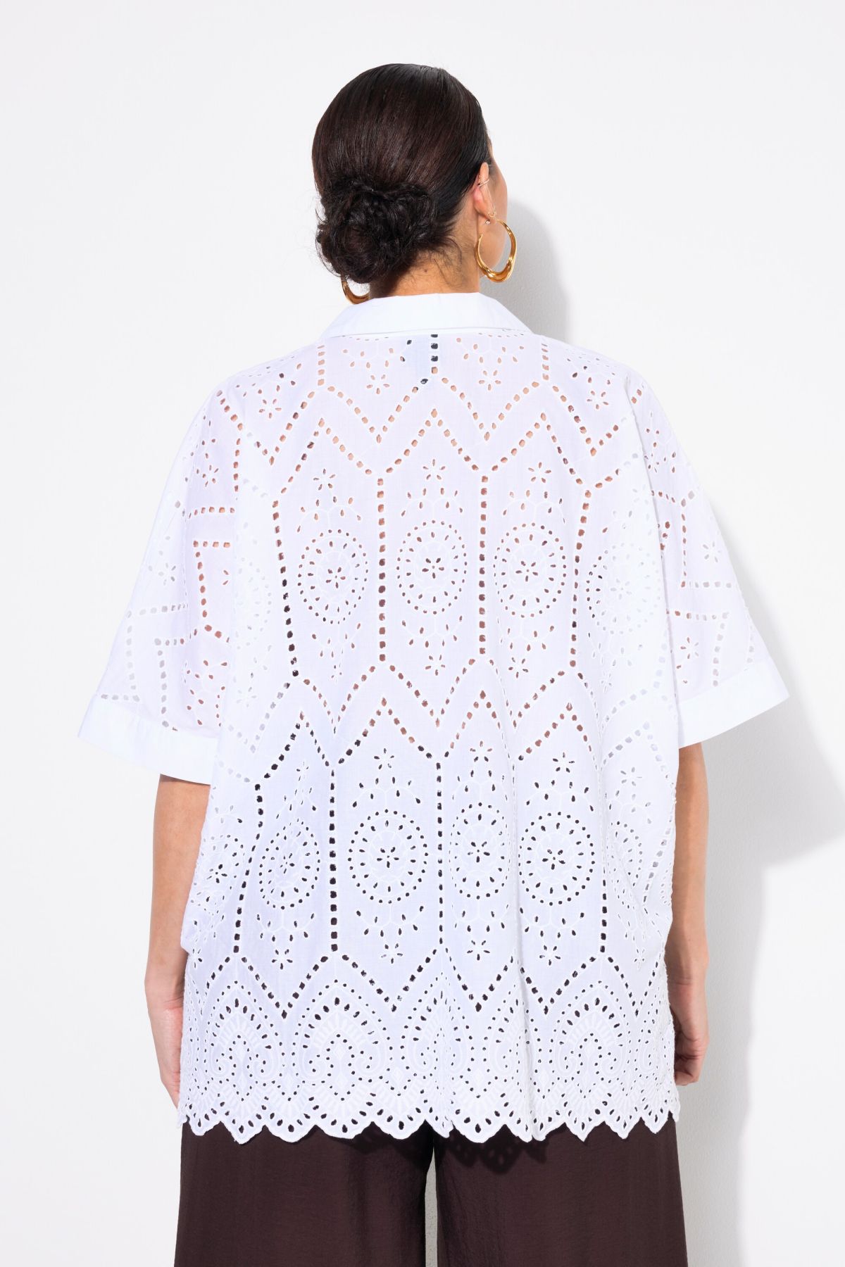 Блуза с модерна бродерия и бизнес визия. С кръгло деколте с цепка, къси ръкави и комфортна яка