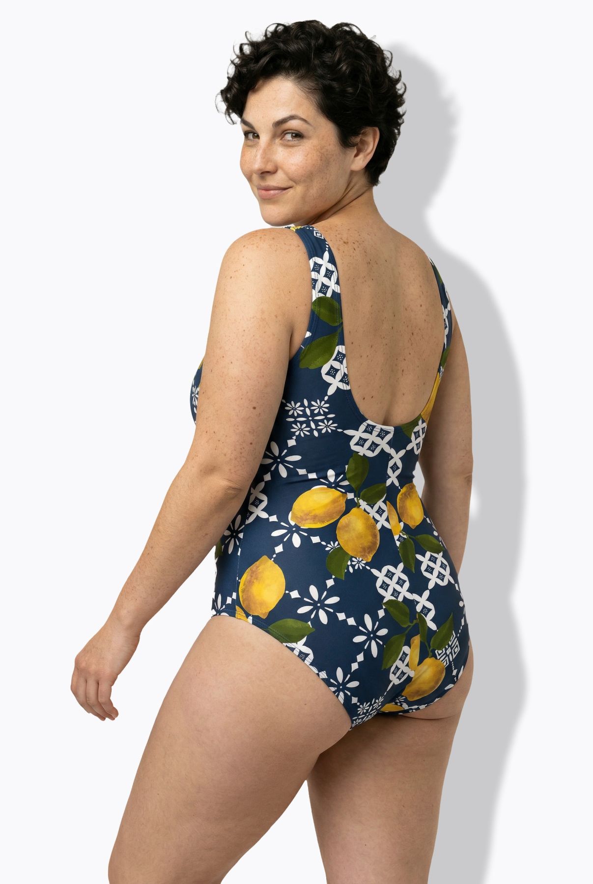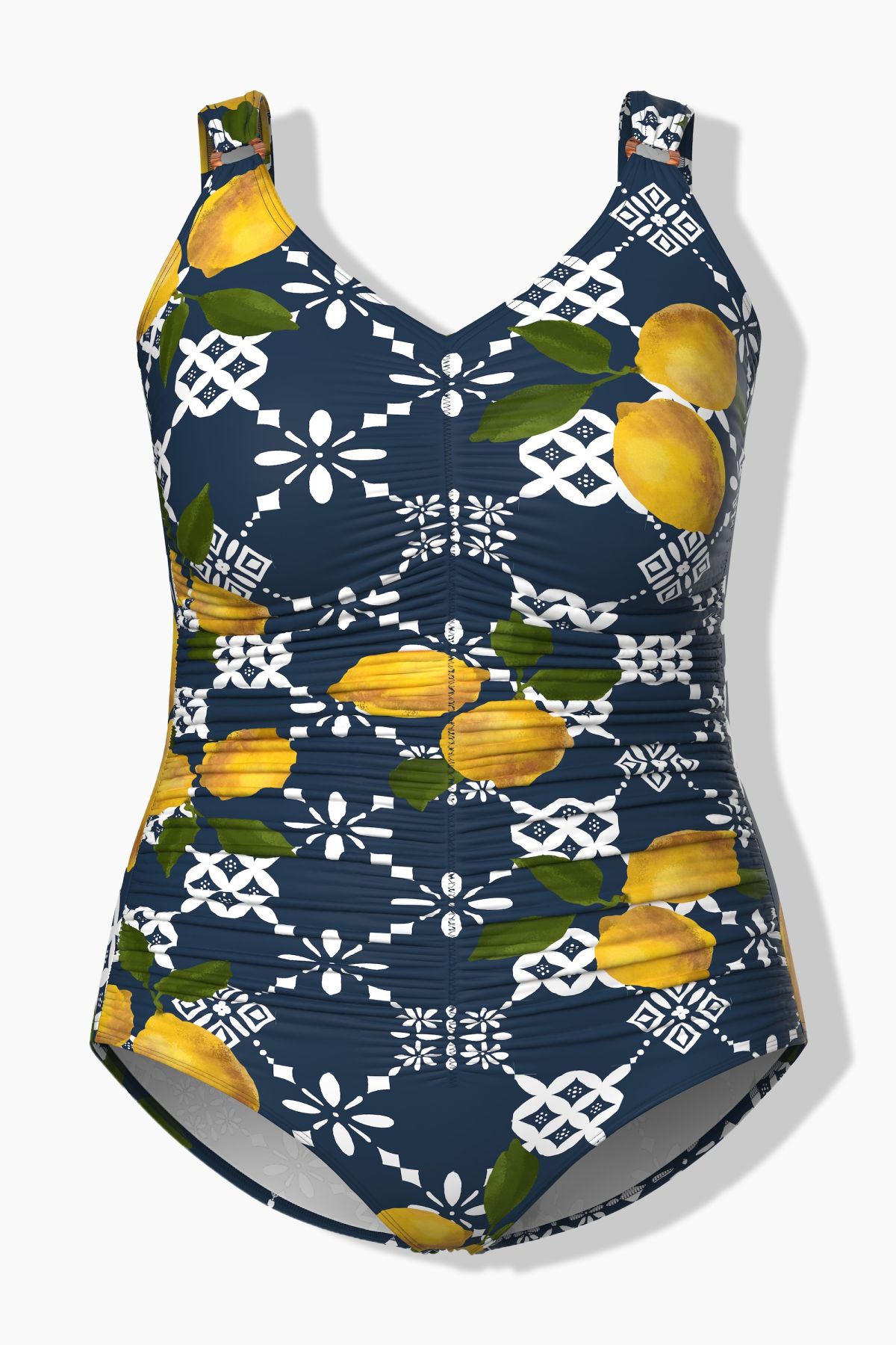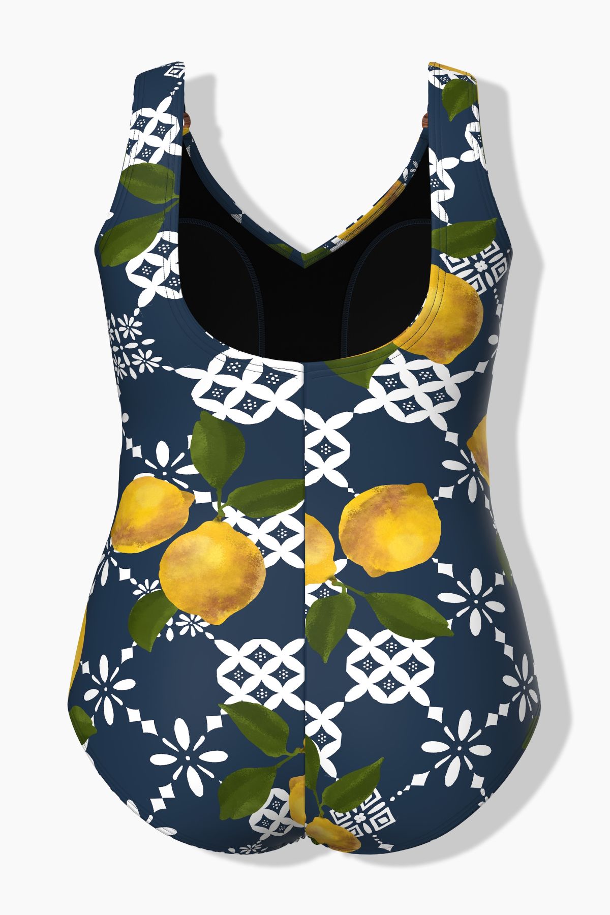 Бански с геометричен принт на лимони. С широки, комфортни презрамки. С оформени чашки, еластична лента под бюста за поддържане, V - образно деколте и подплата отпред. От рециклиран полиамид.