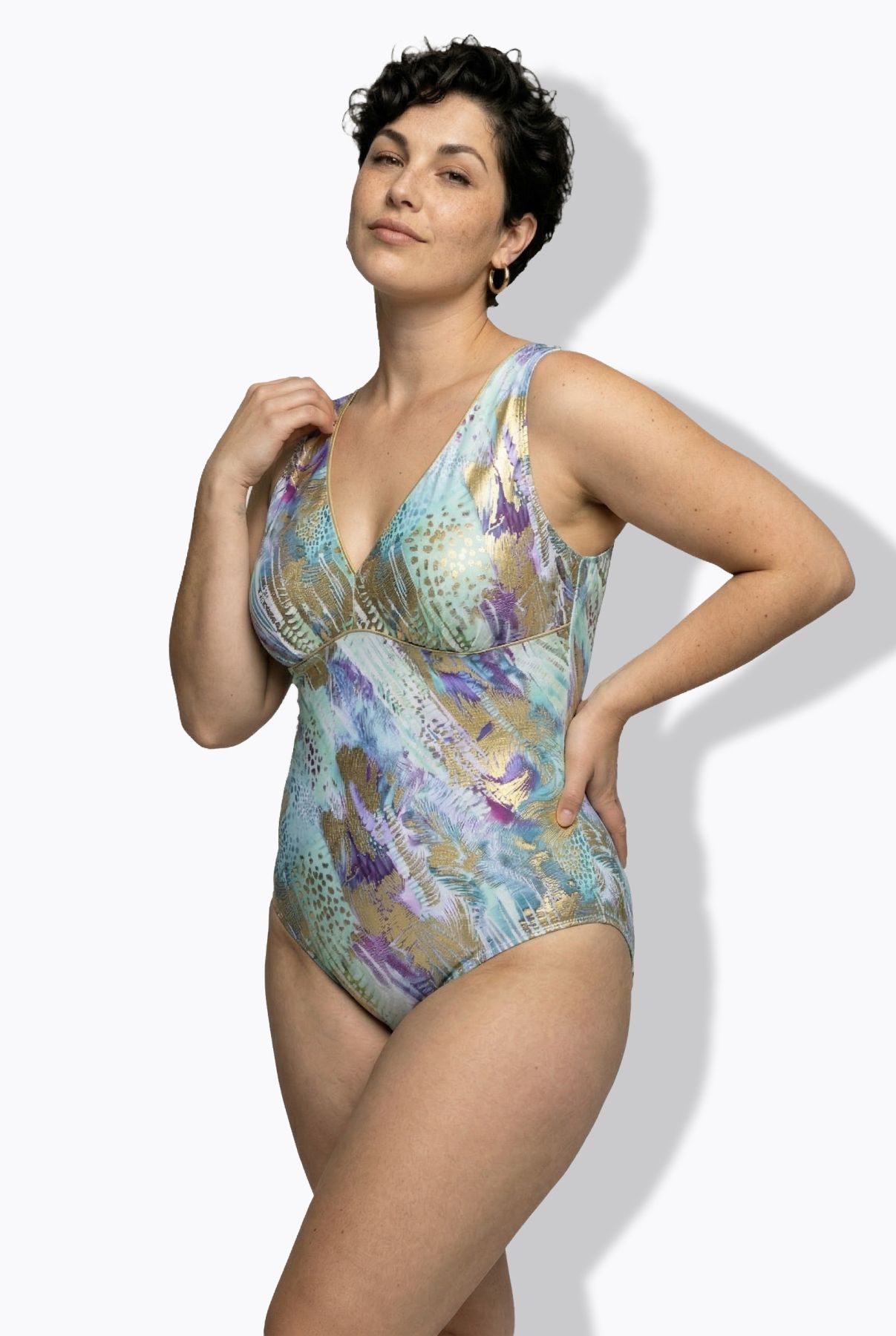 Бански с металически рисуван принт. С широки, комфортни презрамки. С оформени чашки, еластична лента под бюста за поддържане, V - образно деколте и подплата отпред. От рециклиран полиамид.