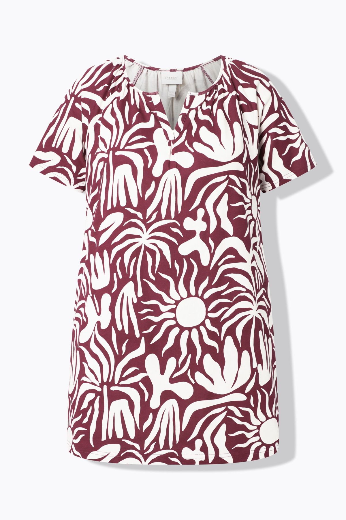 Туника с абстрактен принт на слънце. Перфектна за ежедневието. С кръгло деколте с цепка и къси ръкави. От мека, памучна материя.