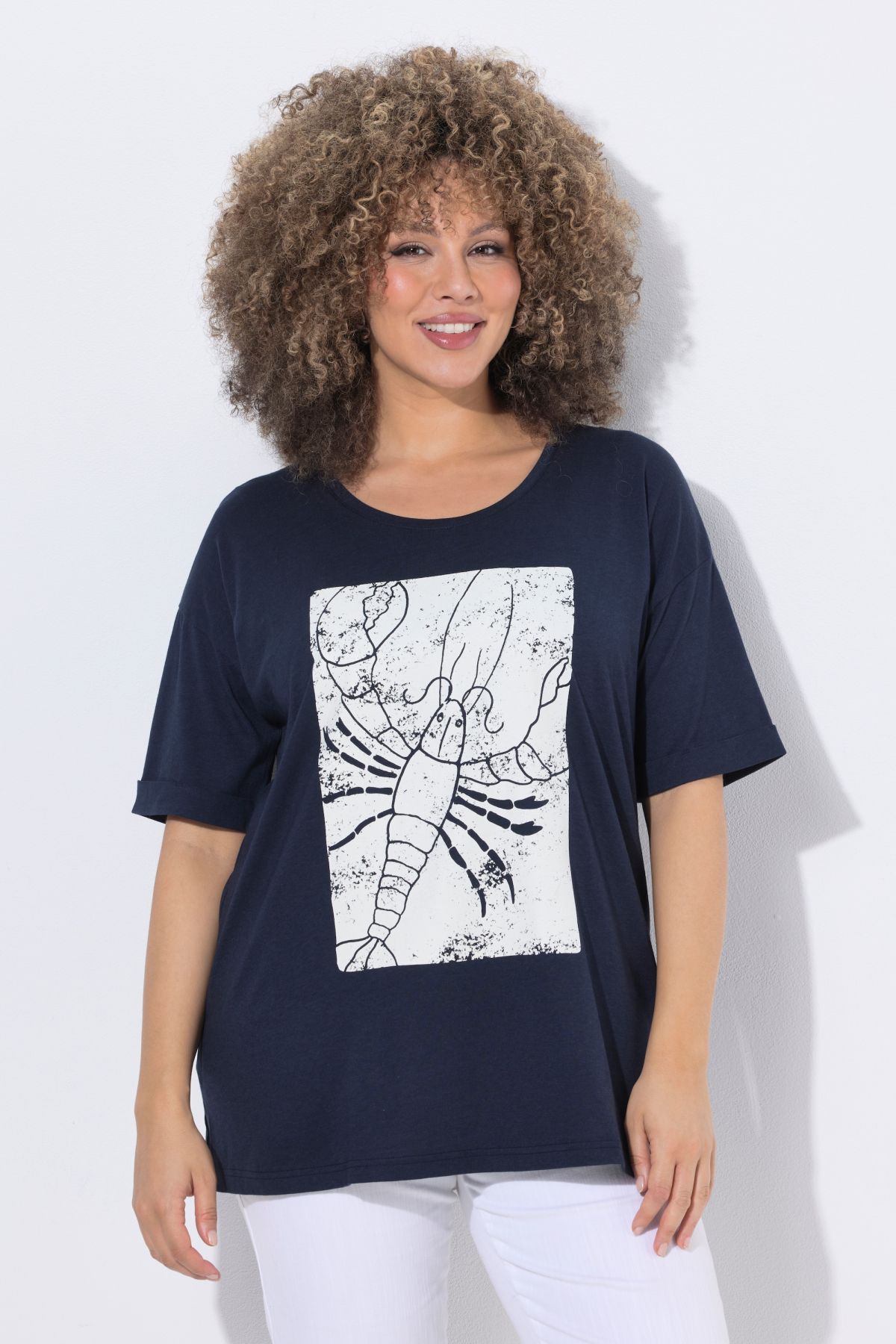 Тениска с графичен мотив на омар. От мека, модална материя за максимален комфорт в ежедневието. С кръгло деколте, къси ръкави и странични цепки на подгъва.
