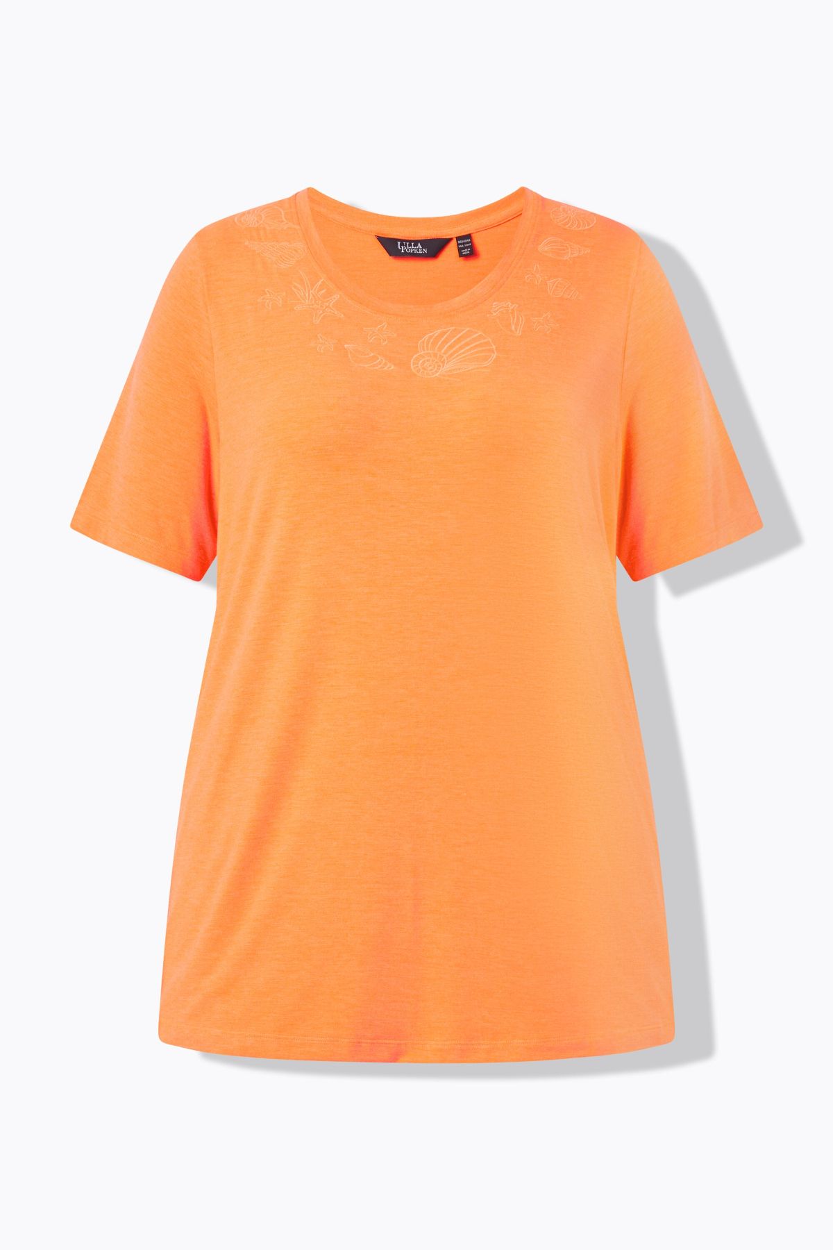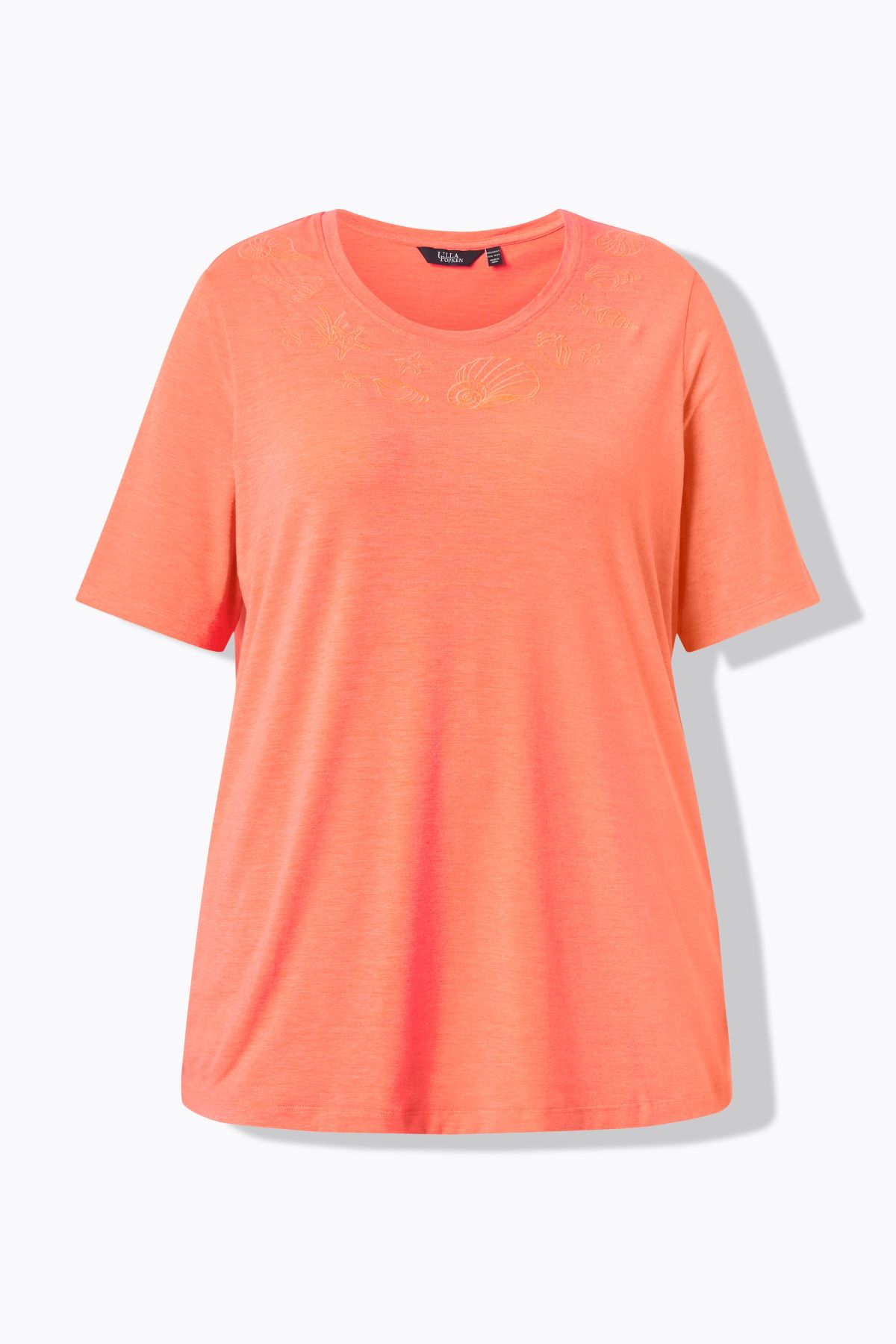 Морска бродерия, кръгло деколте, удобен А-силует, полуръкави, меко трико, дължина, регулирана по размер, приблизително 72-76 см.