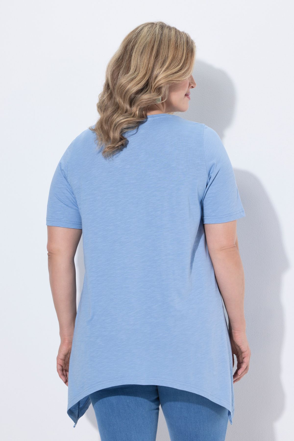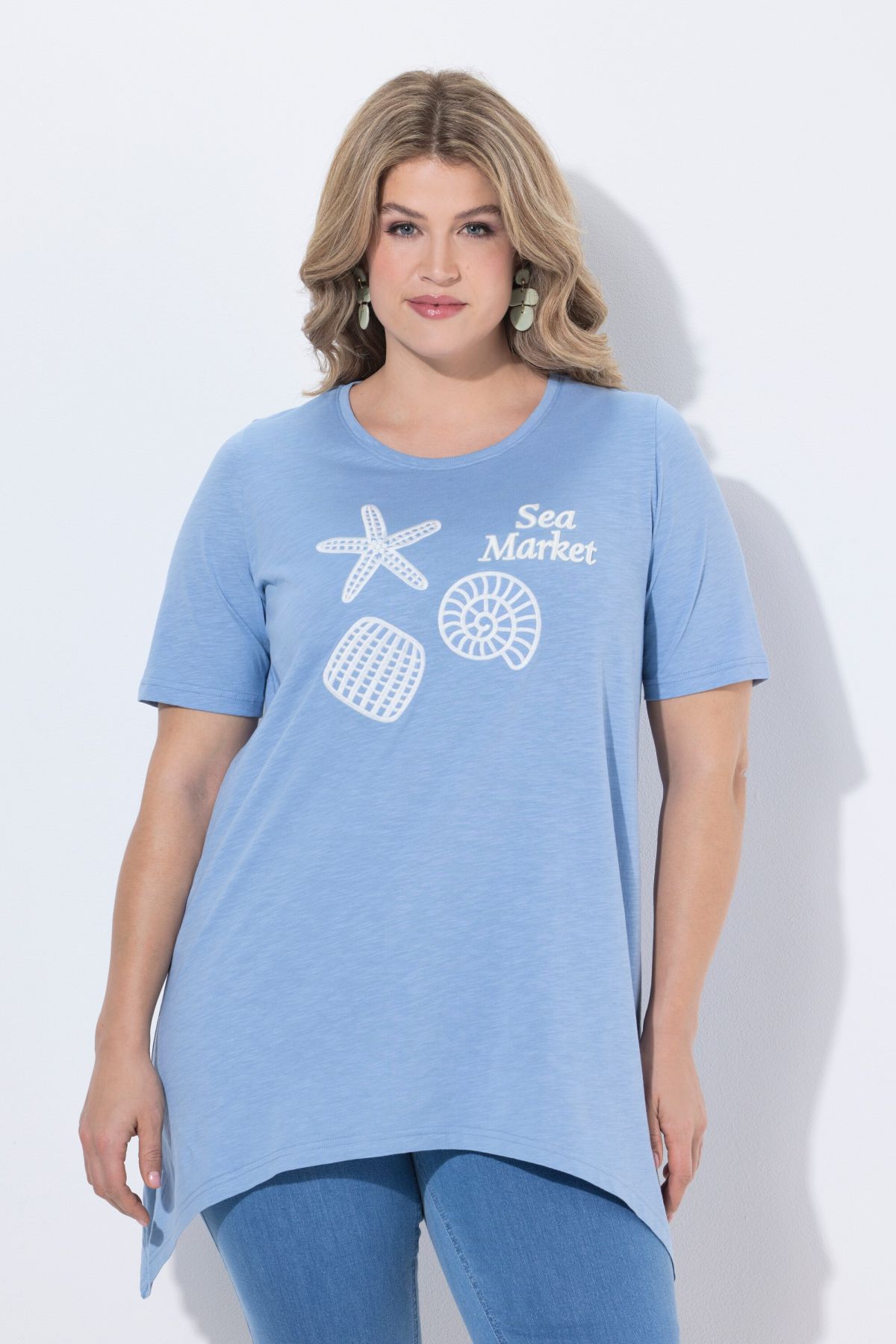 Туника с морски принт и асиметричен подгъв, придаващ изящност на визията. С кръгло деколте и къси ръкави. От прохладна памучна материя.