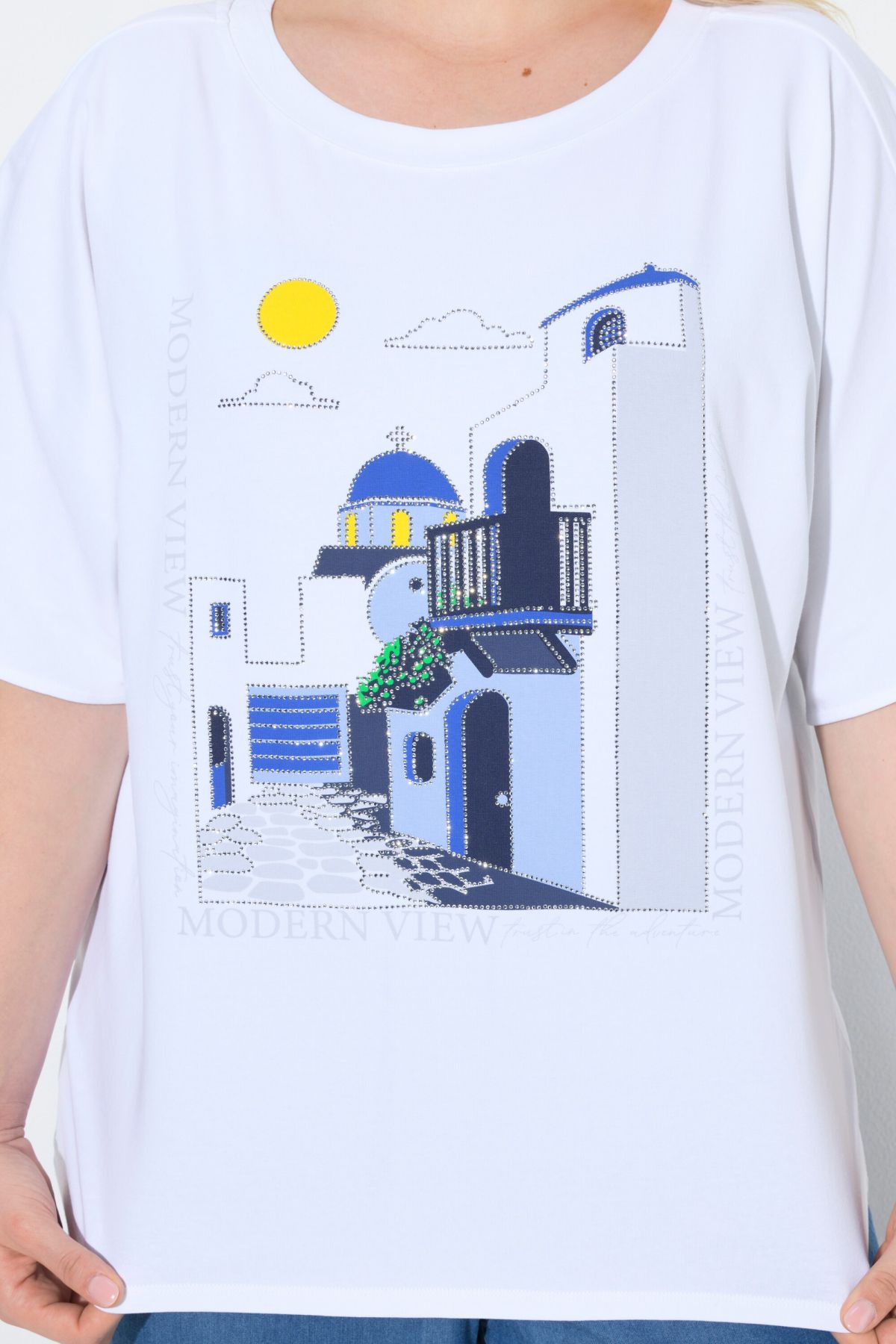 Тениска с графичен принт на Санторини с класически силует и широки къси ръкави тип камбана. С бляскави камъчета за акцент. От мека, памучна материя.
