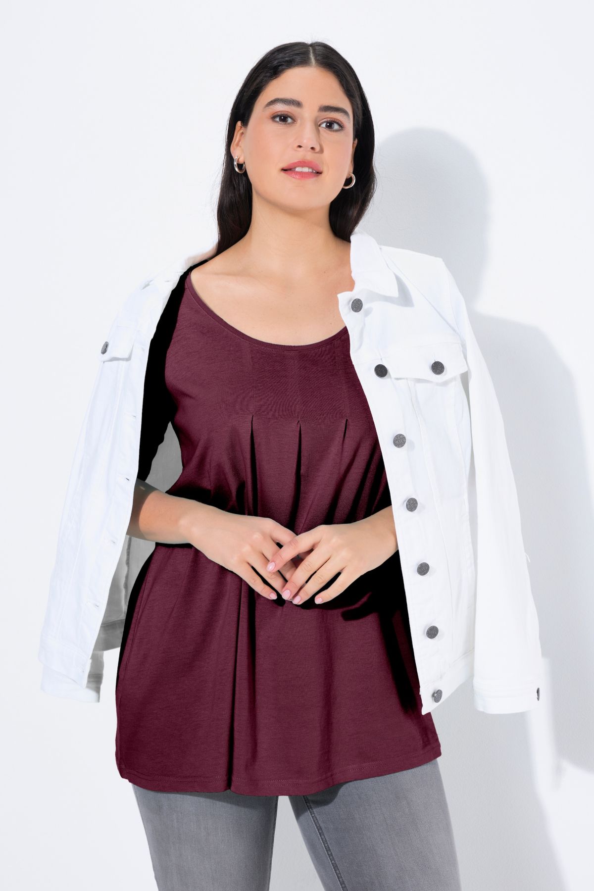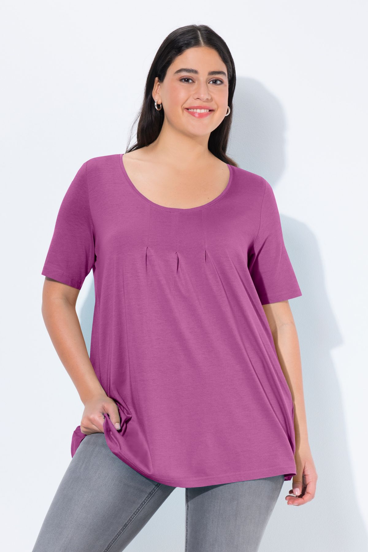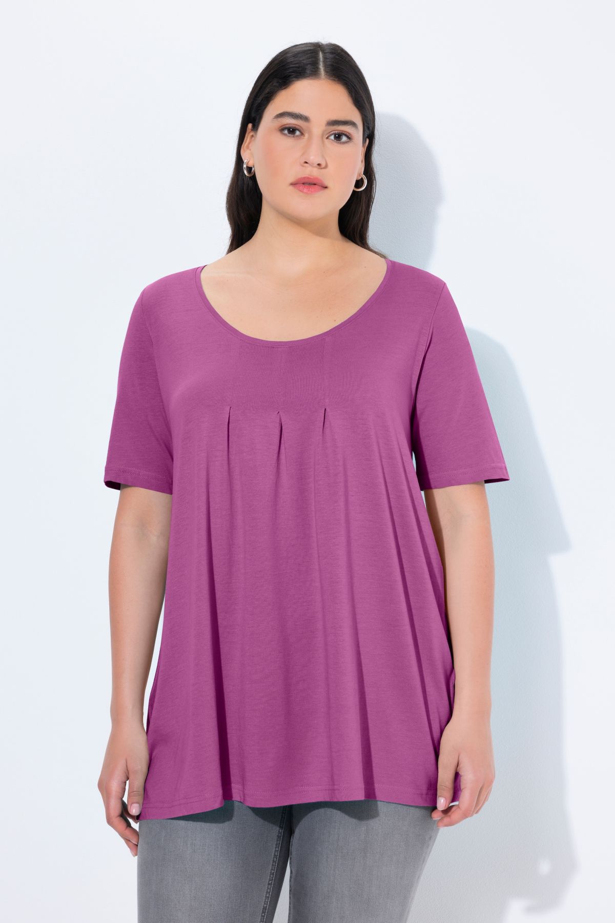 Essential Front Pleat Tee# Time to decide what colors to add to your wardrobe. Round neck, front inverted pleats, and short sleeves. A-line fit, super soft cotton/modal blend.