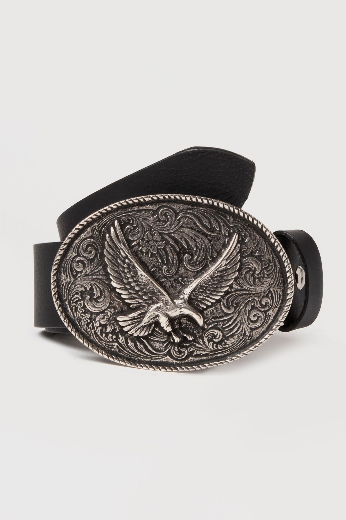 Belt made of robust real leather with an eagle-shaped buckle. Width approx. 1½ . Raw-edged, easy to shorten.
