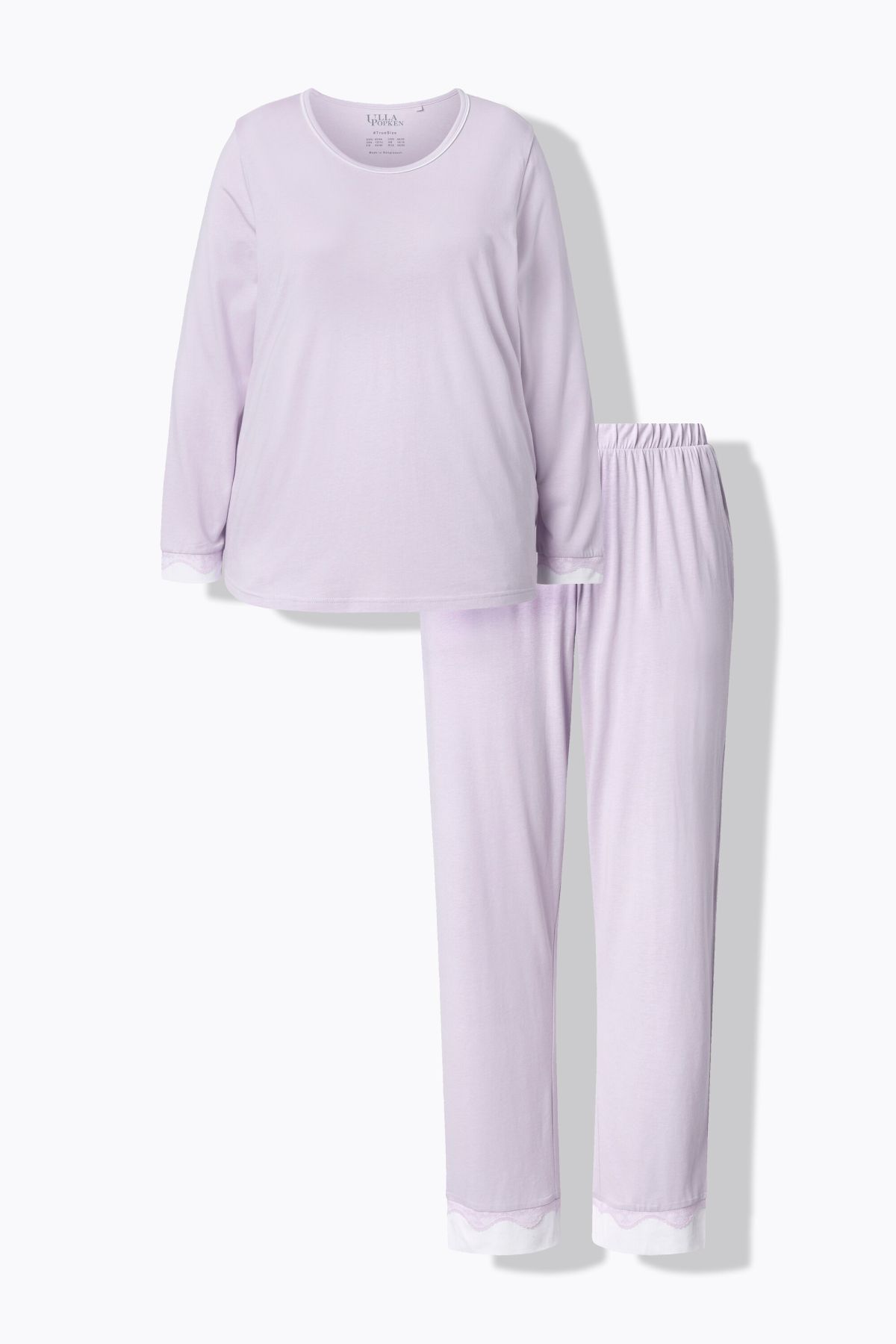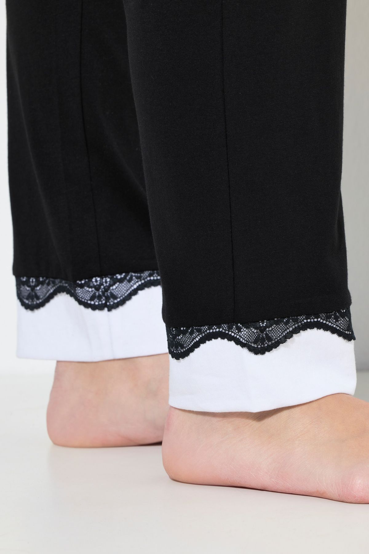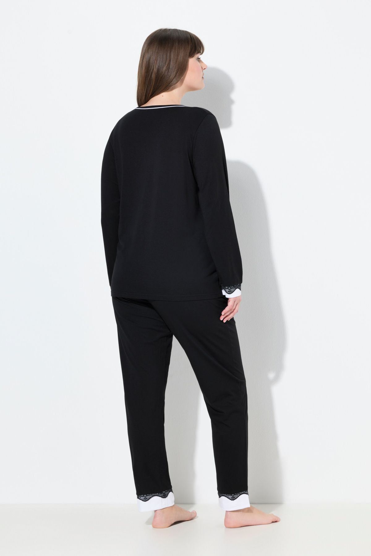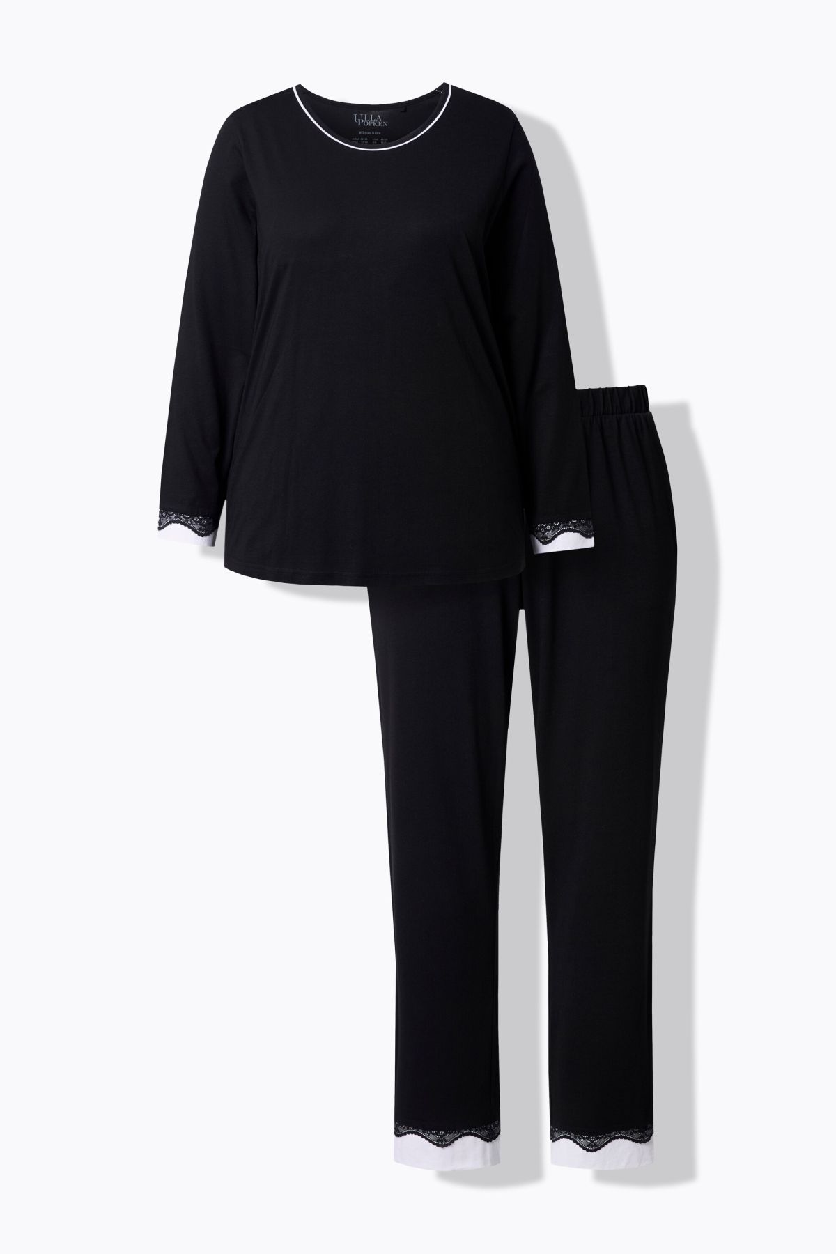 Lace Hem Super Soft Knit Pajama Set# the white insets on the hems highlight the black lace. Top with contrast piping round neck and long sleeves. solid elastic waist bottoms with side pockets. Slim leg.