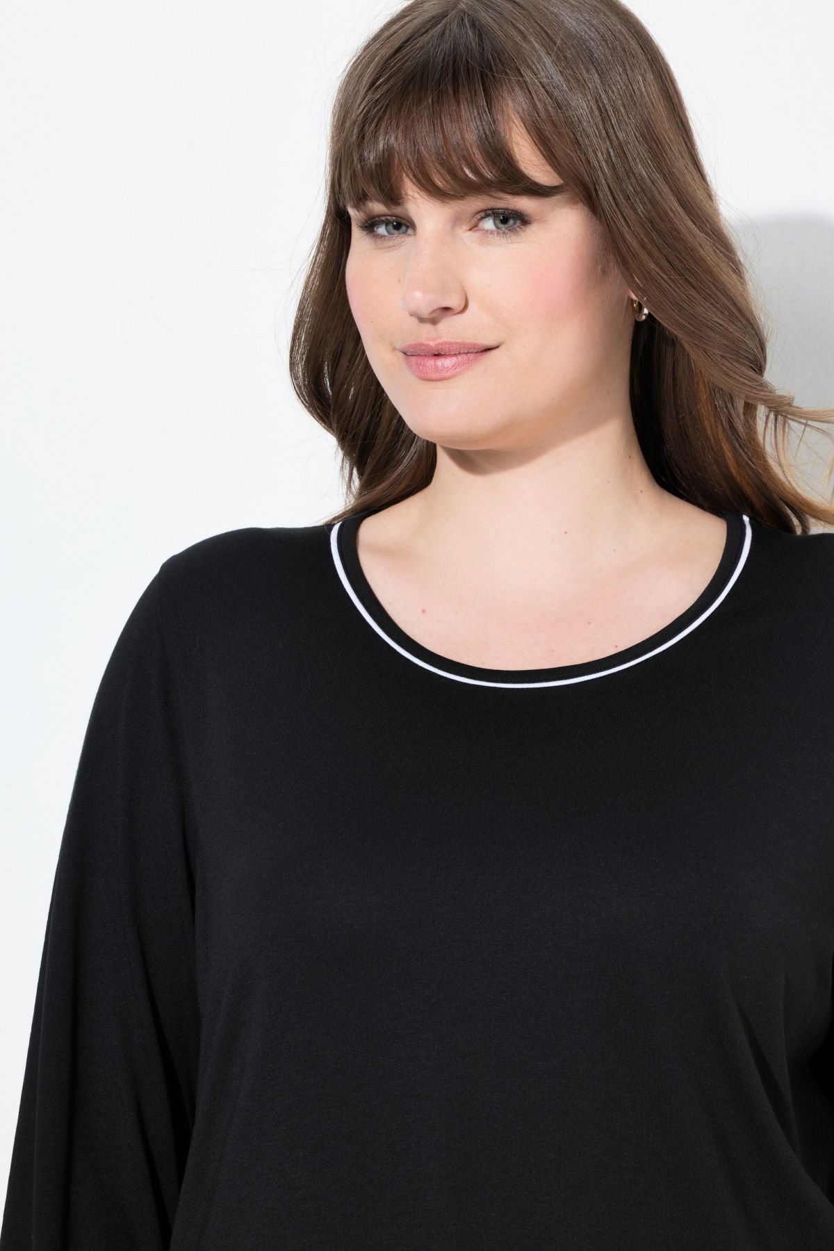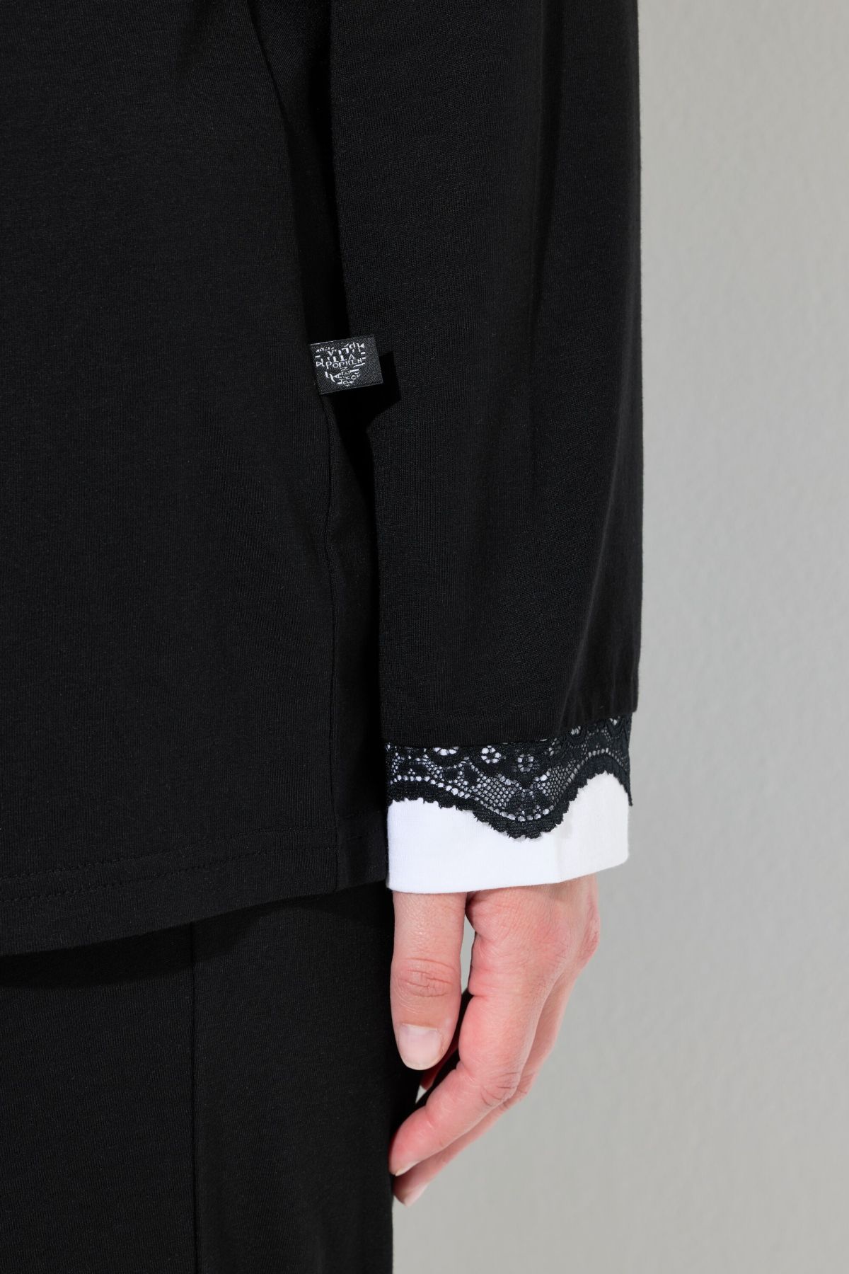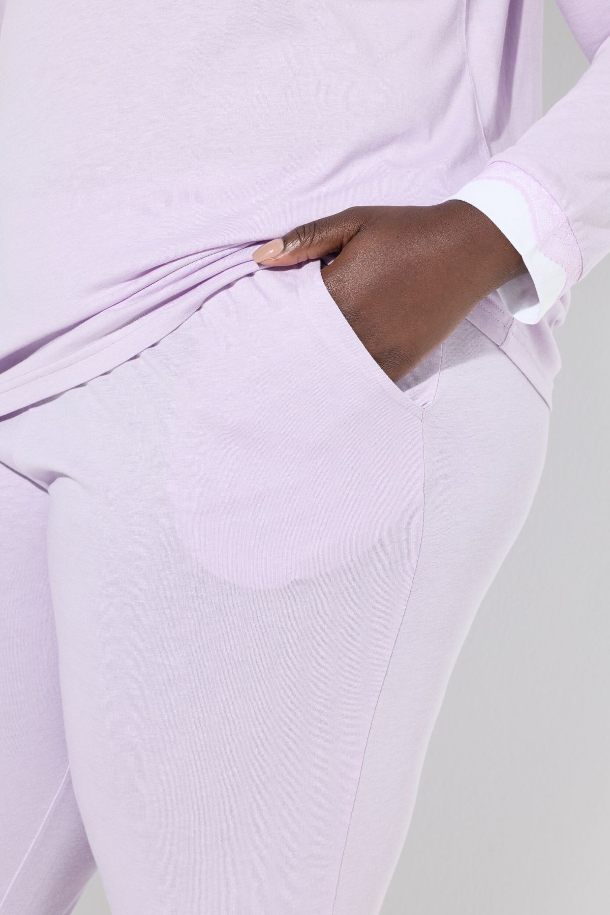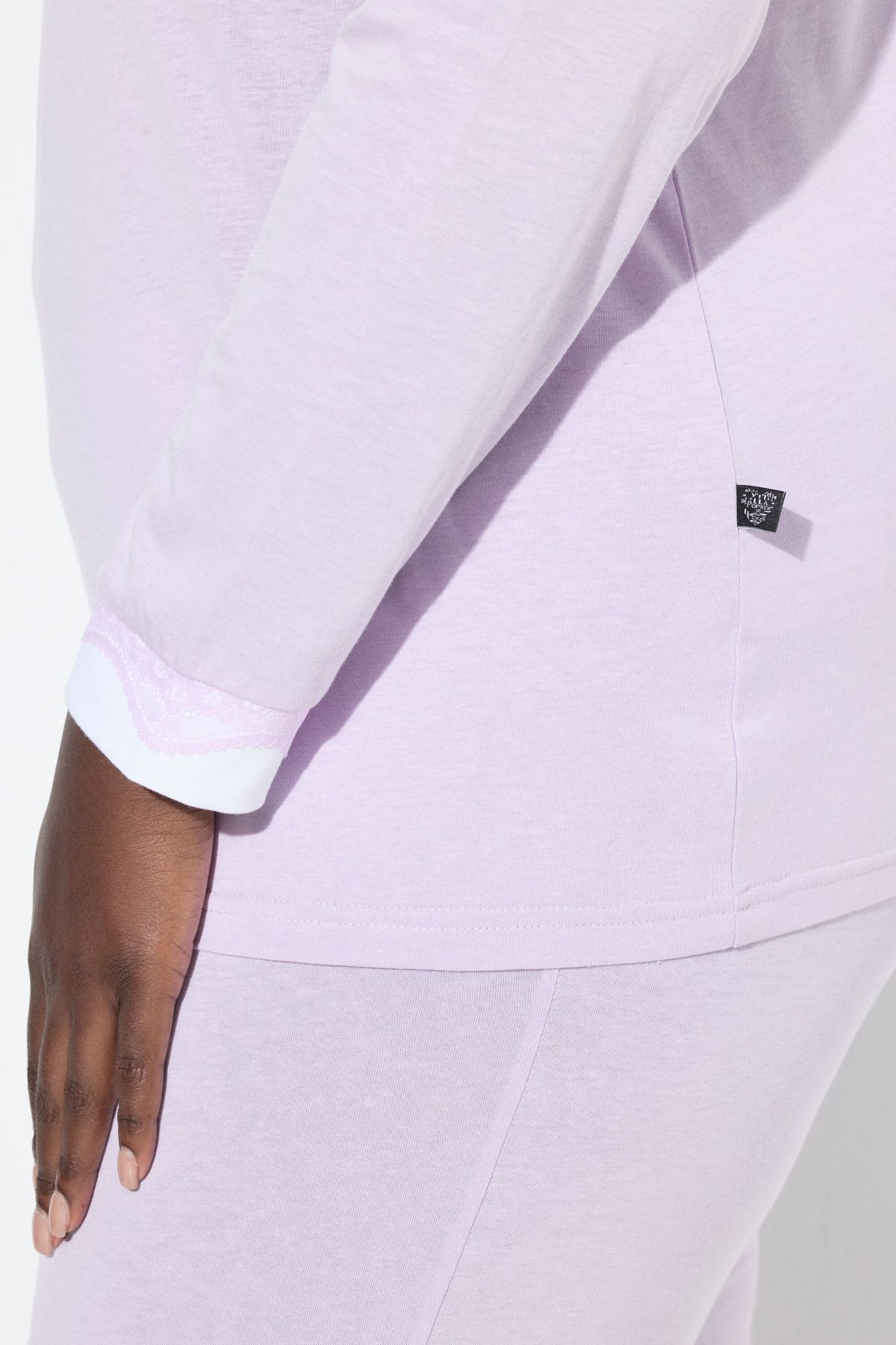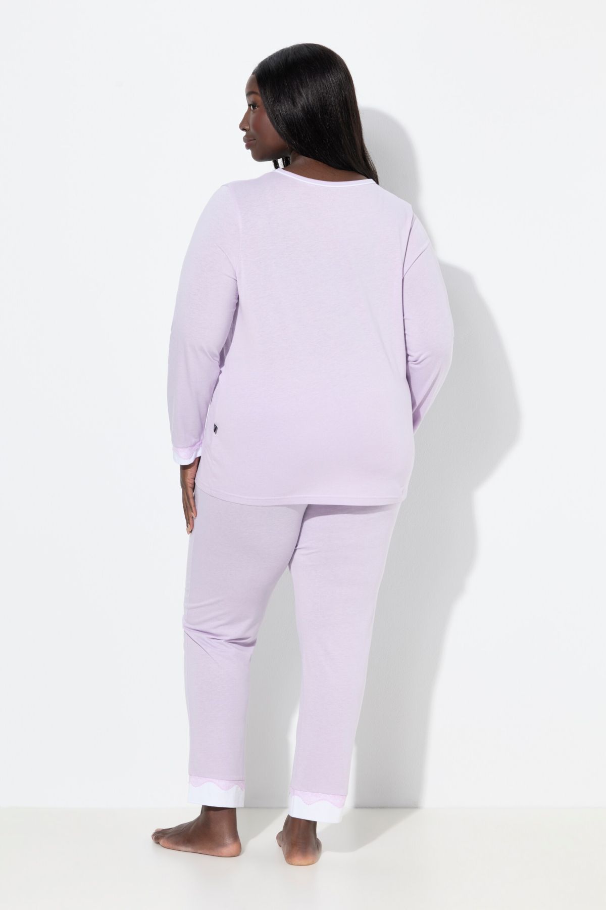 Lace Hem Super Soft Knit Pajama Set# the white insets on the hems highlight the black lace. Top with contrast piping round neck and long sleeves. solid elastic waist bottoms with side pockets. Slim leg.