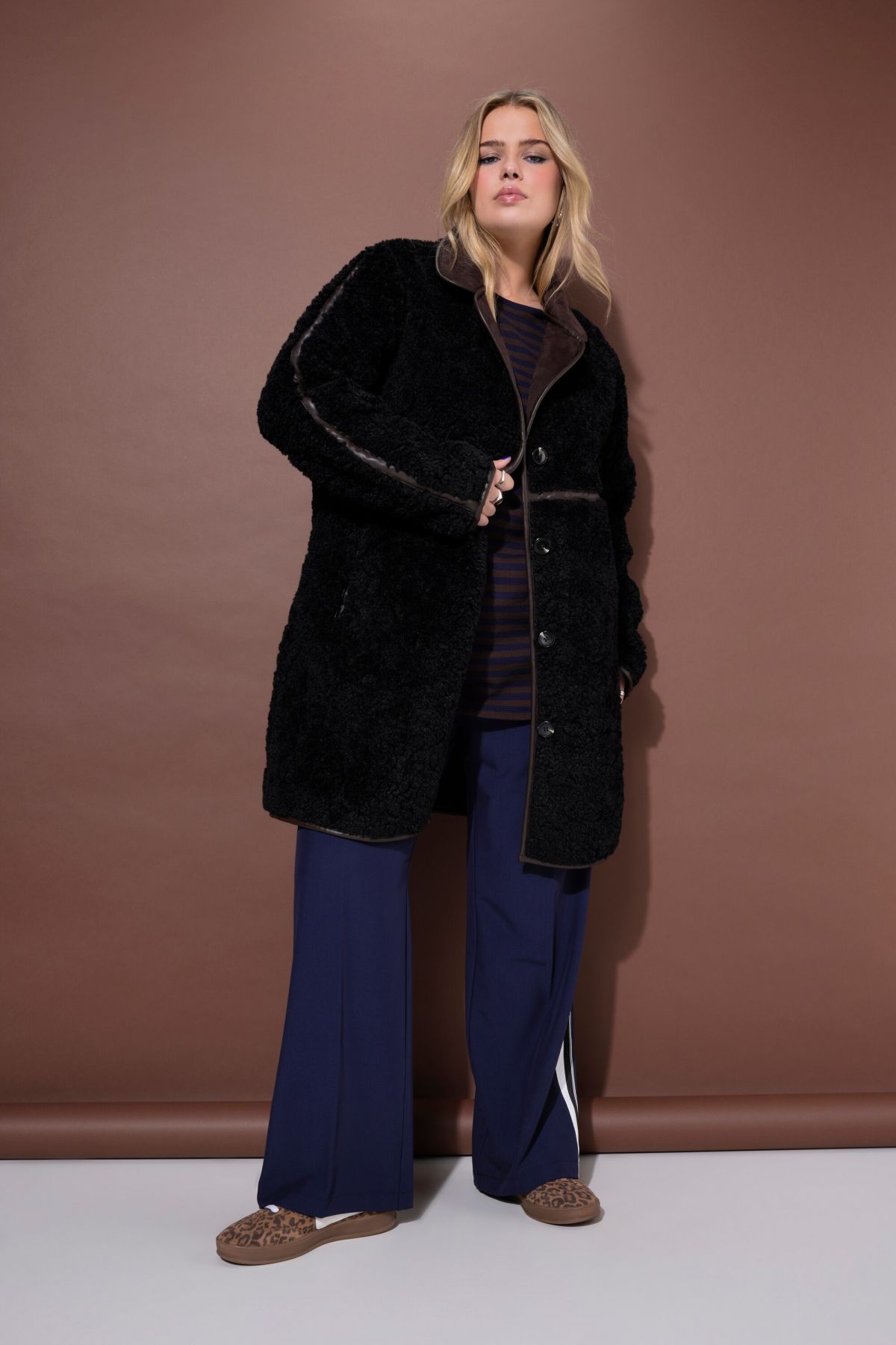 Faux Fur Coat - A cozy, oversized silhouette with decorative seams for a retro vibe.