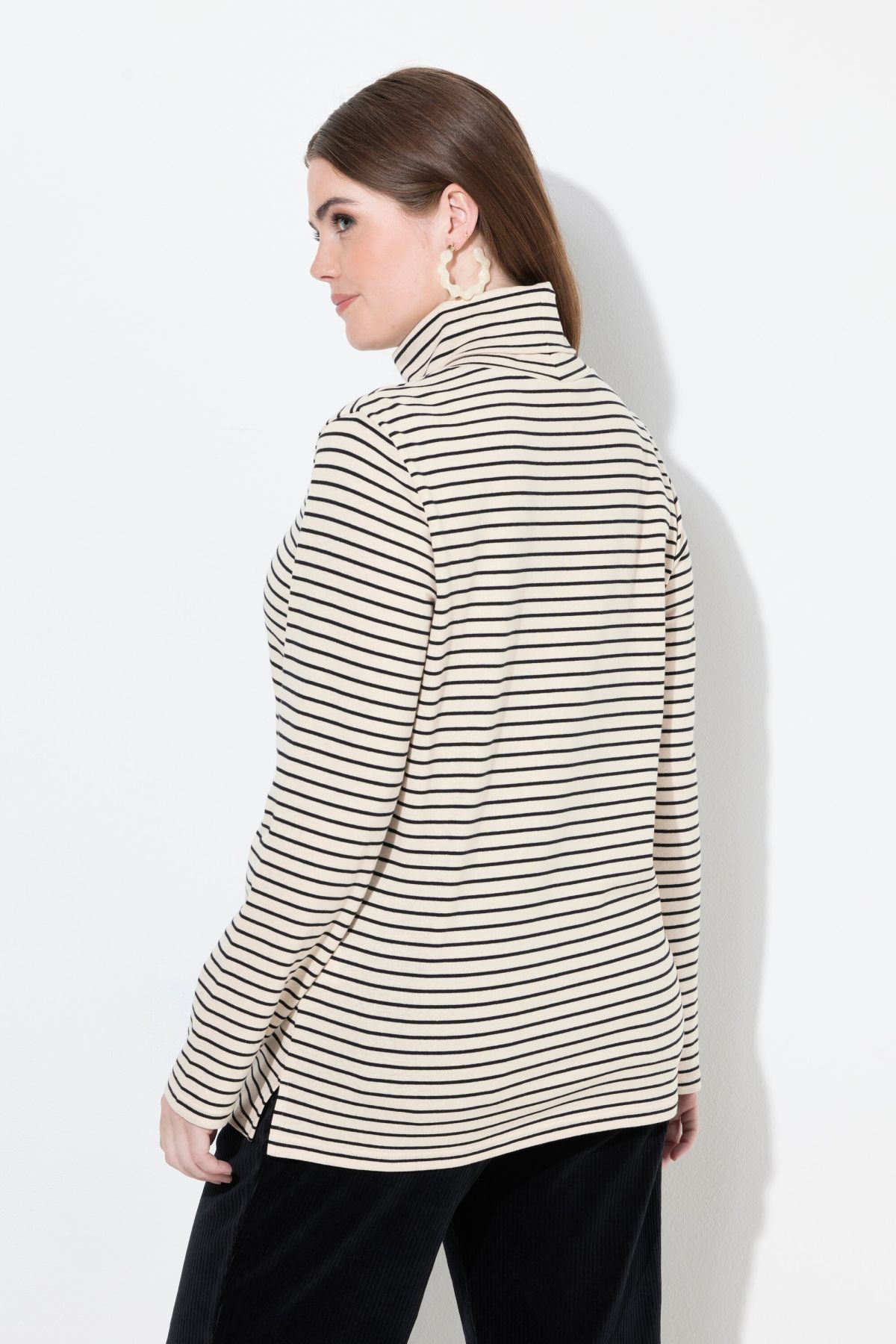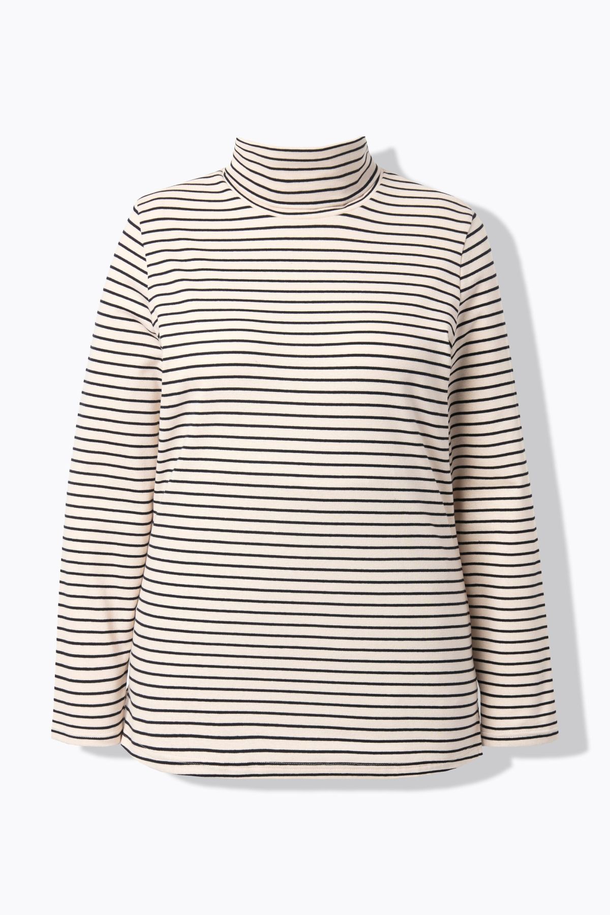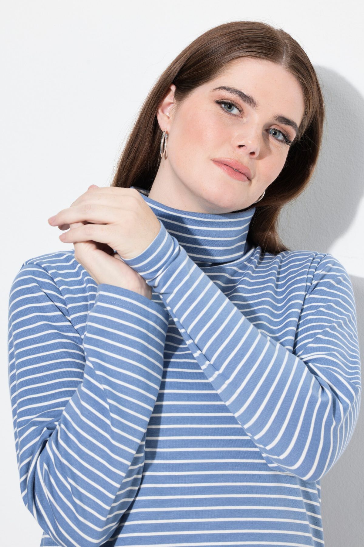 Eco Cotton Stripe Rib Knit Turtleneck - a comfortable classic that never goes out of style. Turtleneck and long sleeves. Body hugging slim fit.