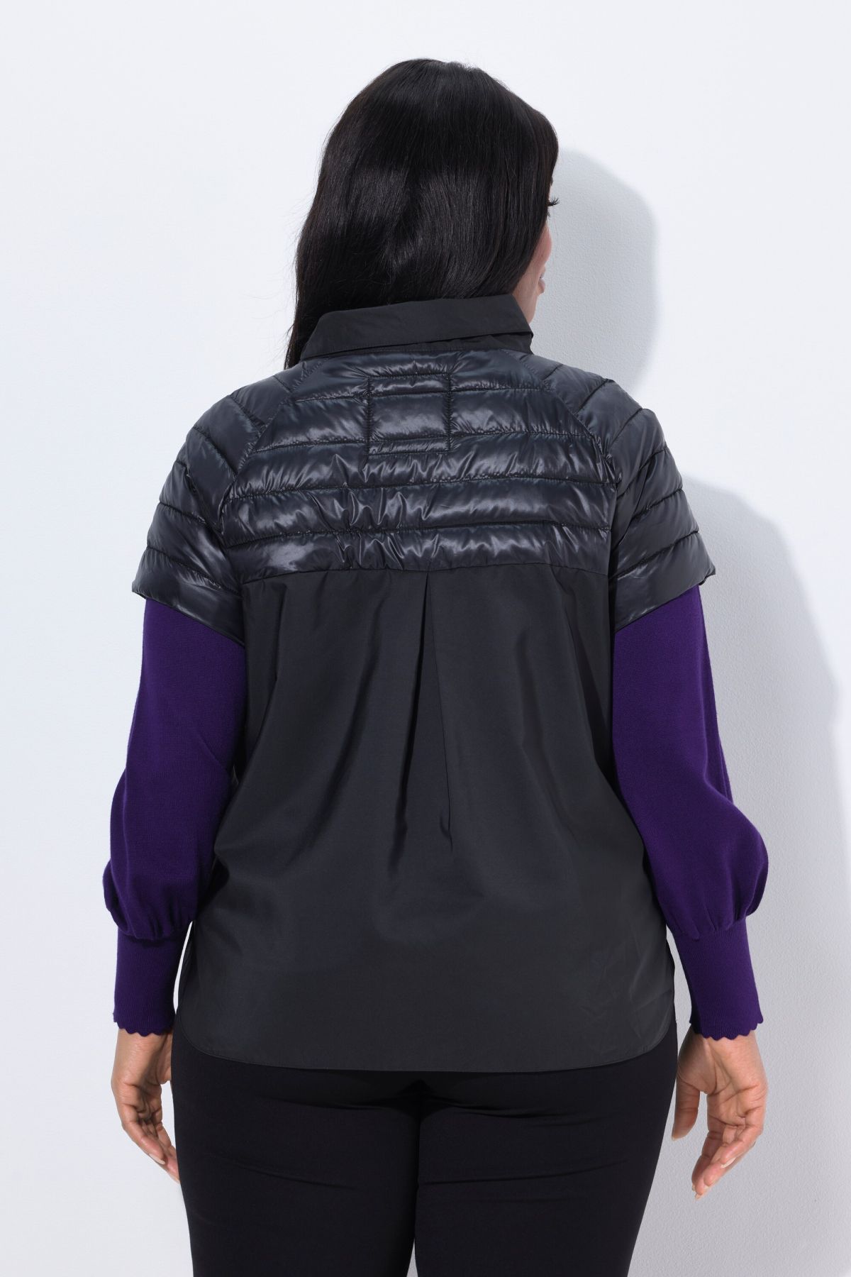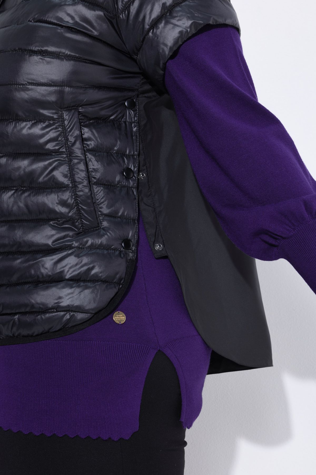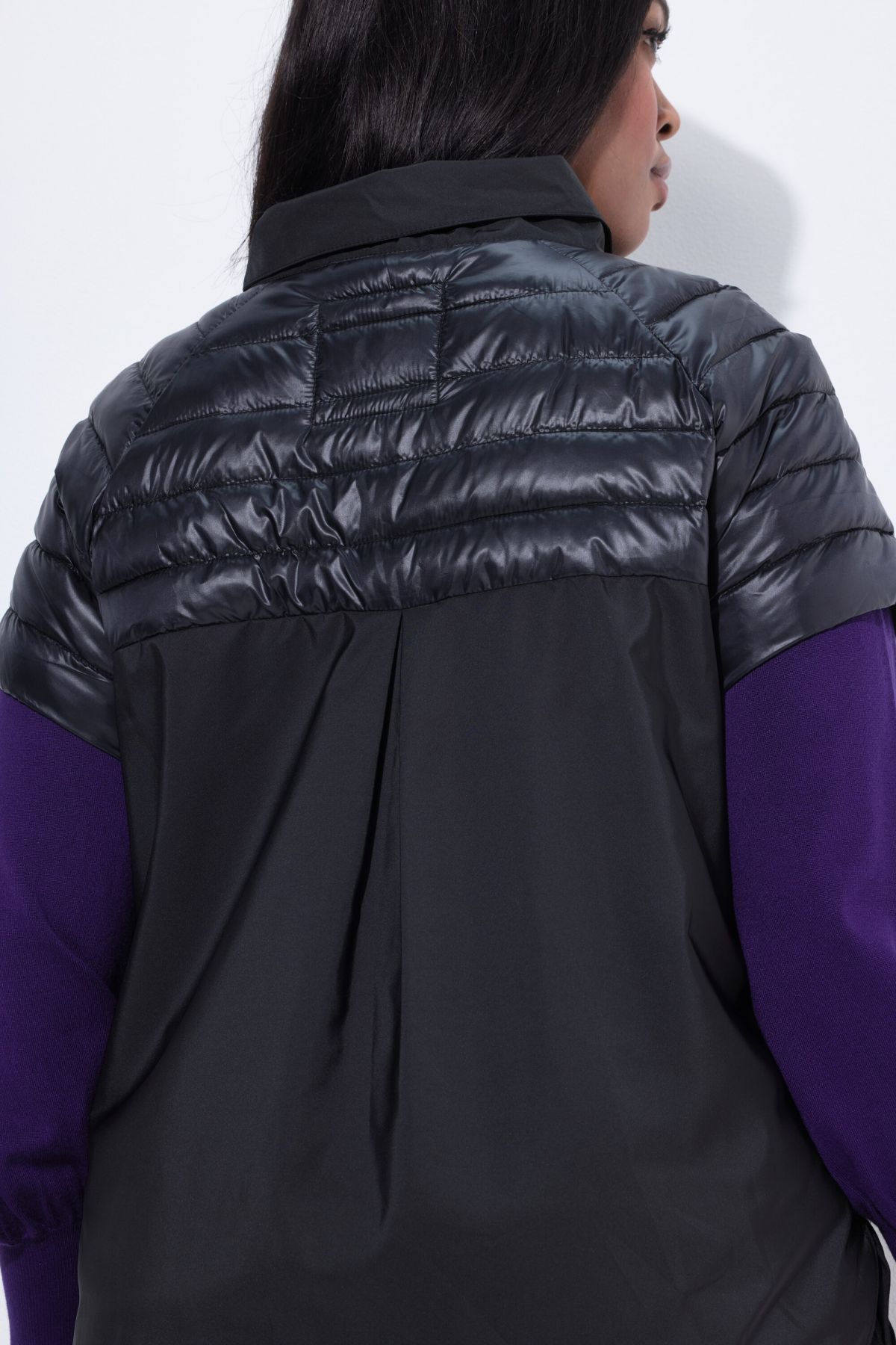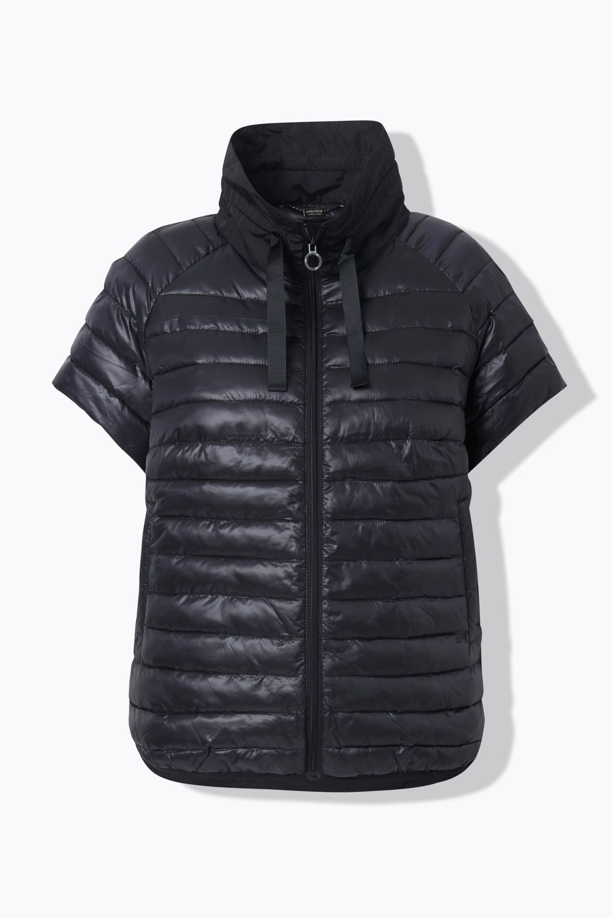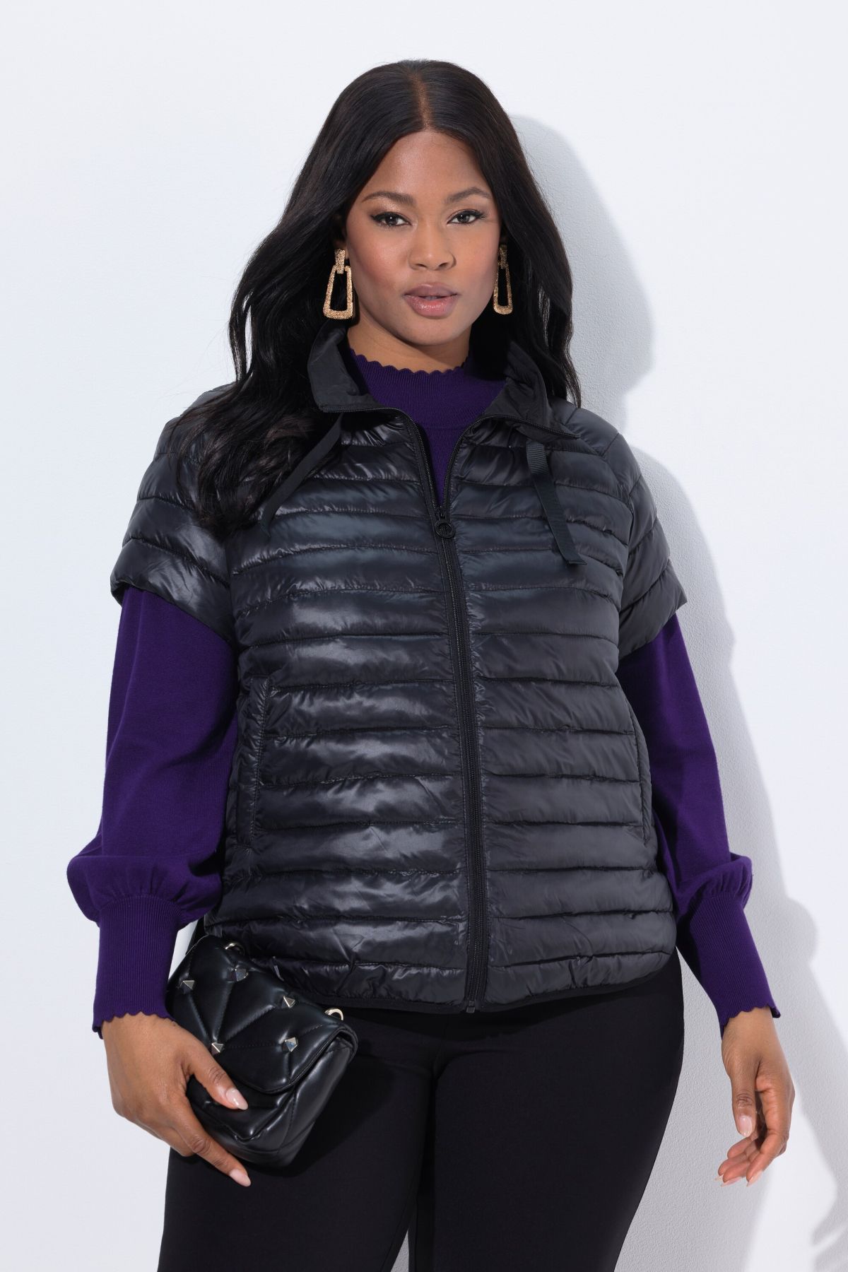 Cap Sleeve Quilted Vest - the warmth of a puffy jacket but much more chic. Stand-up collar with tie, short cup sleeves, zipper closure, side pockets, side slits with snap buttons.