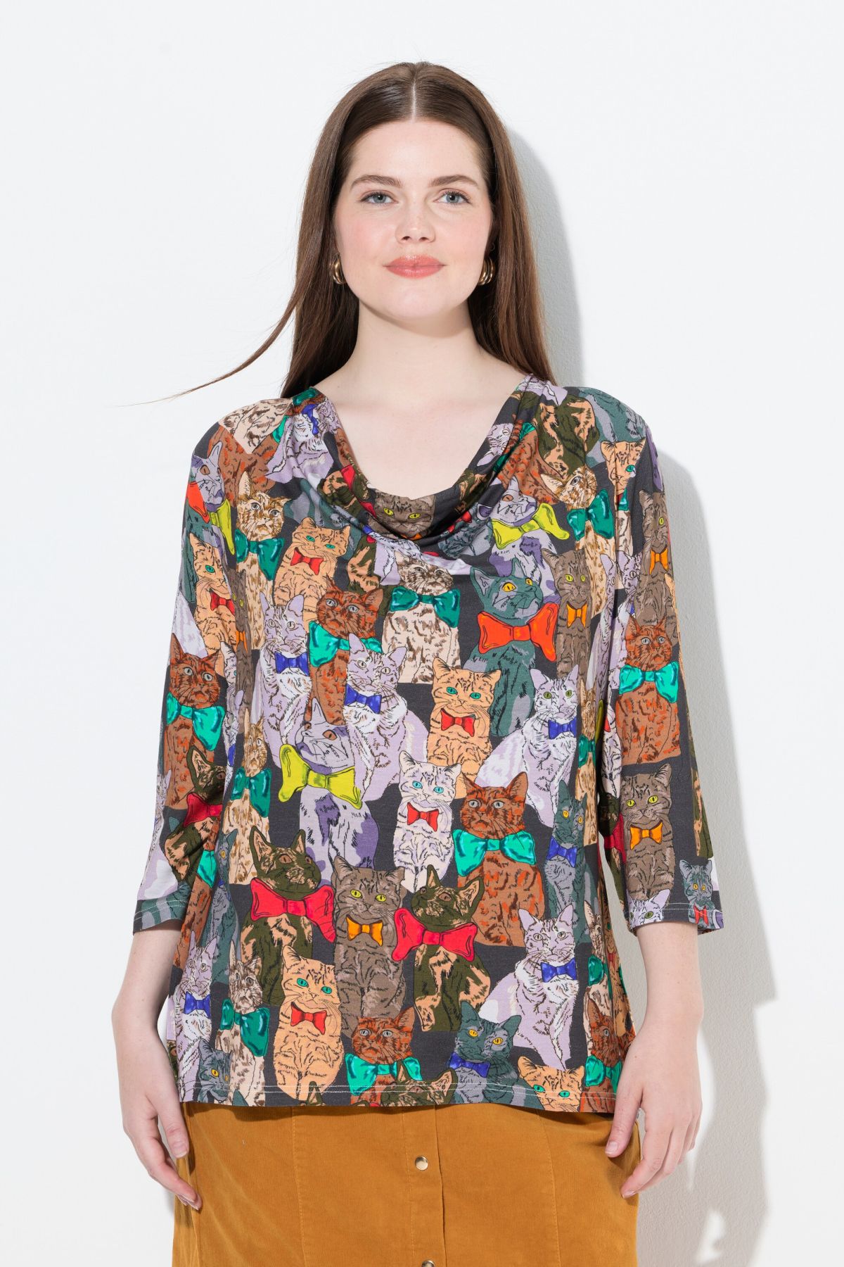 Dog Print Tee - An elegant waterfall collar adds a touch of elegance to this playful print.