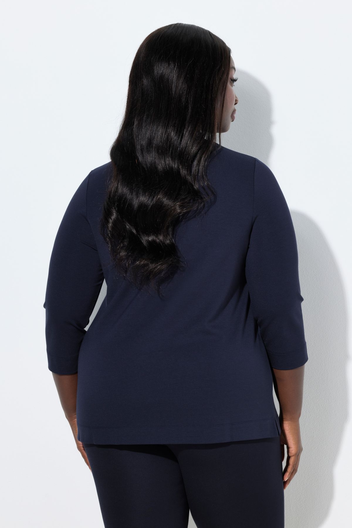 Split Neckline Tee - A bold notched, split neckline adds elegant drama to this classic 3/4 sleeve look.