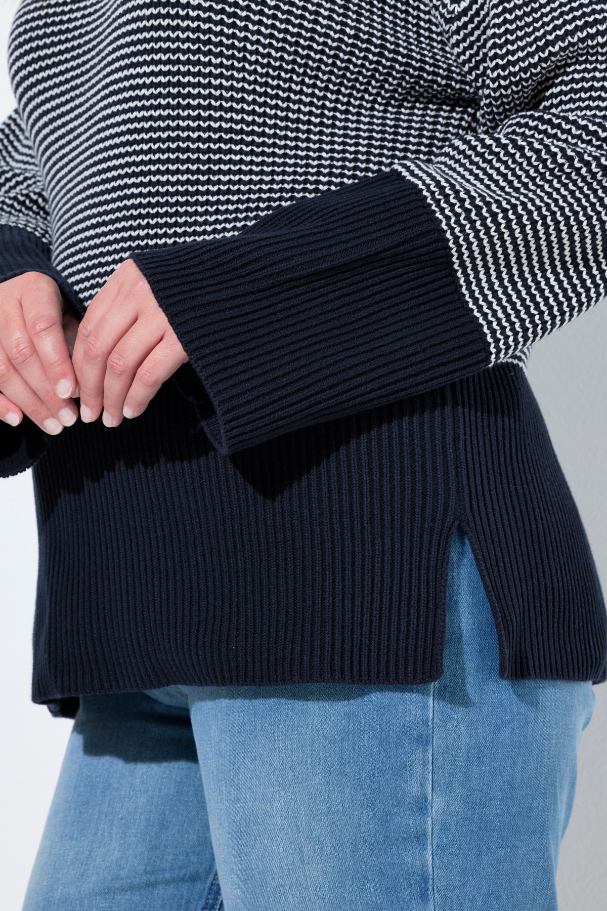 Фин райет модел с широк оребрен подгъв, кръгло деколте, удобна кройка със странични цепки, дълги ръкави, устойчив органичен памук, дължина, регулирана по размер, приблизително 64-72 см.
