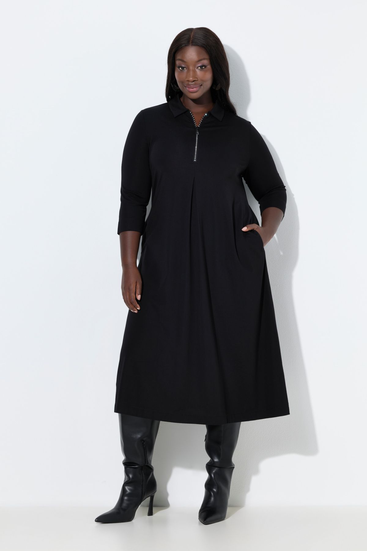 Блестящ декоративен цип, класическа визия с яка на риза, удобна А-линия с декоративни плисета, 3/4 ръкави с цепка, висококачествено еластично трико Punto di Roma, дължина около 120 см.