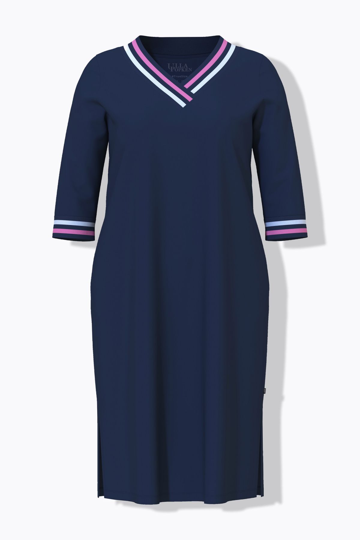 Sporty Stripe Trim V-Neck Nightgown - sporty and comfortable cotton knit design fashioned with stripe rib knit trim on the crossover V-neck and 3/4 sleeve cuffs. Side vents.