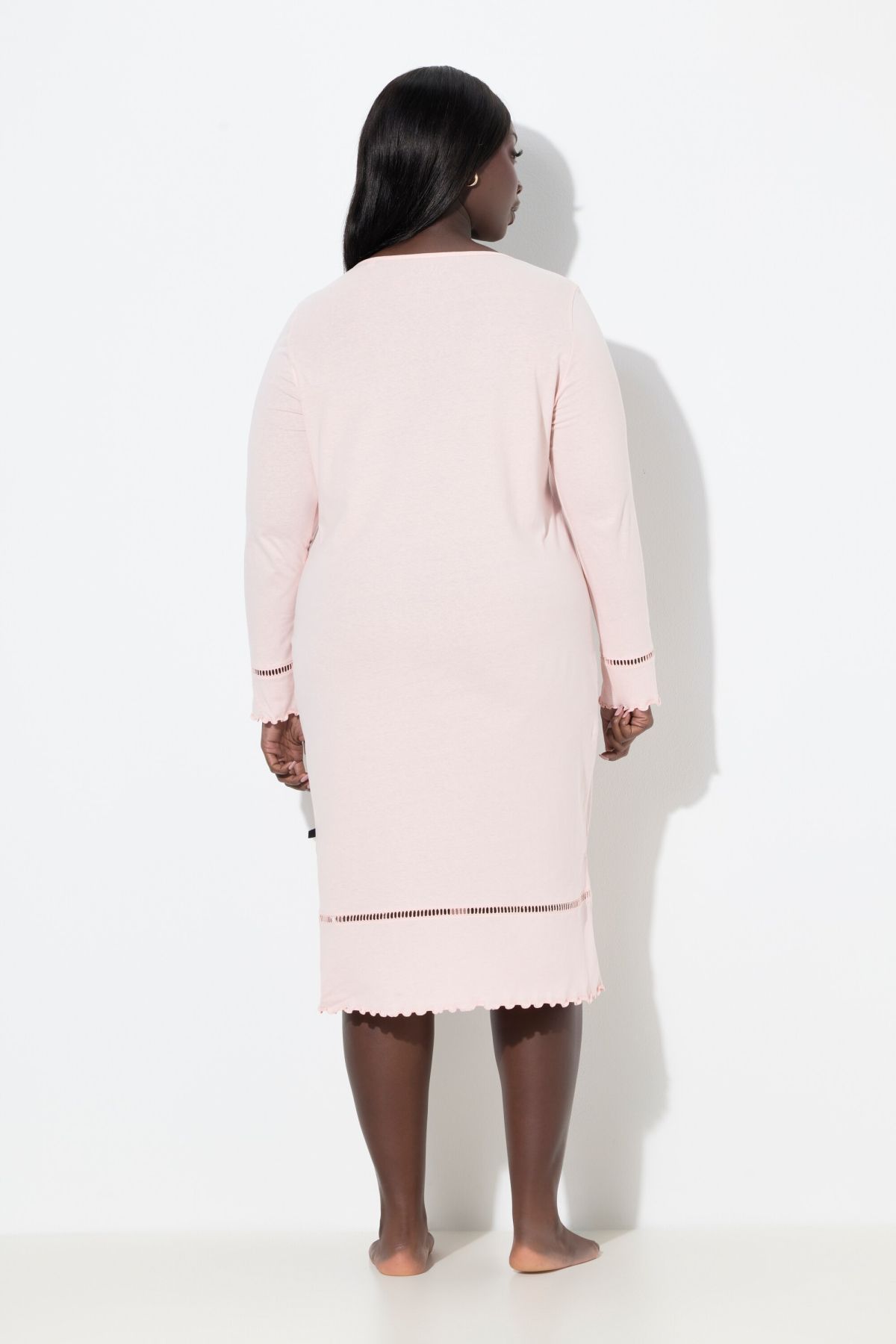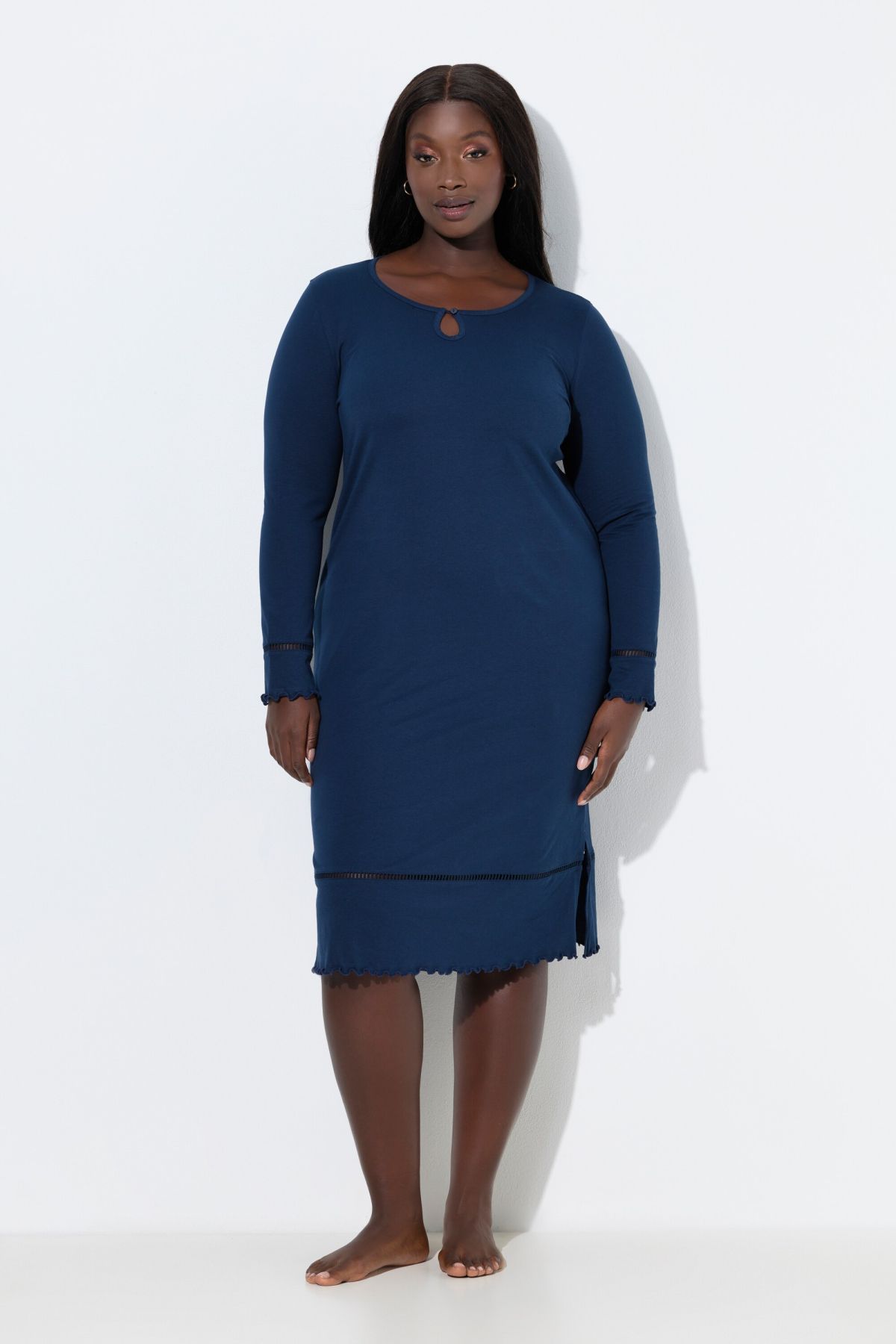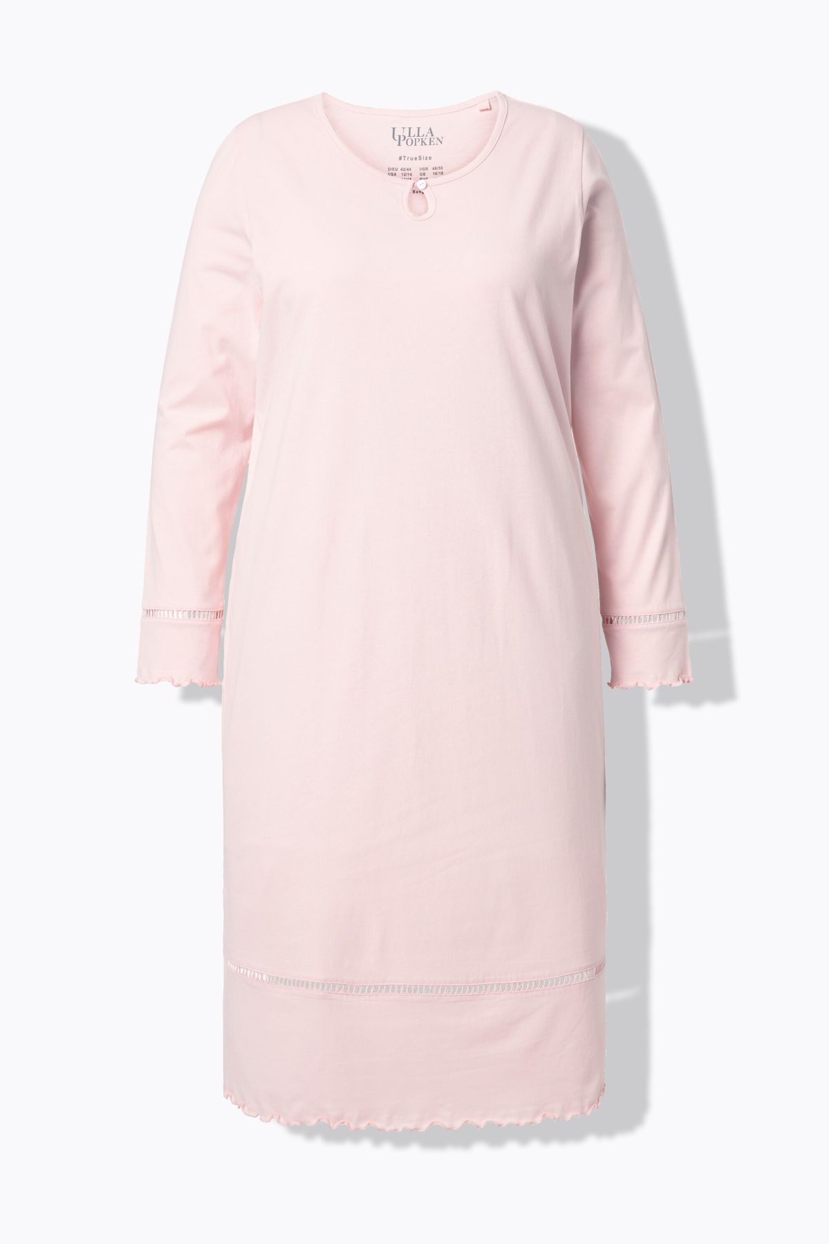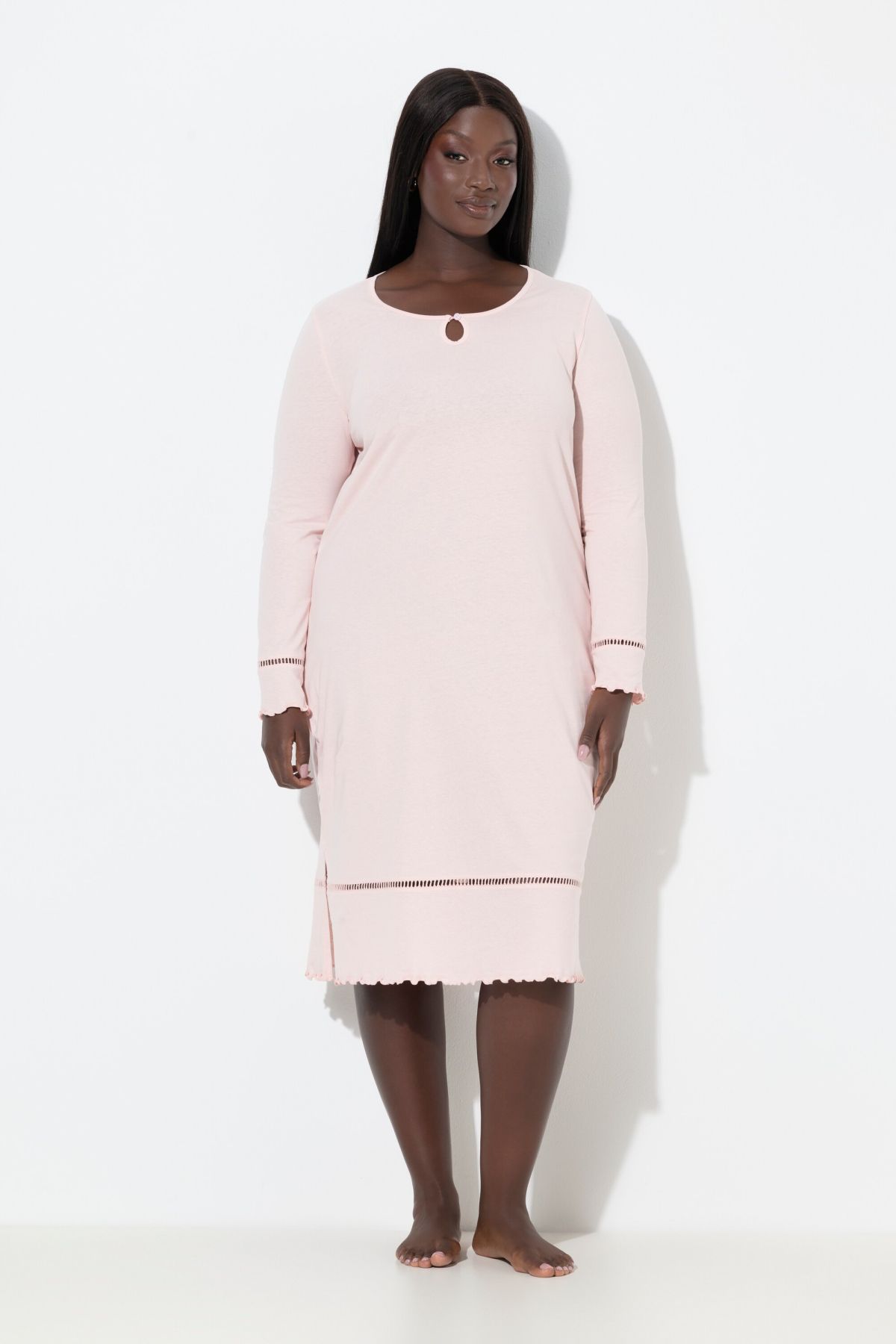 Ladder Lace Trim Lettuce Edge Nightgown# you'll love this perfectly dreamy style with ladder lace trim and lettuce edges on the long sleeves and bottom hems. Round neck, small keyhole with button-and-loop closure, and side vents.