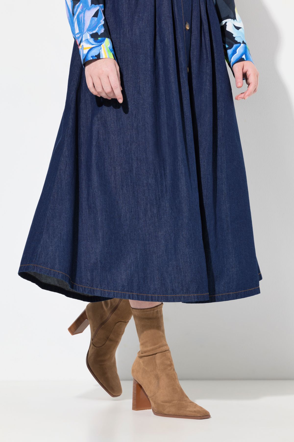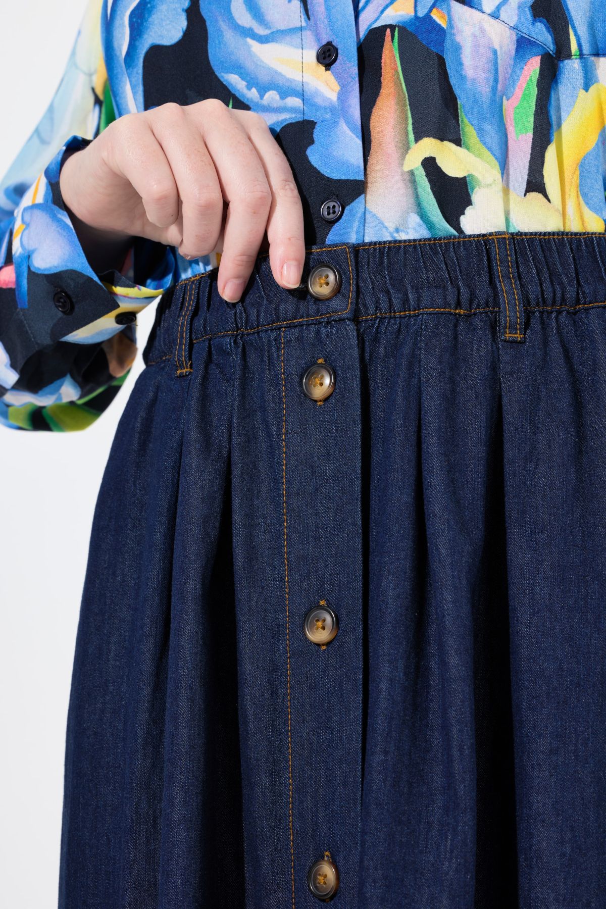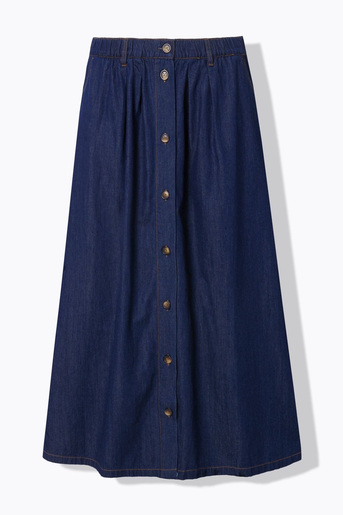Button Front Denim Skirt - get that perfect classic silhouette with this voluminous A-line skirt. Comfortable elastic waistband, decorative jeweled button placket, side seam pockets.