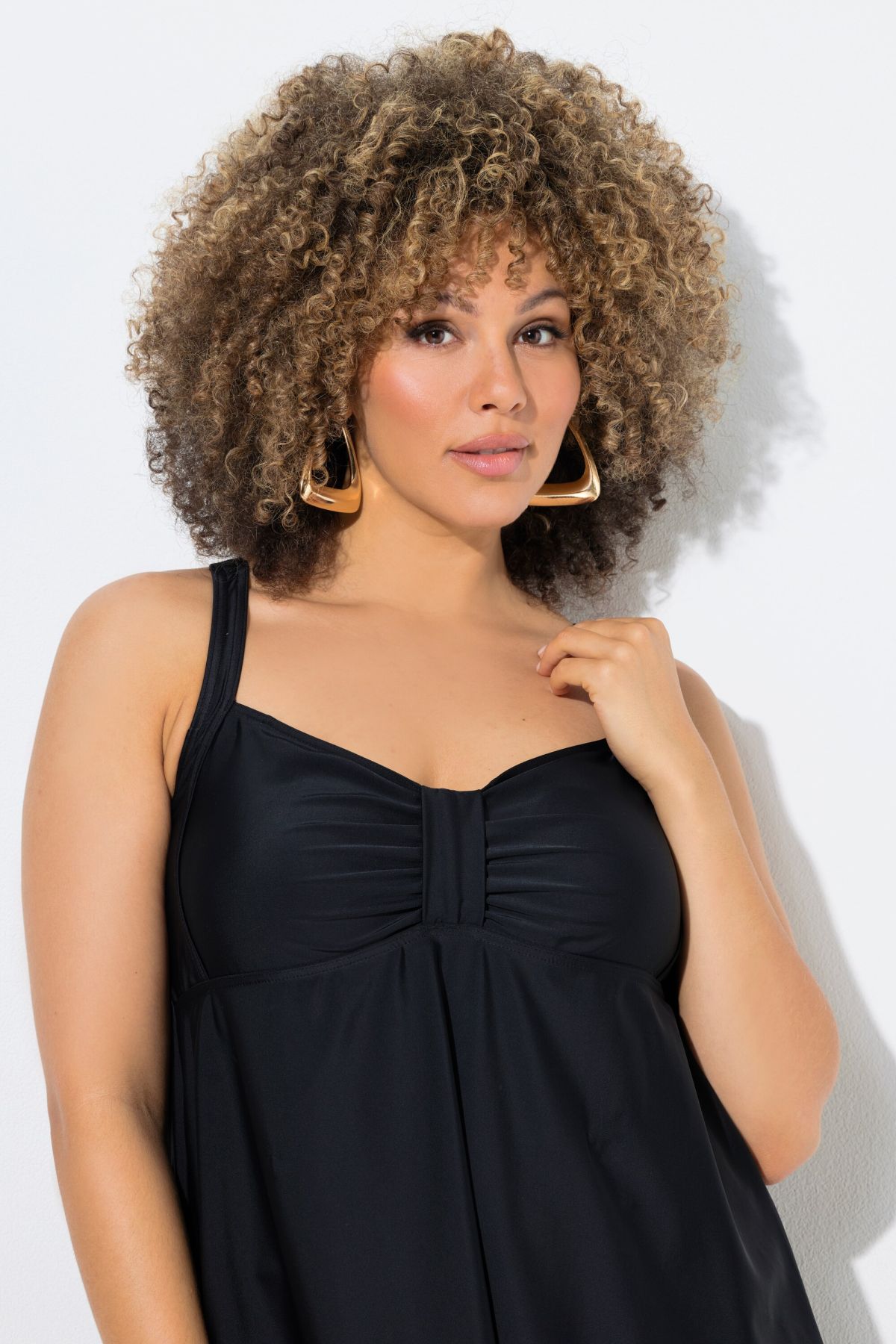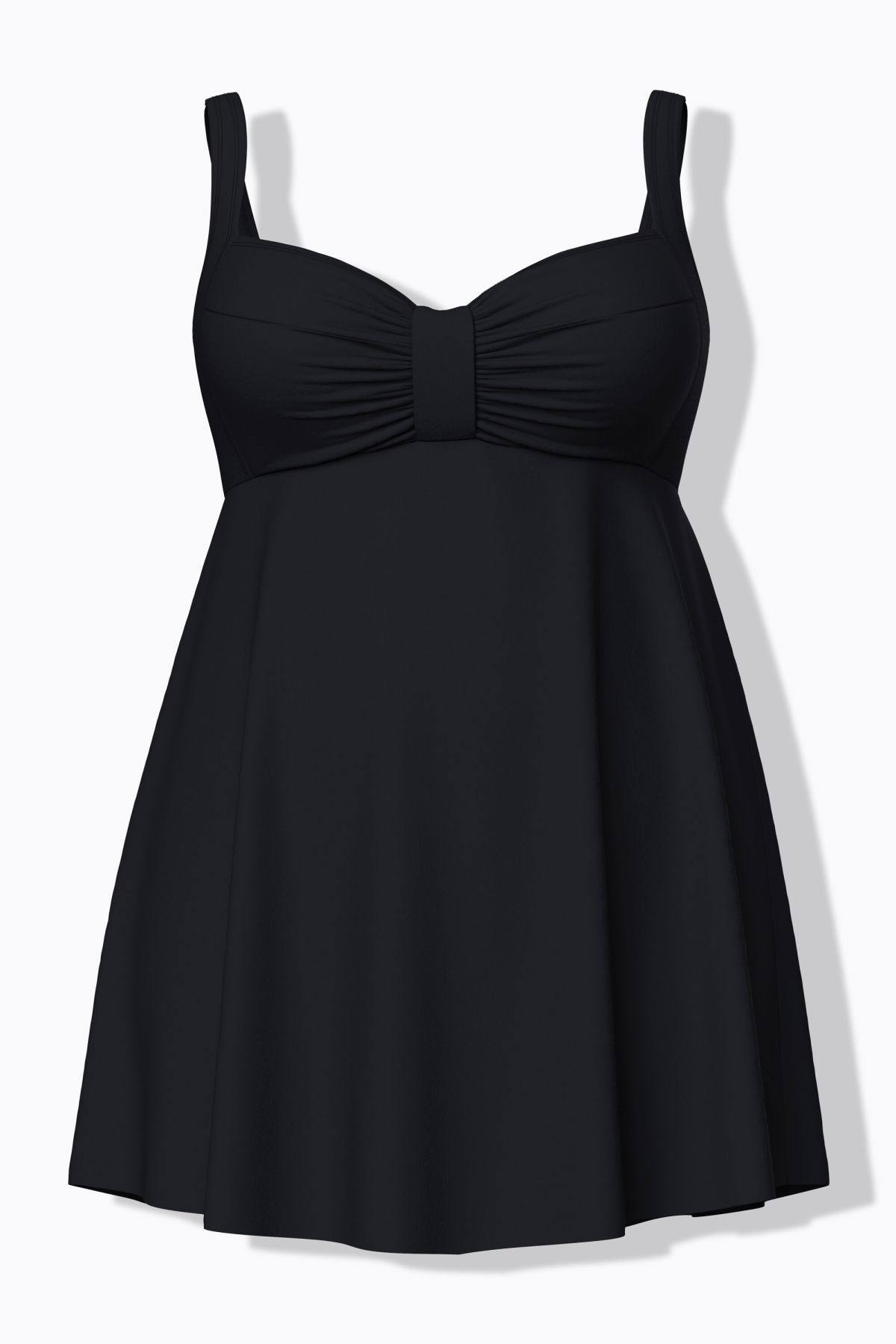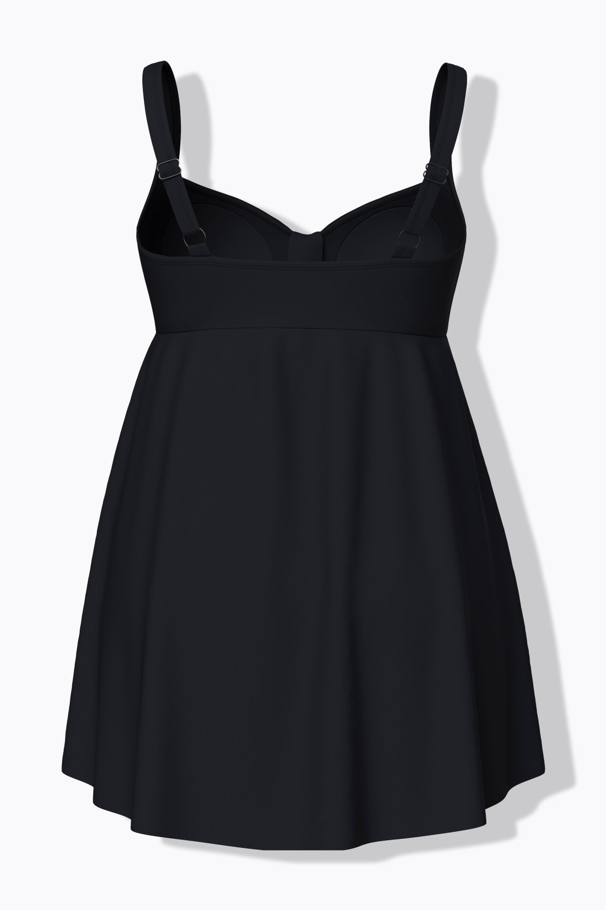 Flared Swim Dress With a decorative band at the bust for a ruched effect.