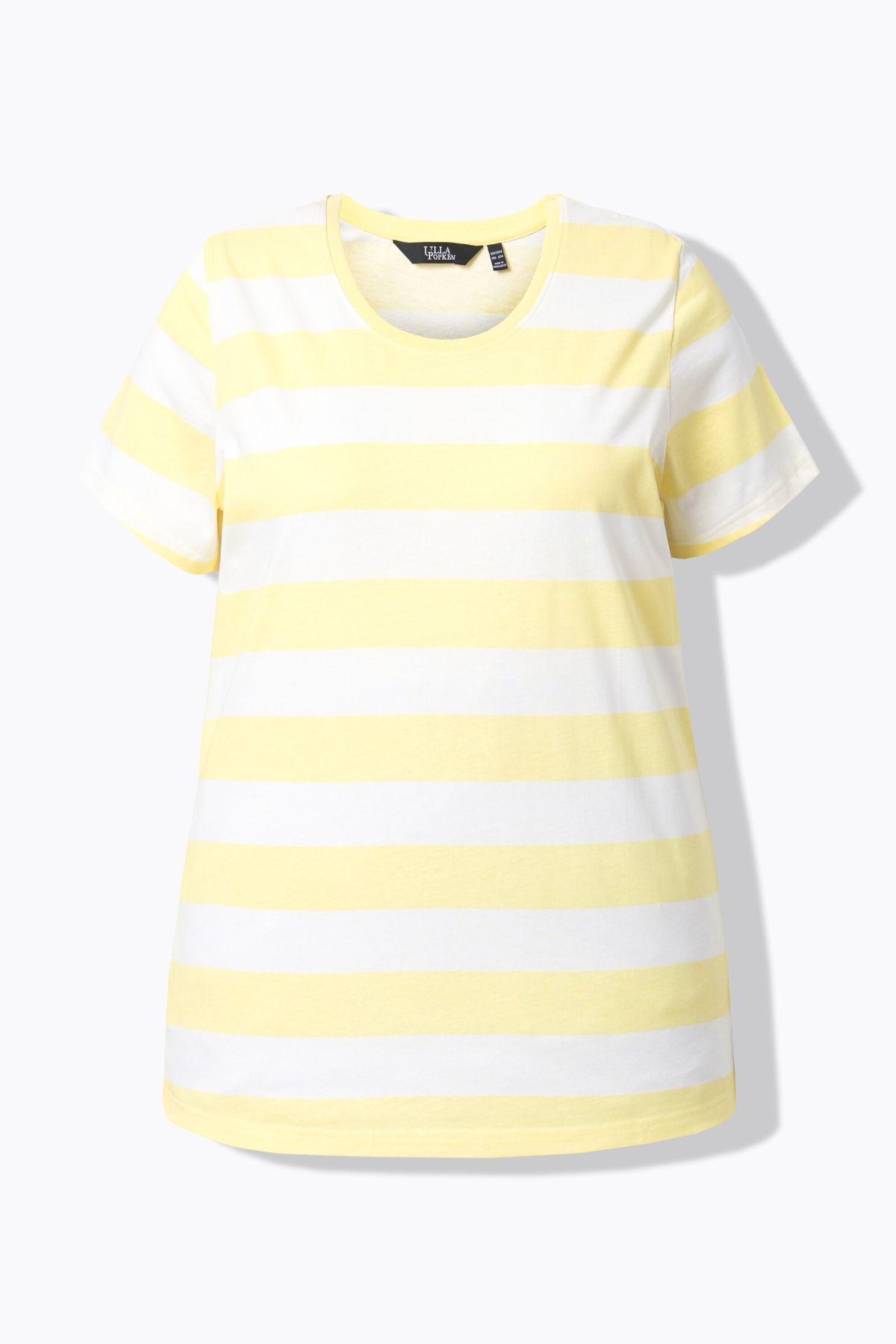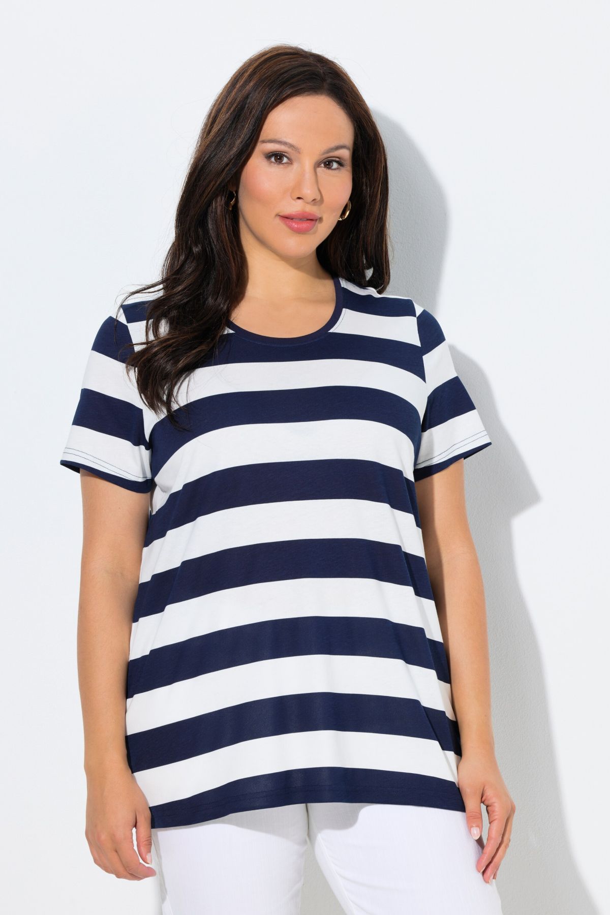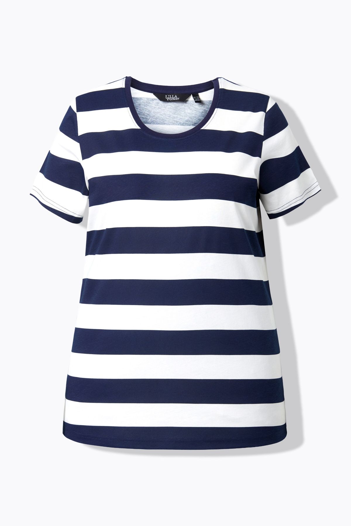 Широк раиран модел, кръгло деколте, класическа кройка, половин ръкав, естествен памук с еластан, дължина, регулирана по размер, приблизително 68-76 см.