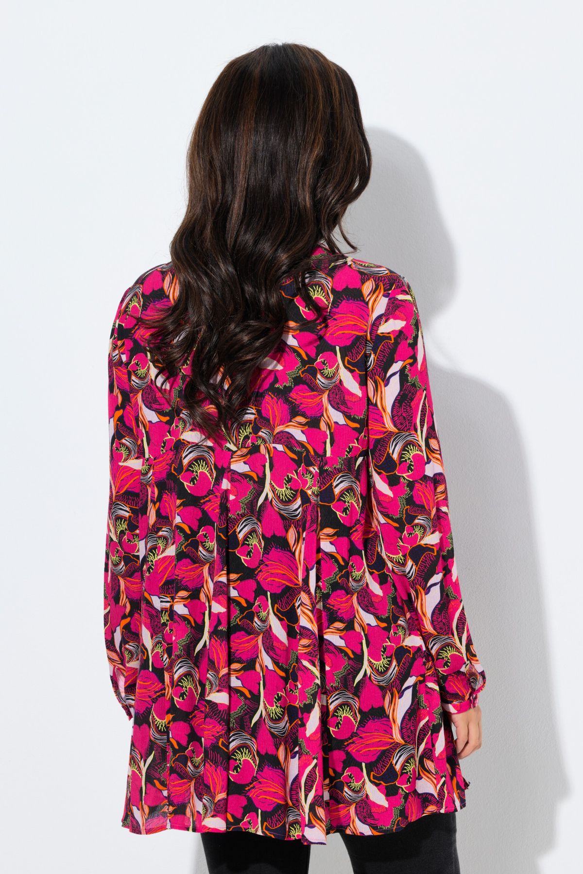 Floral Godet Pleated Tunic With wide godet pleats and a curved cross seam for a full flared shape.