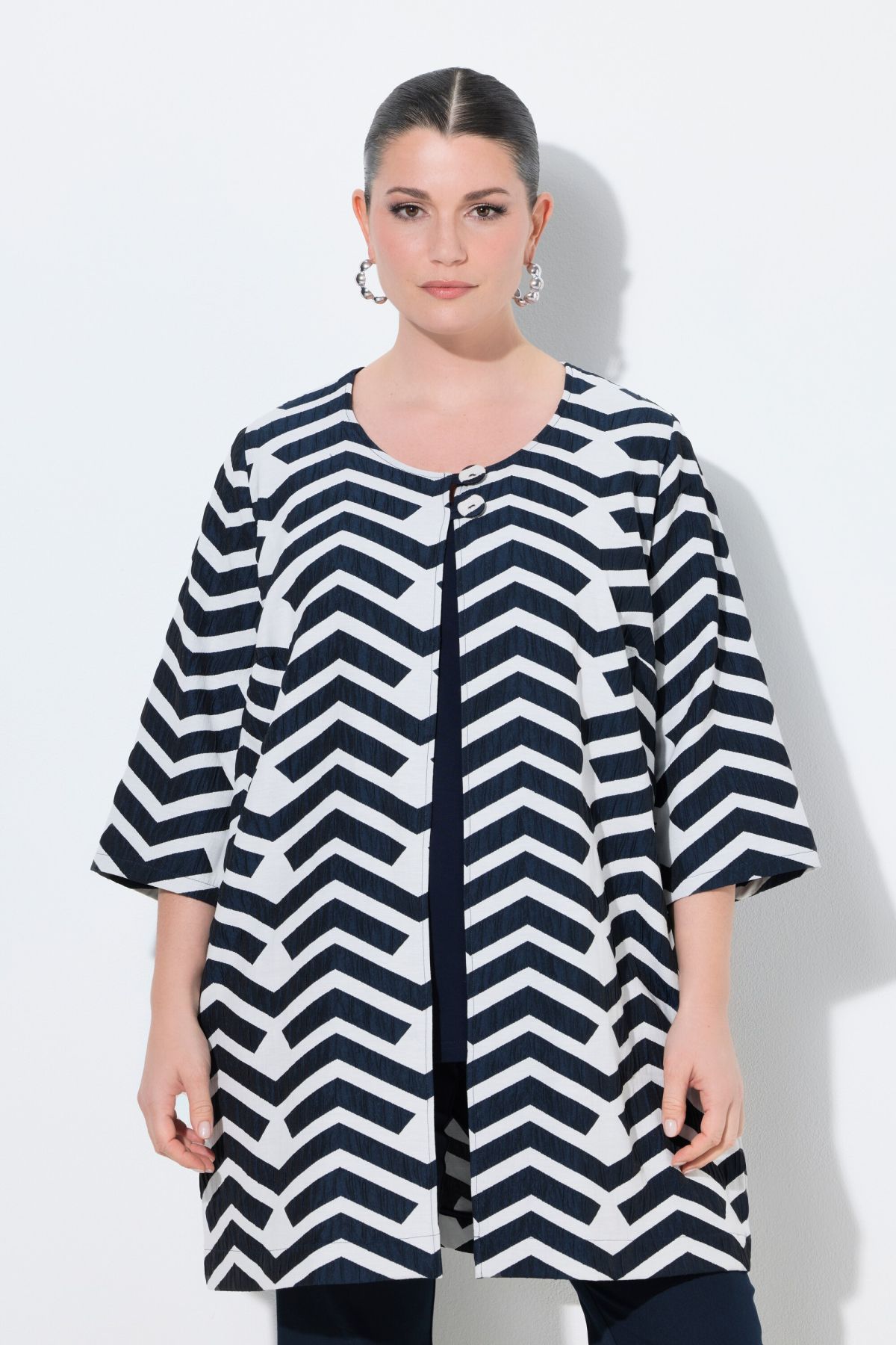 Jacket, A-line, in high-quality viscose with a graphic design and comfortable stretch. Two covered button loops below the round neckline. Long sleeves, inverted pleat in the back for added comfort. Premium fashion for you! Selection by Ulla Popken stands for quality and wearable elegance. Selection by Ulla Popken transforms classics into modern highlights using high-quality materials with intricate prints and details – perfect for everyday wear and special occasions!