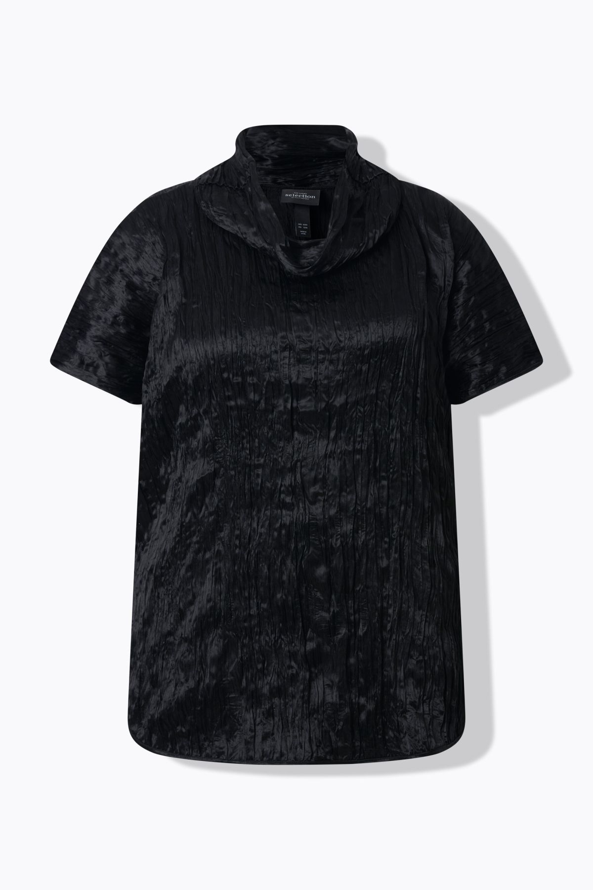 Oversized crinkle blouse in high-quality acetate with a modern texture. Wide stand-up collar, broad dropped shoulders. Sleeve cuffs and hem finished with shimmering satin piping. Back hem approximately 8 cm longer. Premium fashion for you! Selection by Ulla Popken stands for quality and wearable elegance. Selection by Ulla Popken transforms classics into modern highlights using high-quality materials with intricate prints and details – perfect for everyday wear and special occasions!