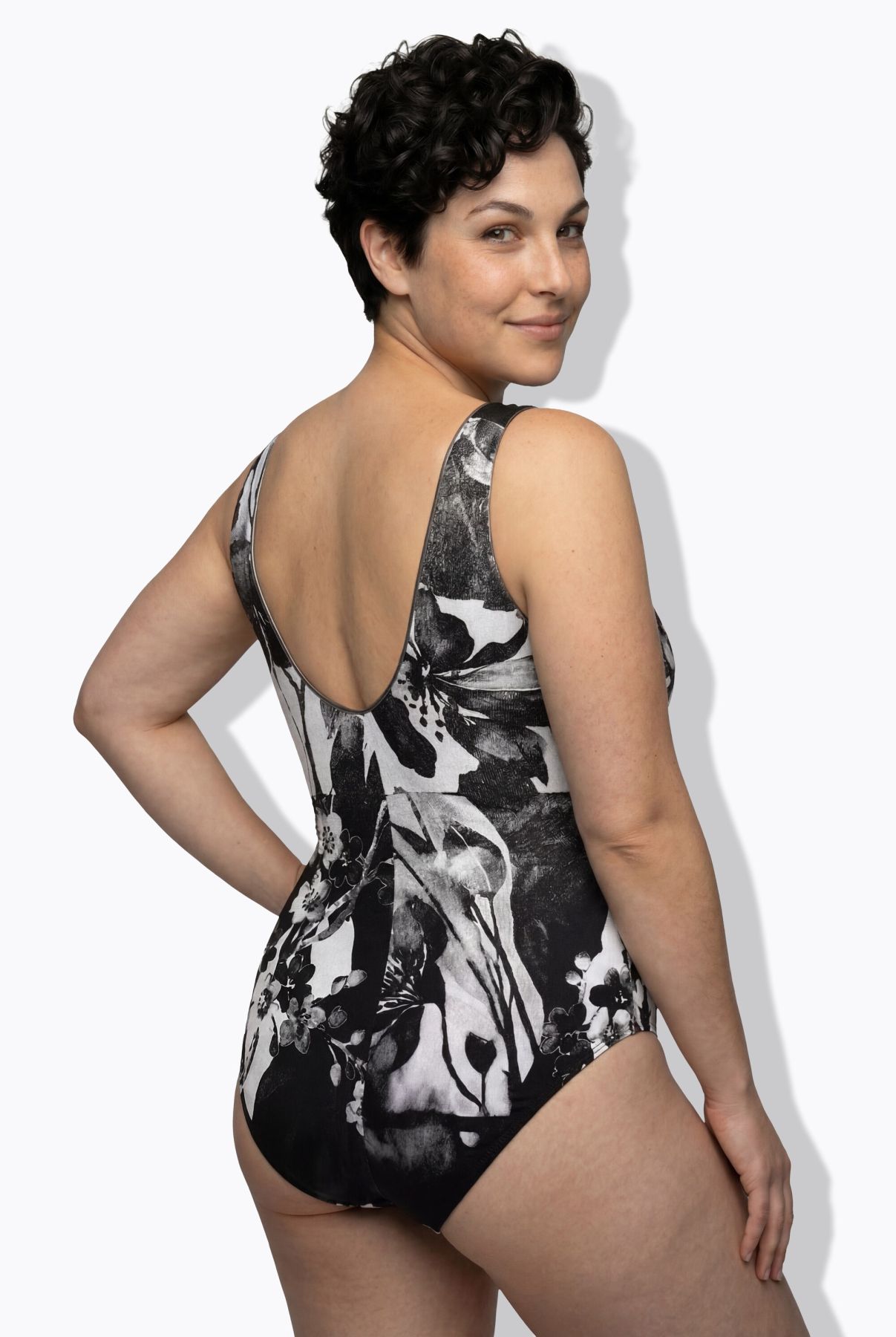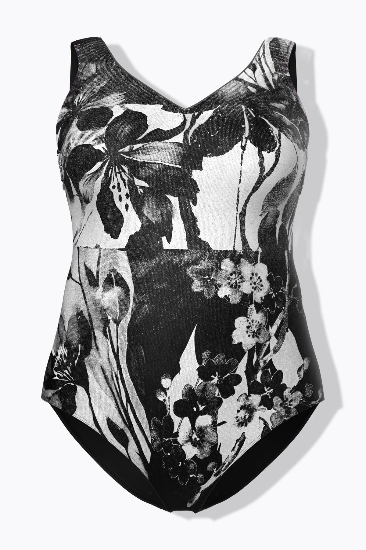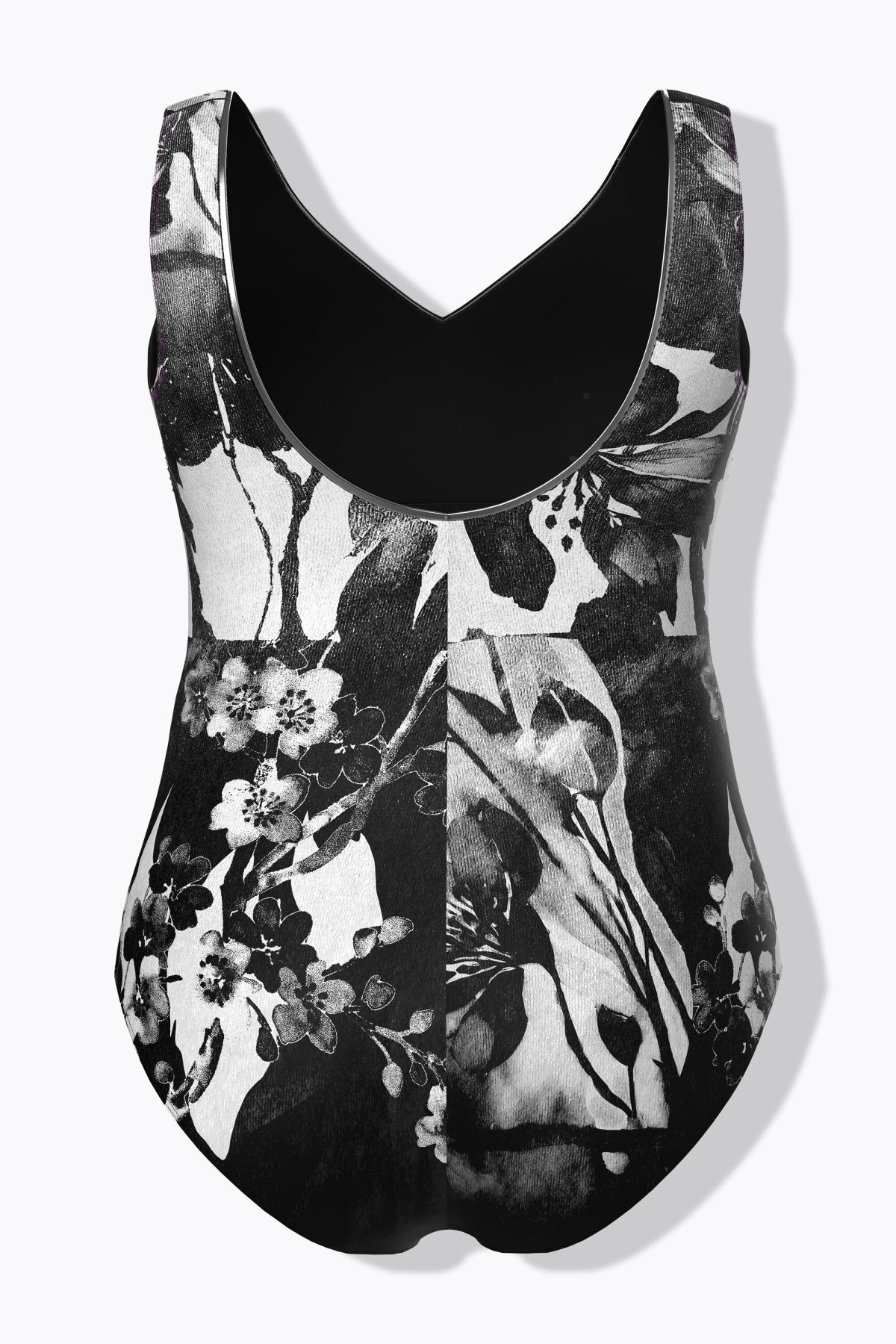 Swimsuit without soft cups. With a modern black and white print and glitter trim at the V-neck. Underbust band and front lining.