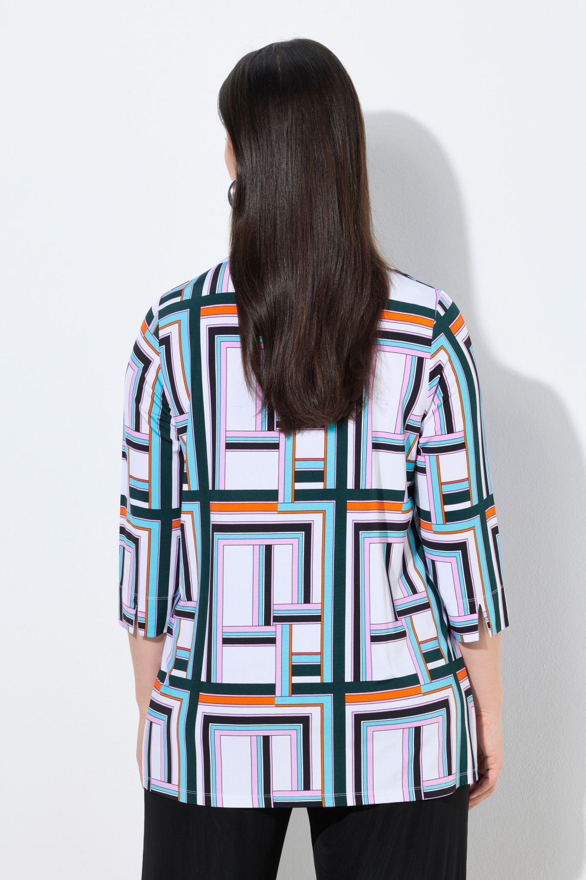 Slinky piqué shirt, A-line with a comfortable hem width, made from elegant slinky piqué jersey with a fine texture and graphic design. Features a V-neck stand-up collar and three-quarter sleeves. The high-quality, very smooth, and slightly heavier slinky fabric feels exceptionally soft and comfortable and drapes beautifully. The fabric's elasticity ensures a comfortable fit. Premium fashion for you! selection by Ulla Popken stands for quality and wearable elegance. Selection by Ulla Popken transforms classic pieces into modern highlights using high-quality materials with intricate prints and details – perfect for everyday wear and special occasions!