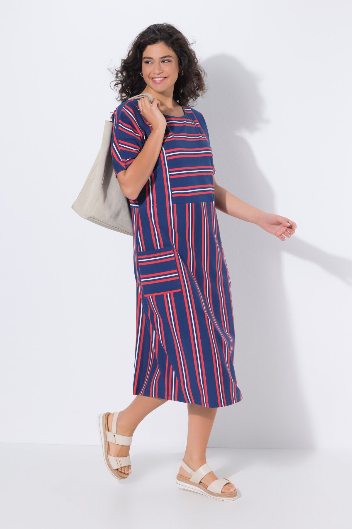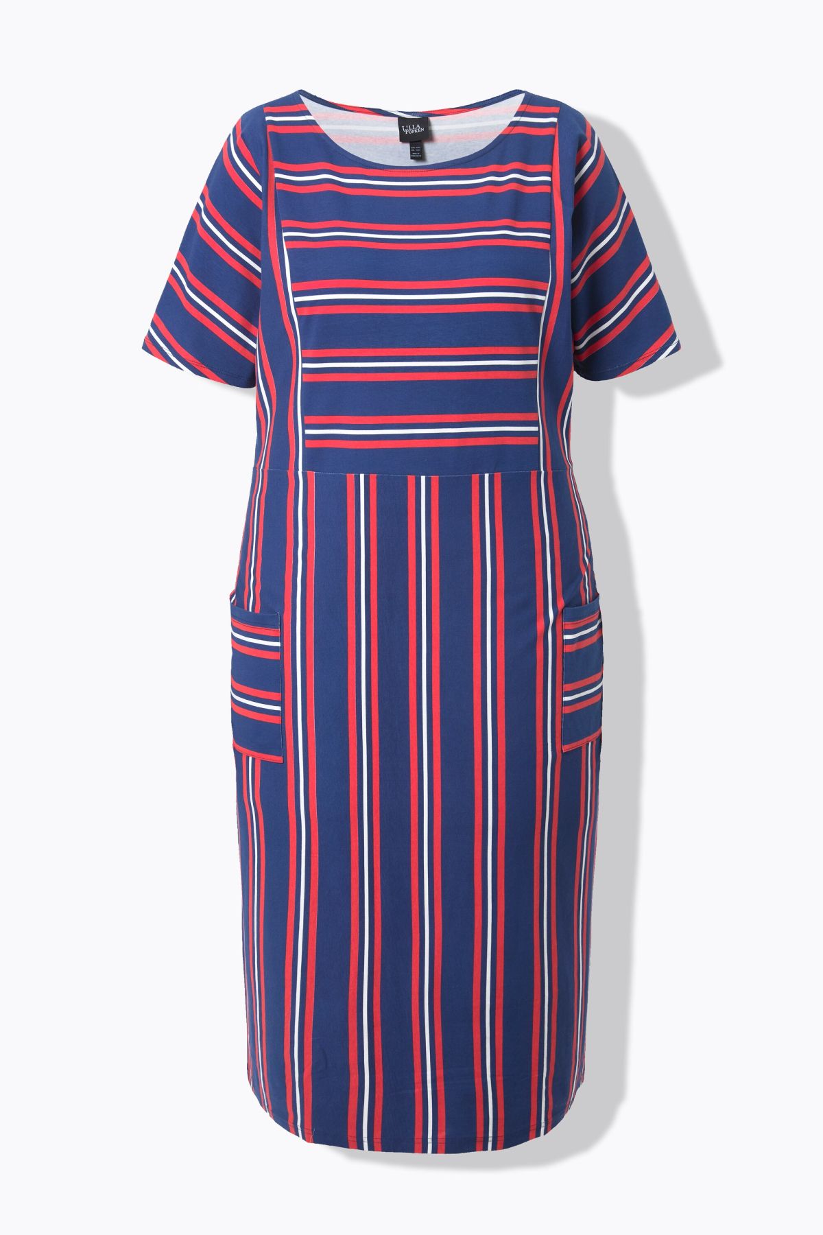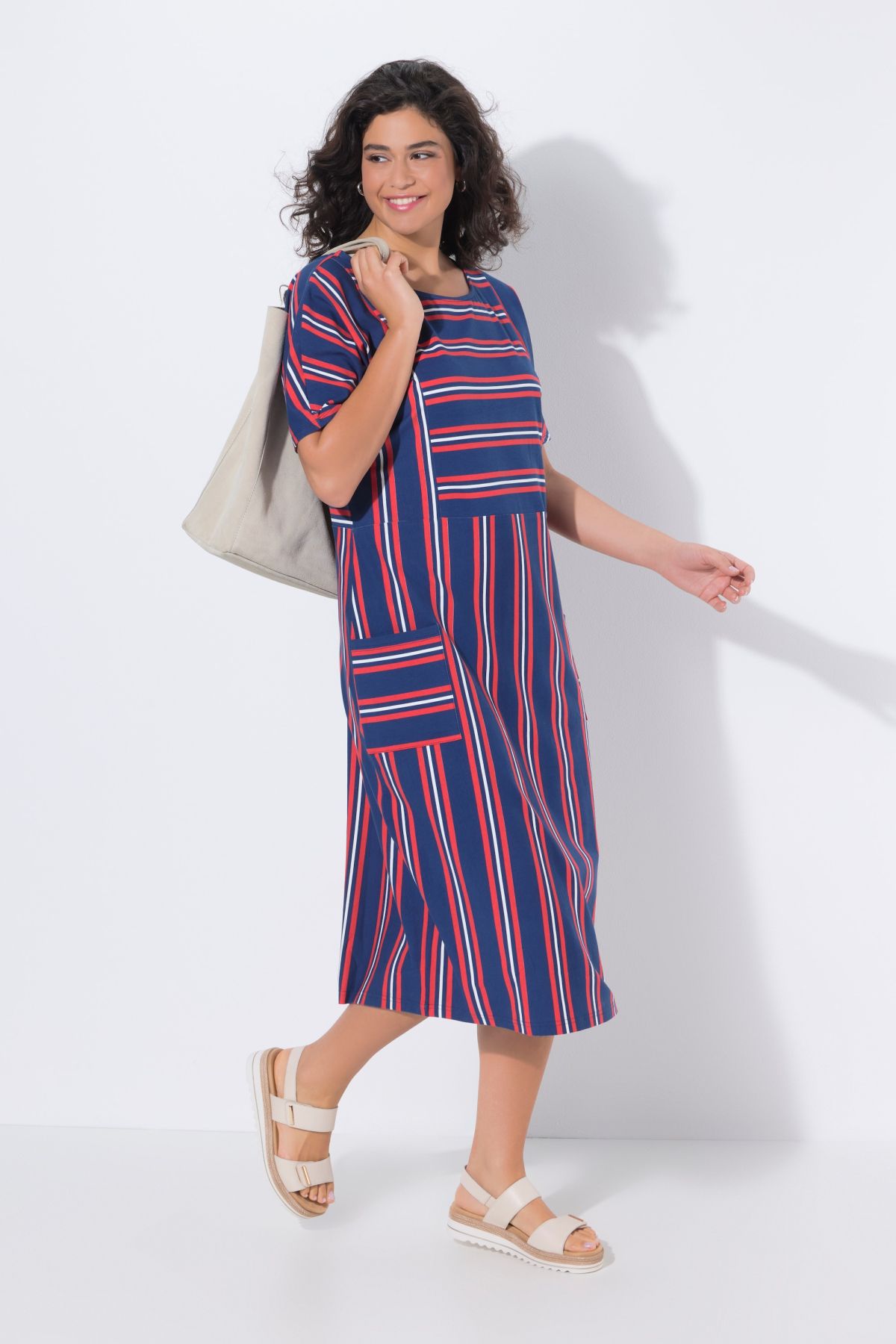 Jersey midi dress, comfortable fit, made from pleasantly stretchy jersey with a striped patchwork pattern. Round neckline, dropped shoulders, short sleeves. Two patch pockets.