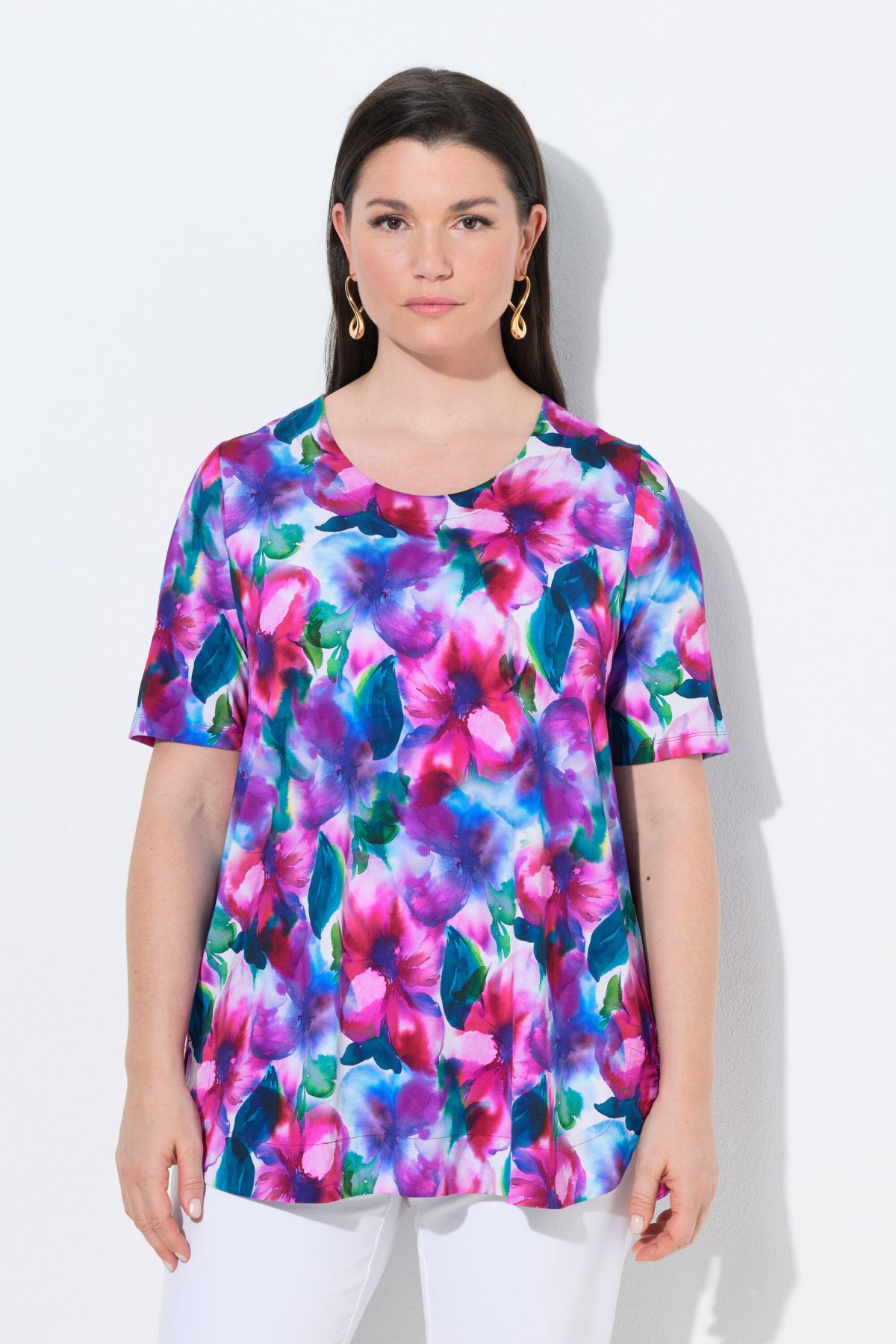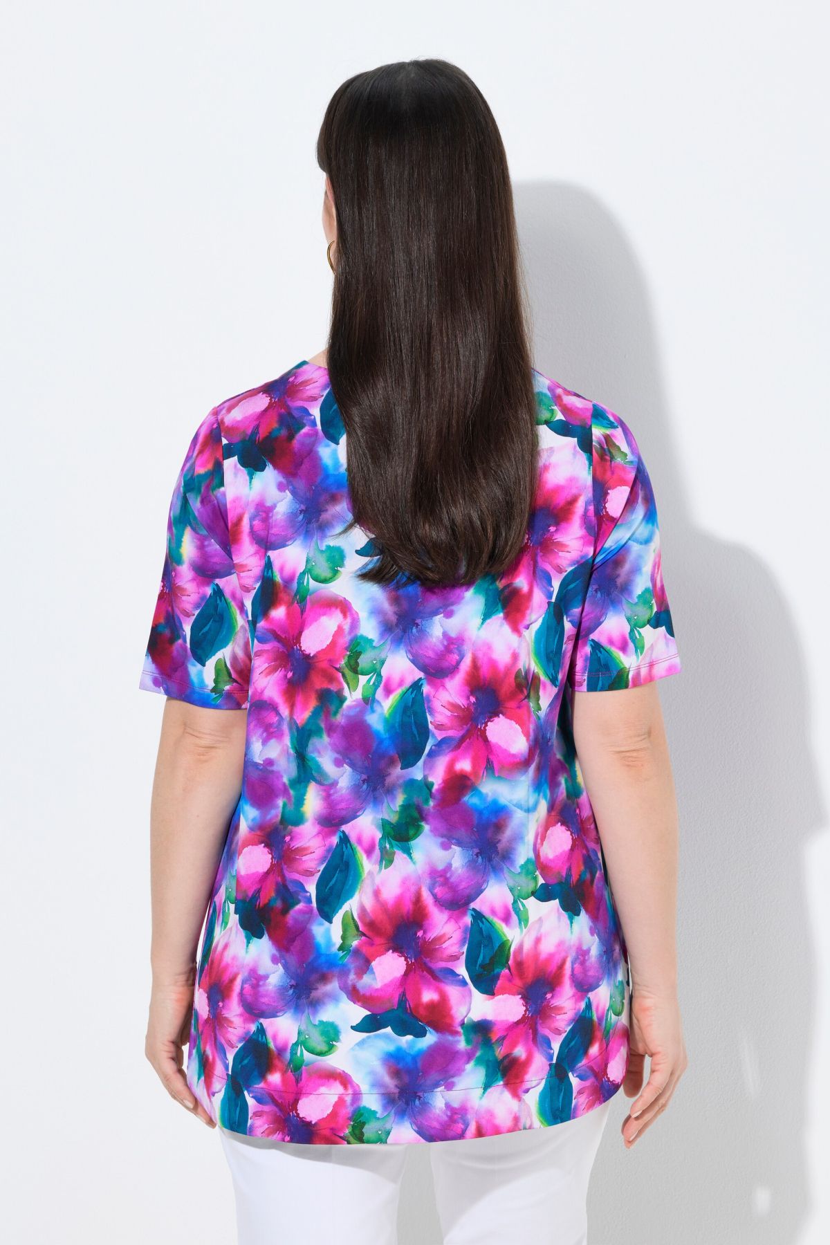 Slinky A-line shirt with a comfortable hem width, made from high-quality slinky jersey with a watercolor floral design. Round neck, short sleeves with a short slit. Back pleat for added comfort, rounded hem. The high-quality, very smooth, and slightly heavier slinky fabric feels exceptionally soft and comfortable and drapes beautifully. The fabric's elasticity ensures a comfortable fit. Premium fashion for you! Selection by Ulla Popken stands for quality and wearable elegance. Selection by Ulla Popken transforms classic pieces into modern highlights using high-quality materials with intricate prints and details – perfect for everyday wear and special occasions!