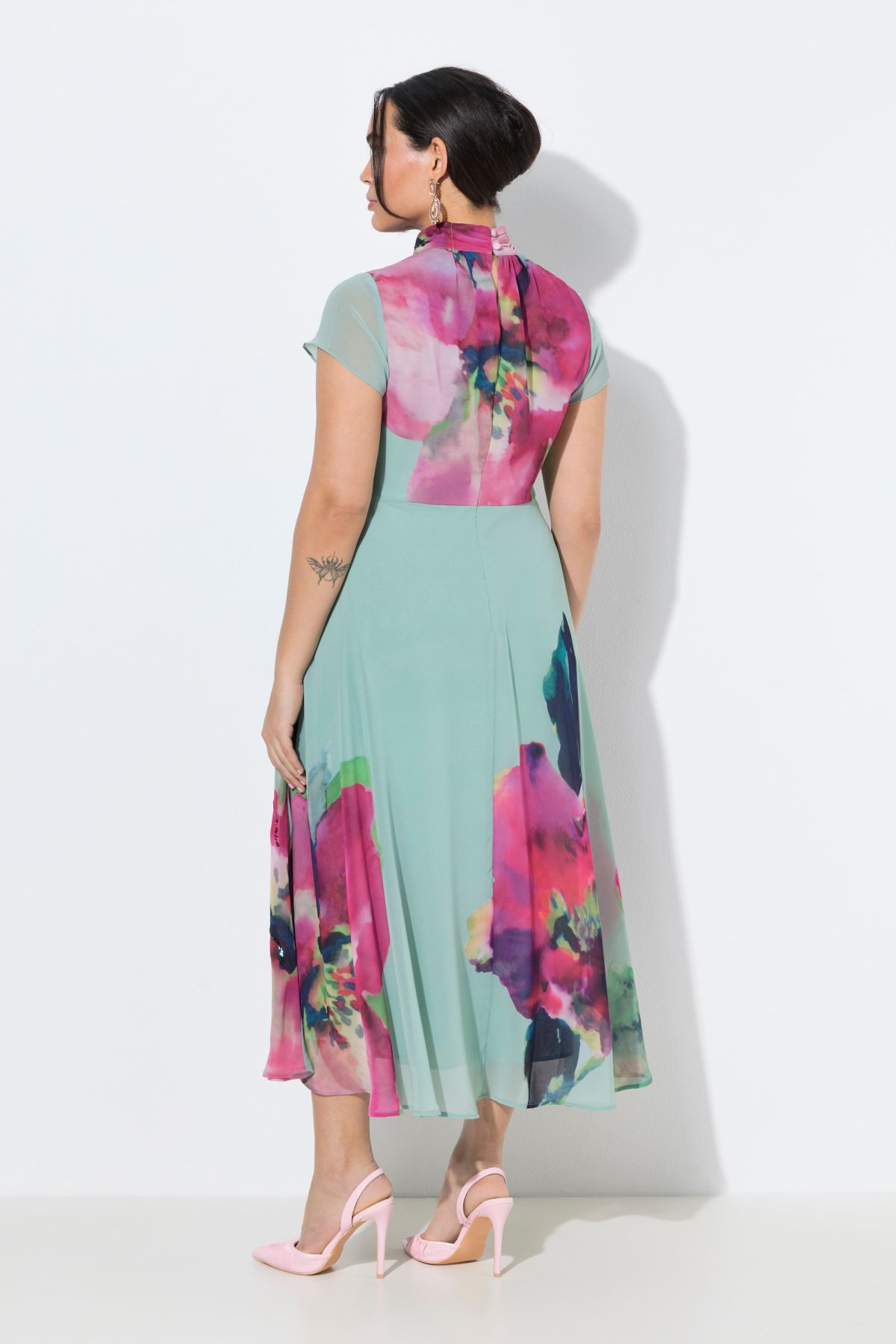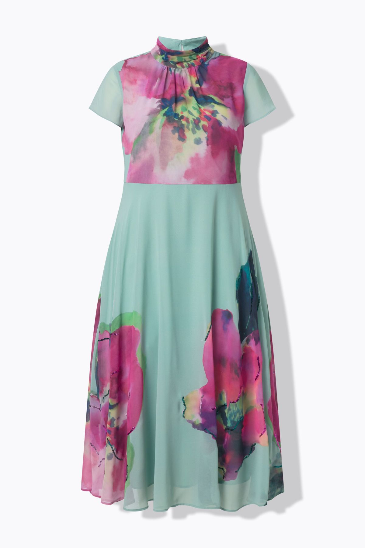 Maxi dress, comfortable, sleeveless fit, double-layered. Transparent chiffon with sequin print, underneath an opaque jersey lining. Slightly gathered stand-up collar with keyhole and button at the nape of the neck. Concealed back zipper.