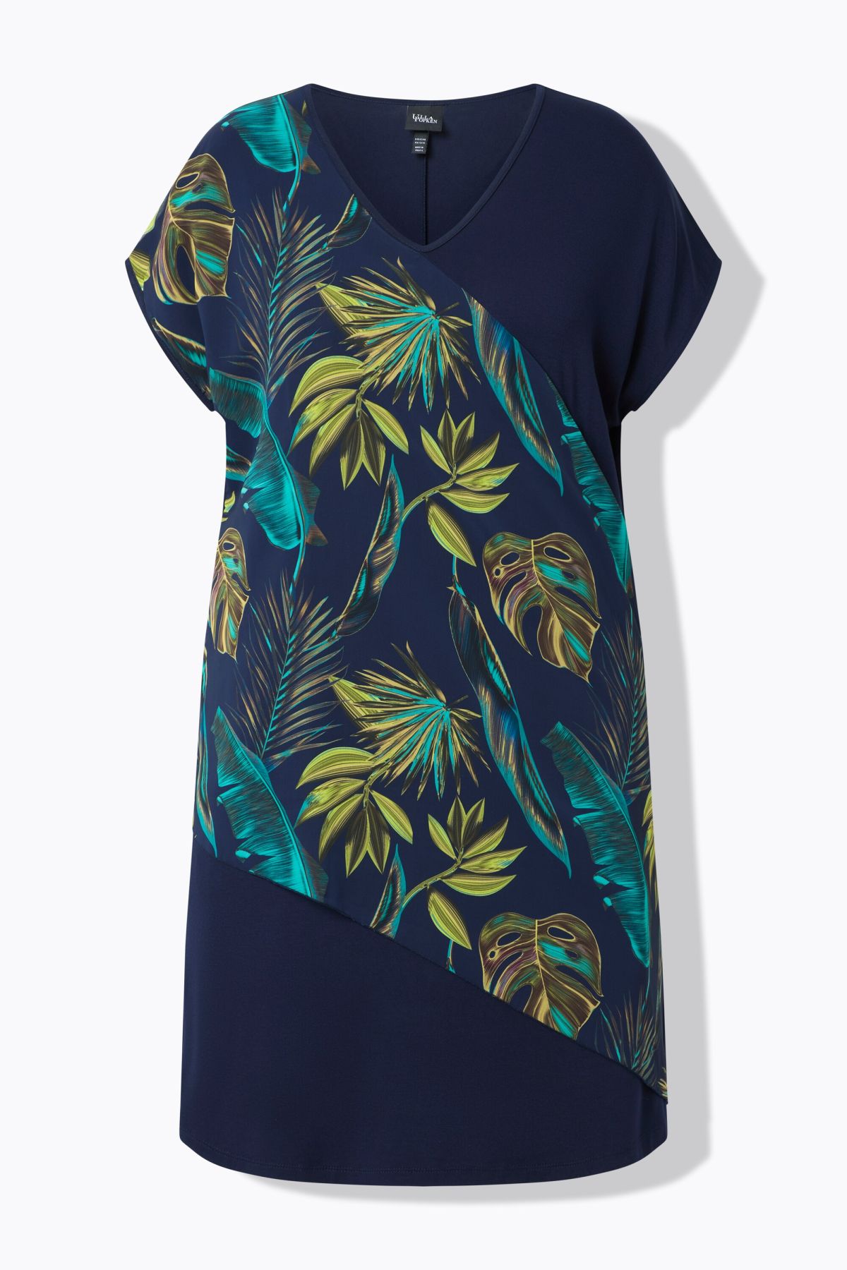 Tropical Leaf Print Chiffon Panel Dress - Featuring an airy chiffon overlay for a dimensional look.