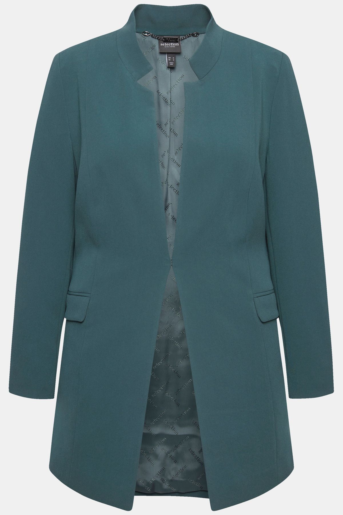 Блейзър с изправена яка с модерни цепки на реверите. С дълги ръкави, едно метално копче за закопчаване и джобове с капаци.