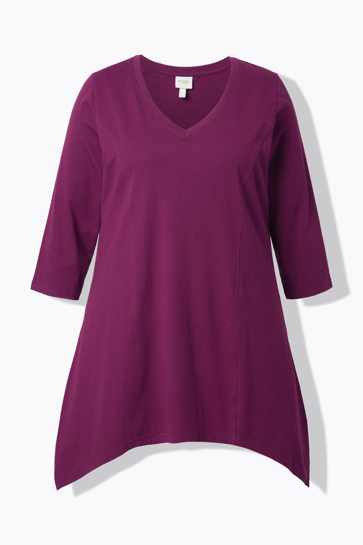 Тениска с асиметричен подгъв с шевови акценти отпред и отзад и заоблен подгъв, придаващ женственост на визията. Със заоблено V - образно деколте и 3/4 ръкави. С А - линия на деколтето.
