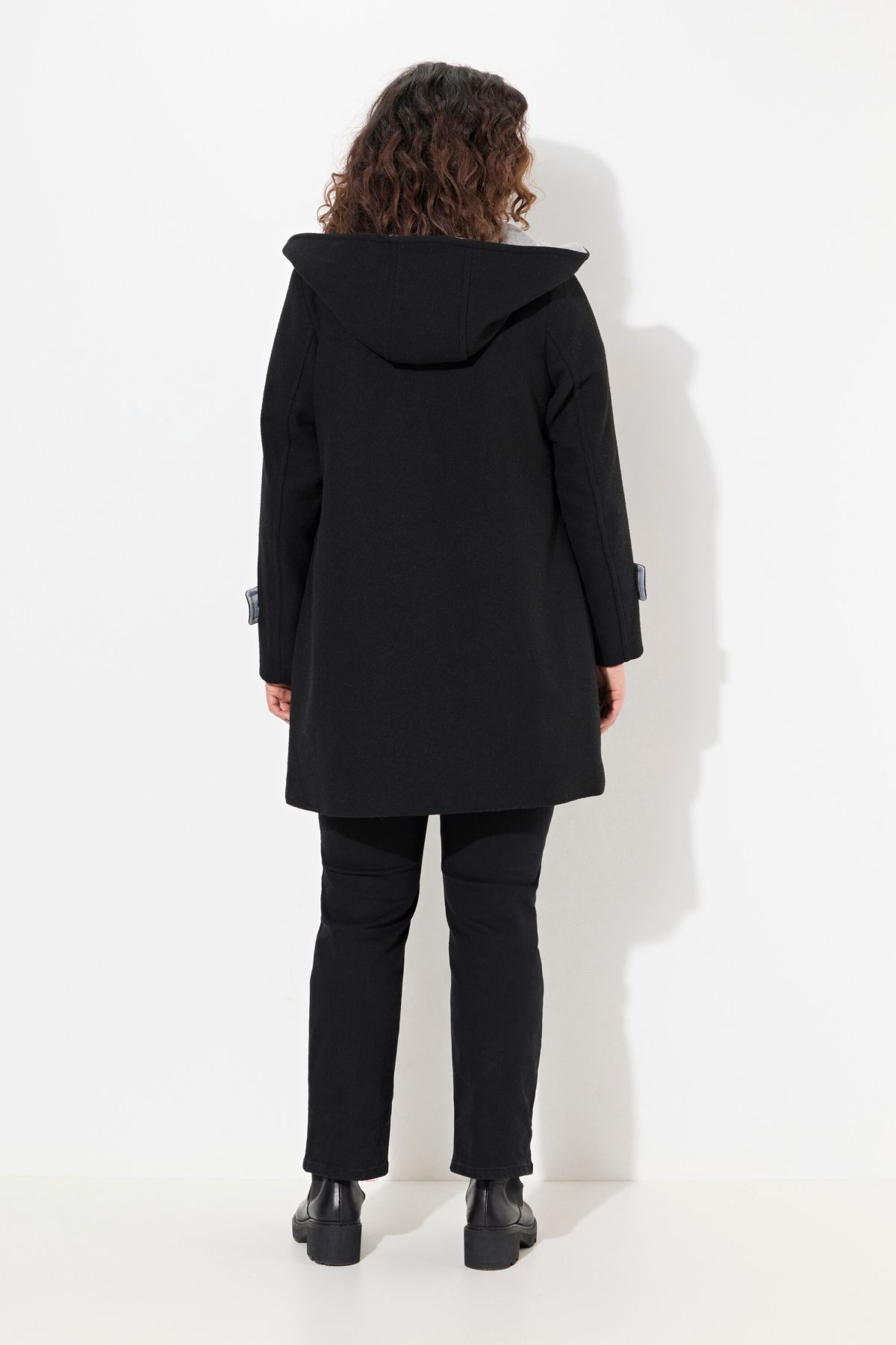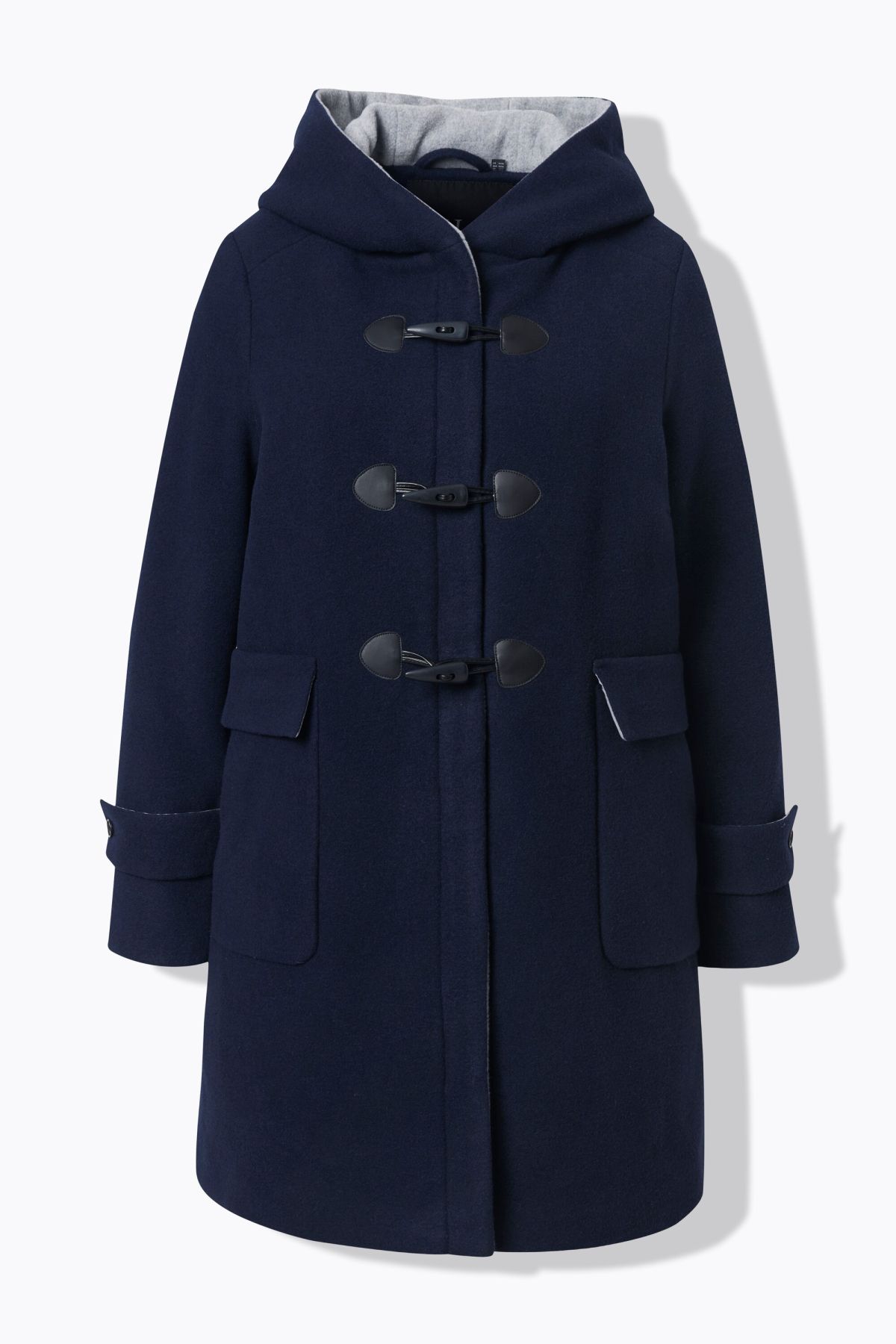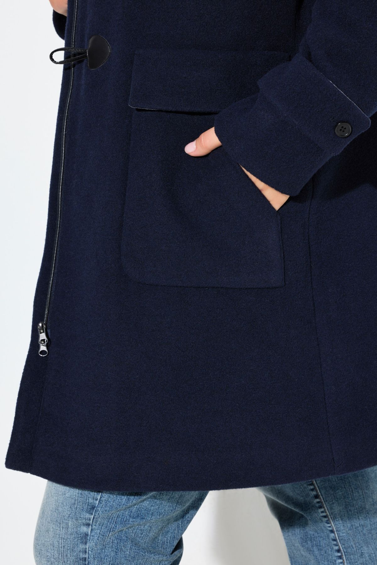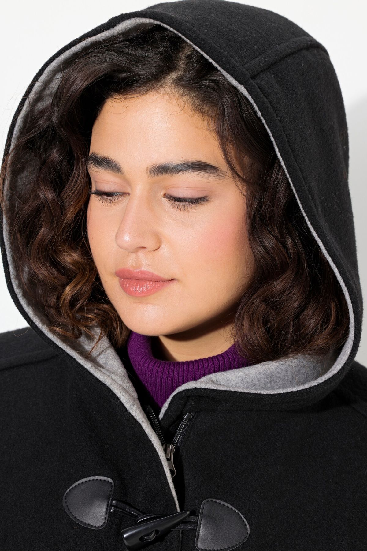 Палто от вълнена материя с декоративни копчета отпред от изкуствена кожа. С външни джобове и широка качулка. Изцяло подплатено.