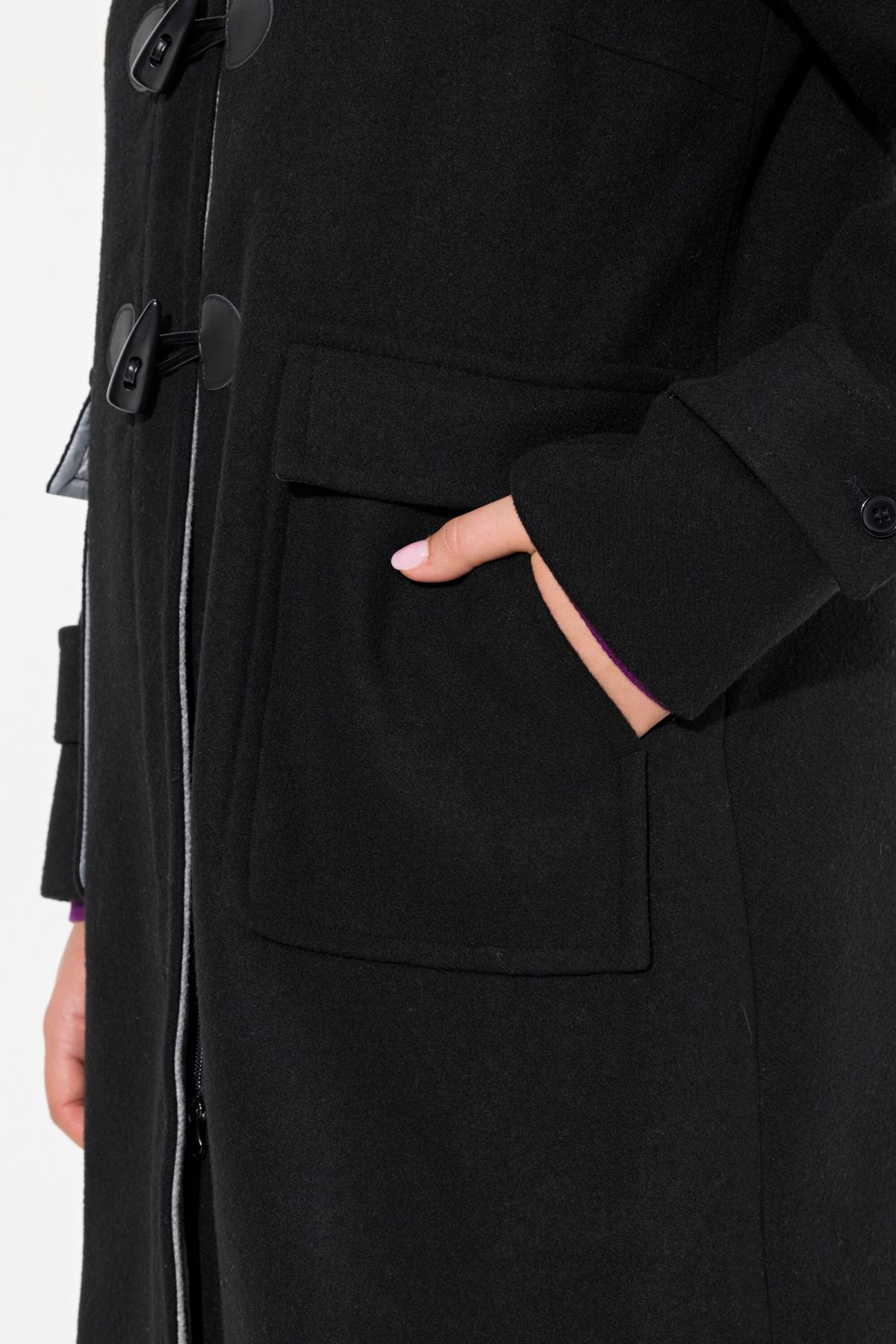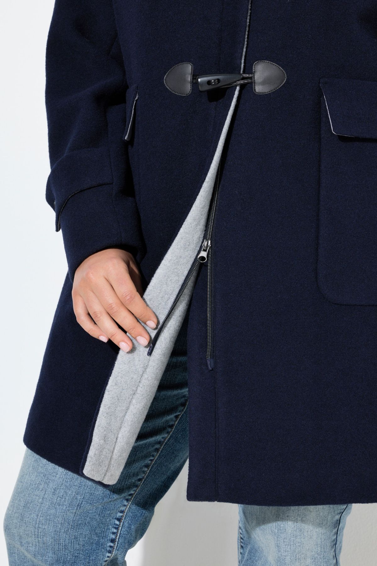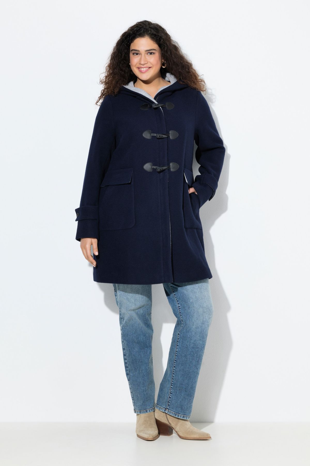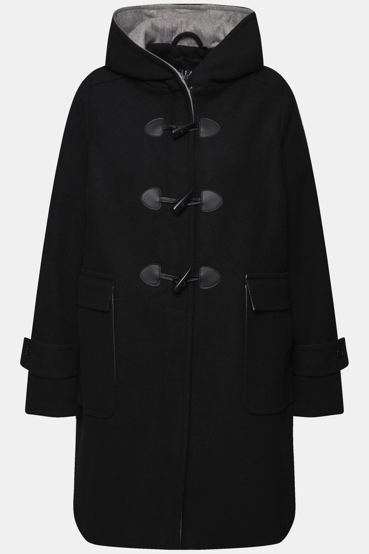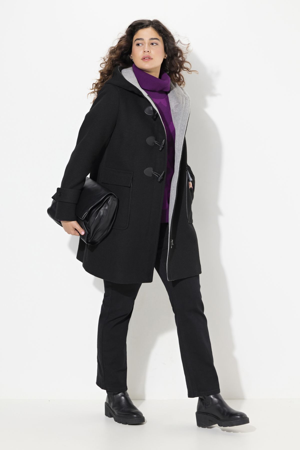 Палто от вълнена материя с декоративни копчета отпред от изкуствена кожа. С външни джобове и широка качулка. Изцяло подплатено.