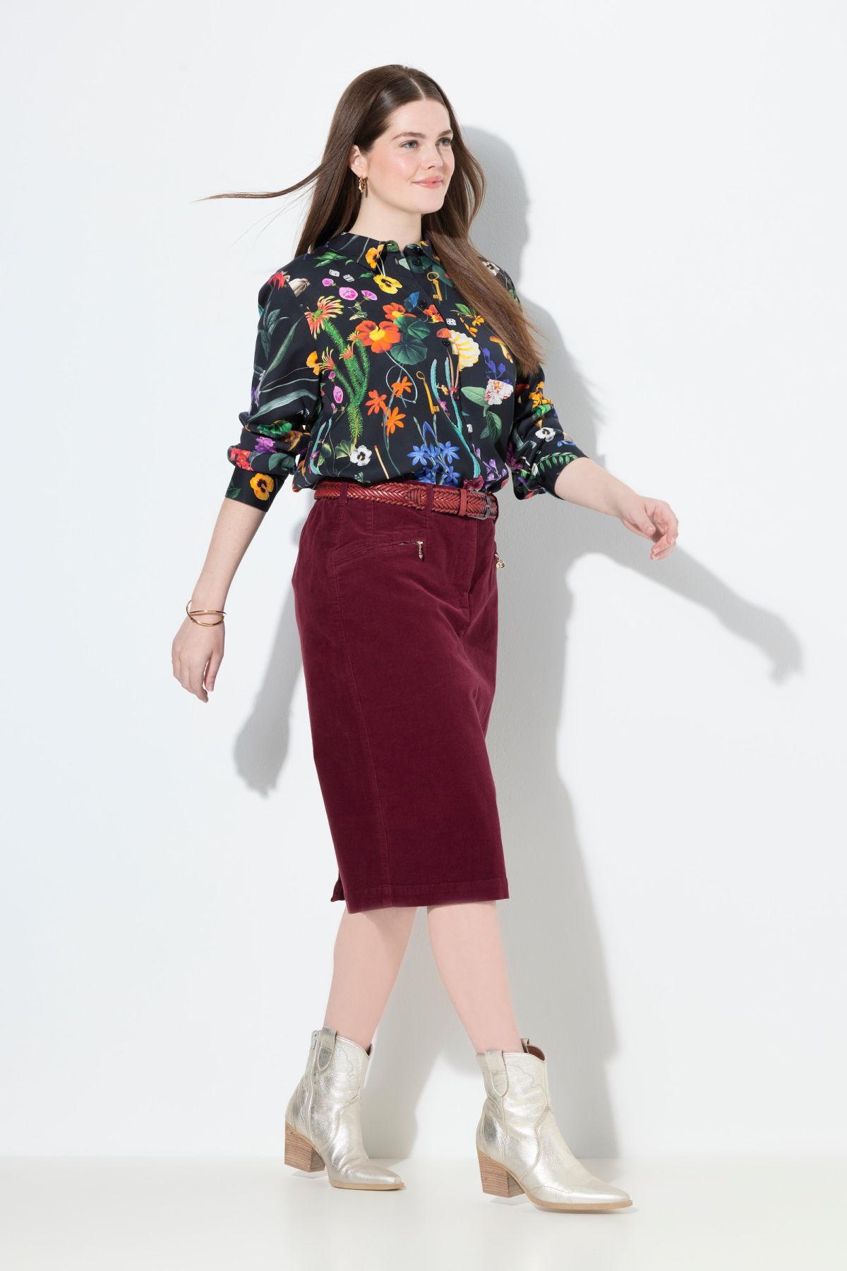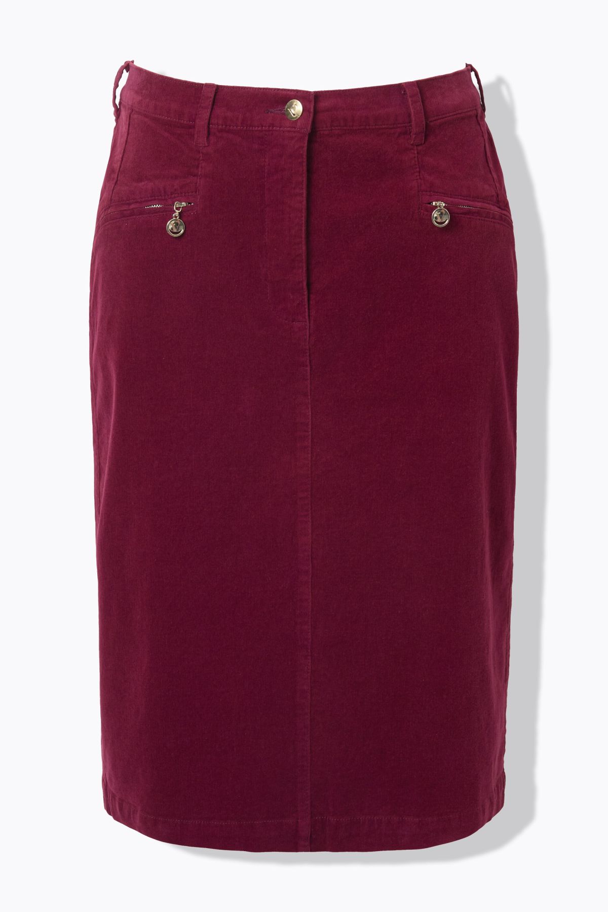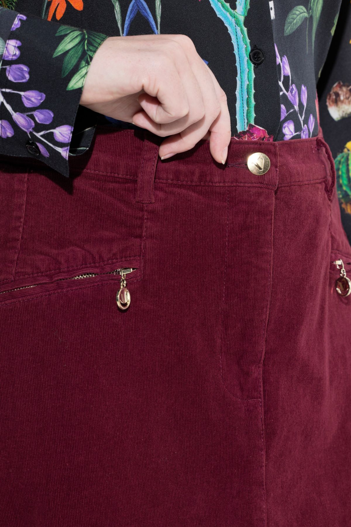 Пола от рипсено кадифе с тесен силует с традиционни акценти и класическа визия.