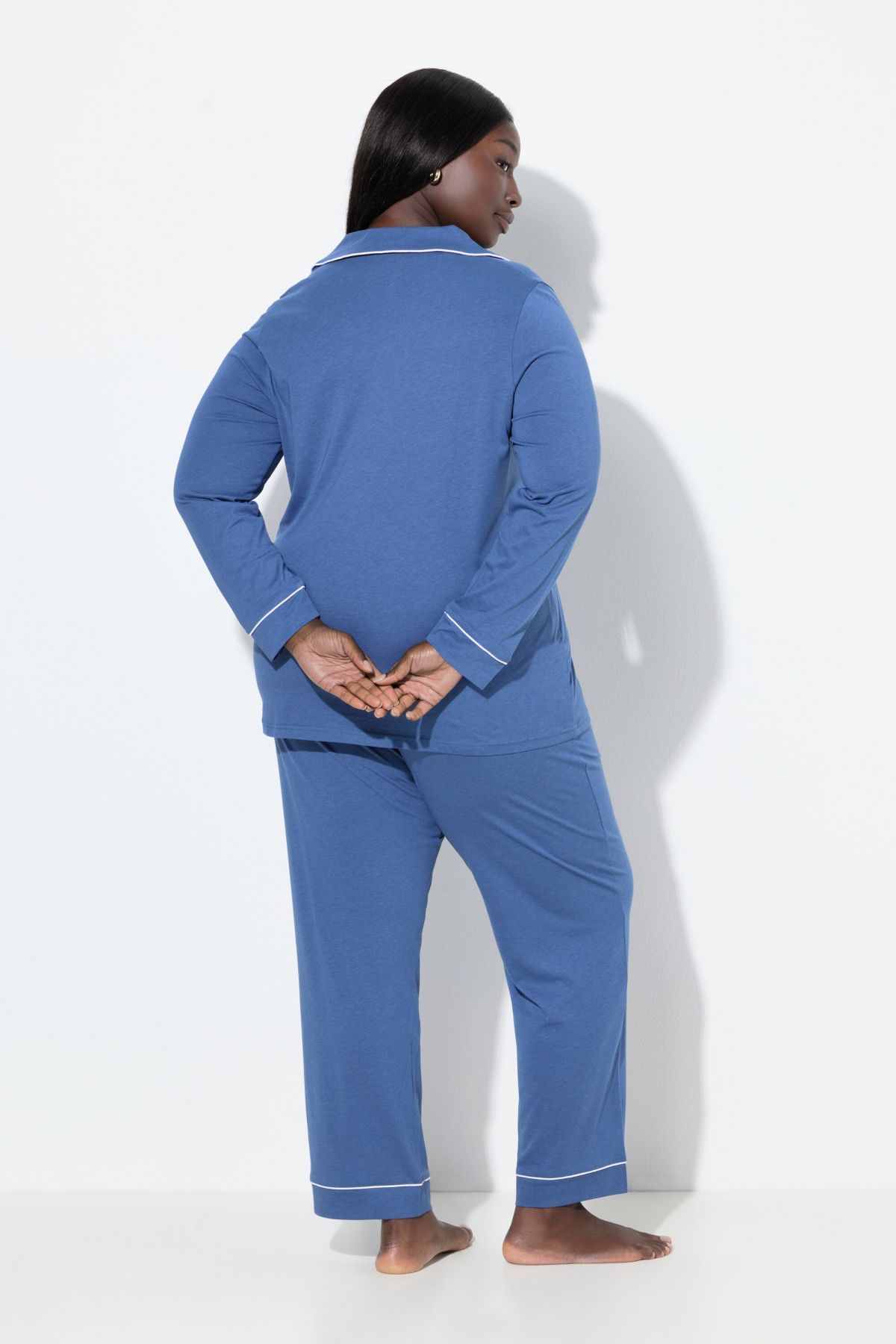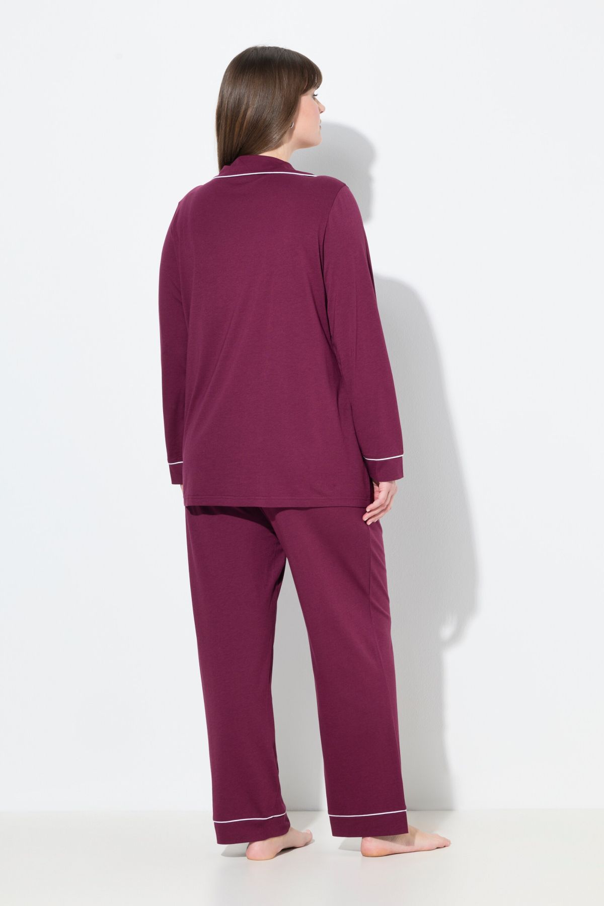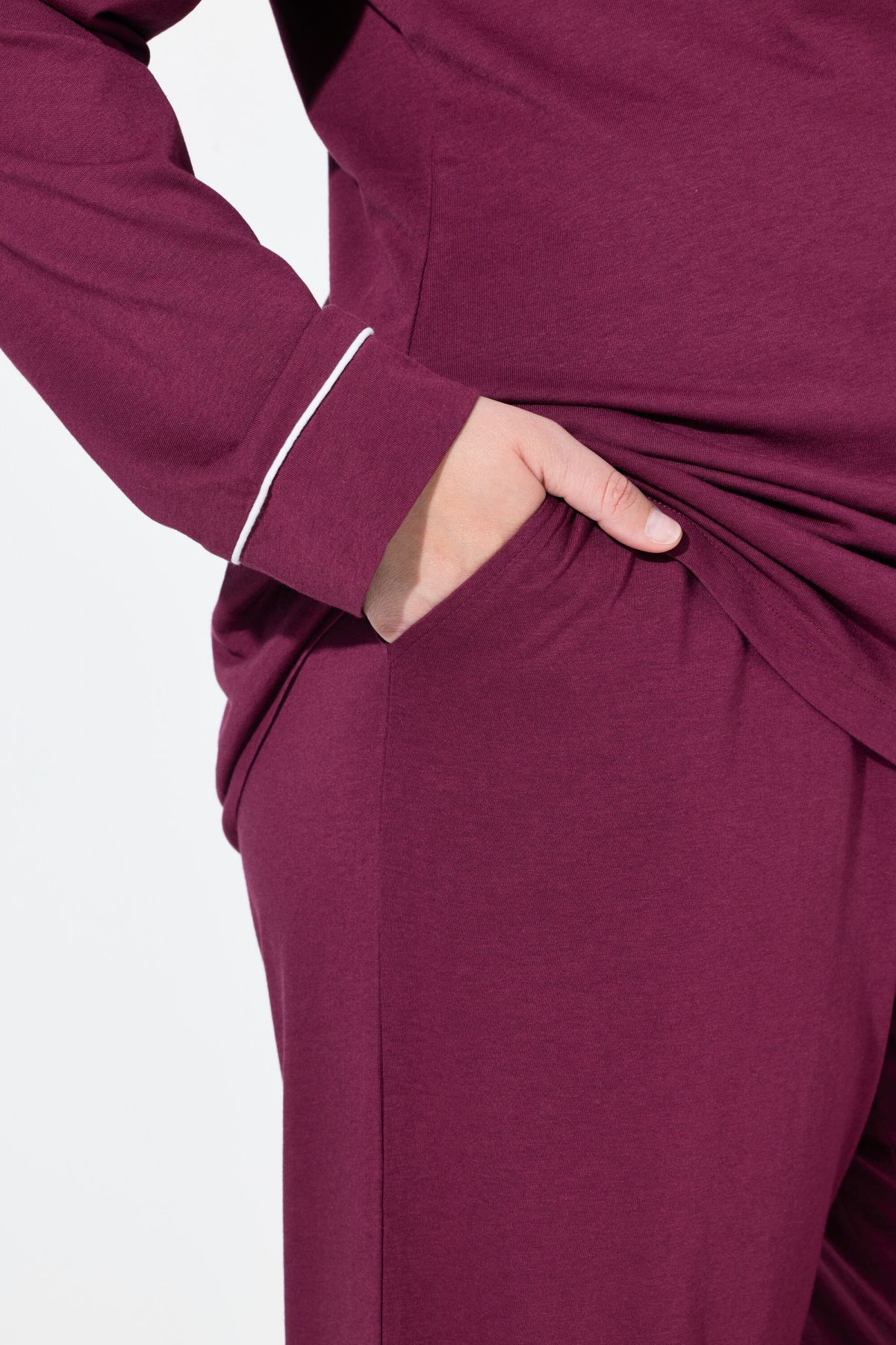 Пижама с контрастни акценти. Класическо съчетание с горнище с ревер яка и дълги ръкави. С долнище с еластична талия и странични джобове.
