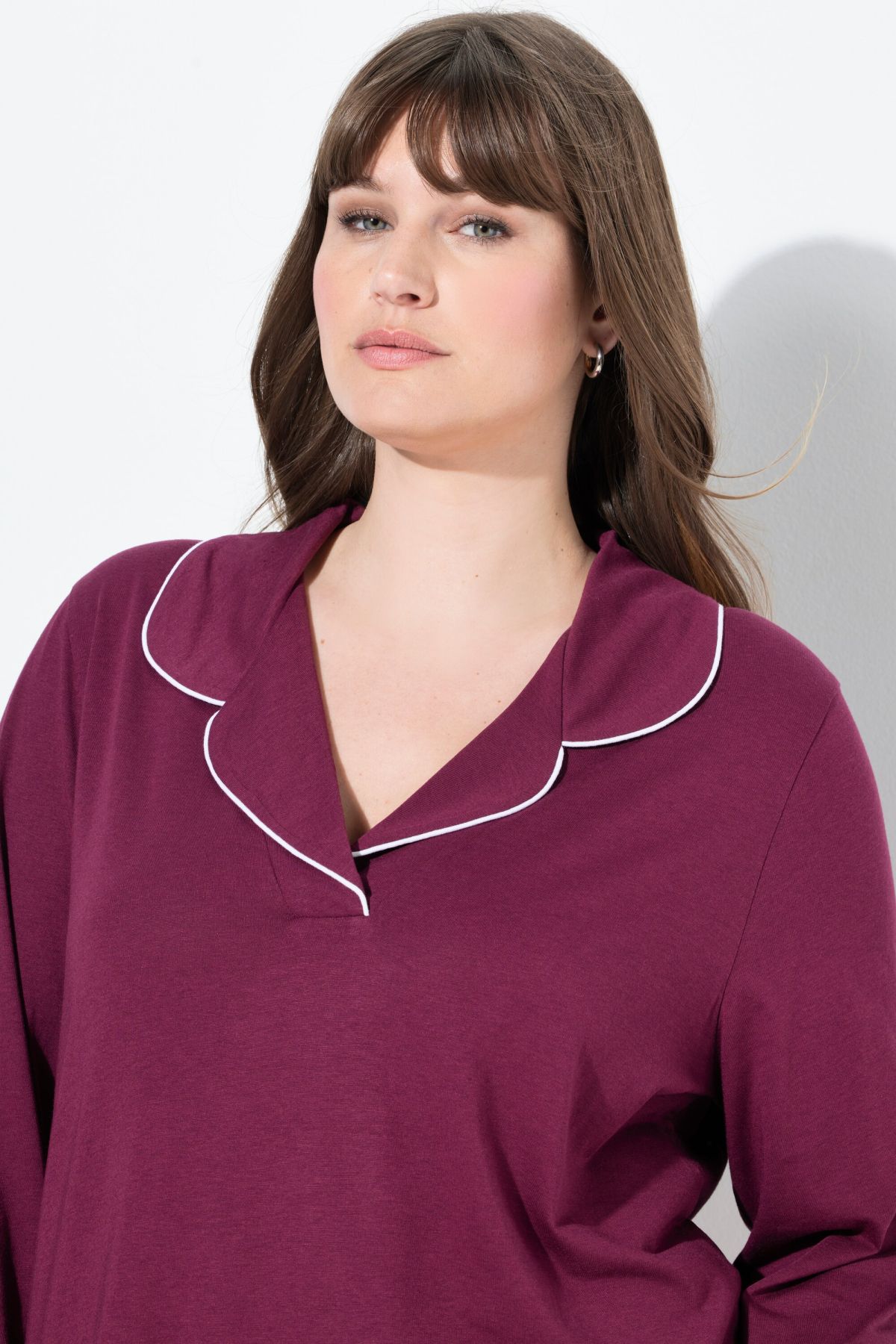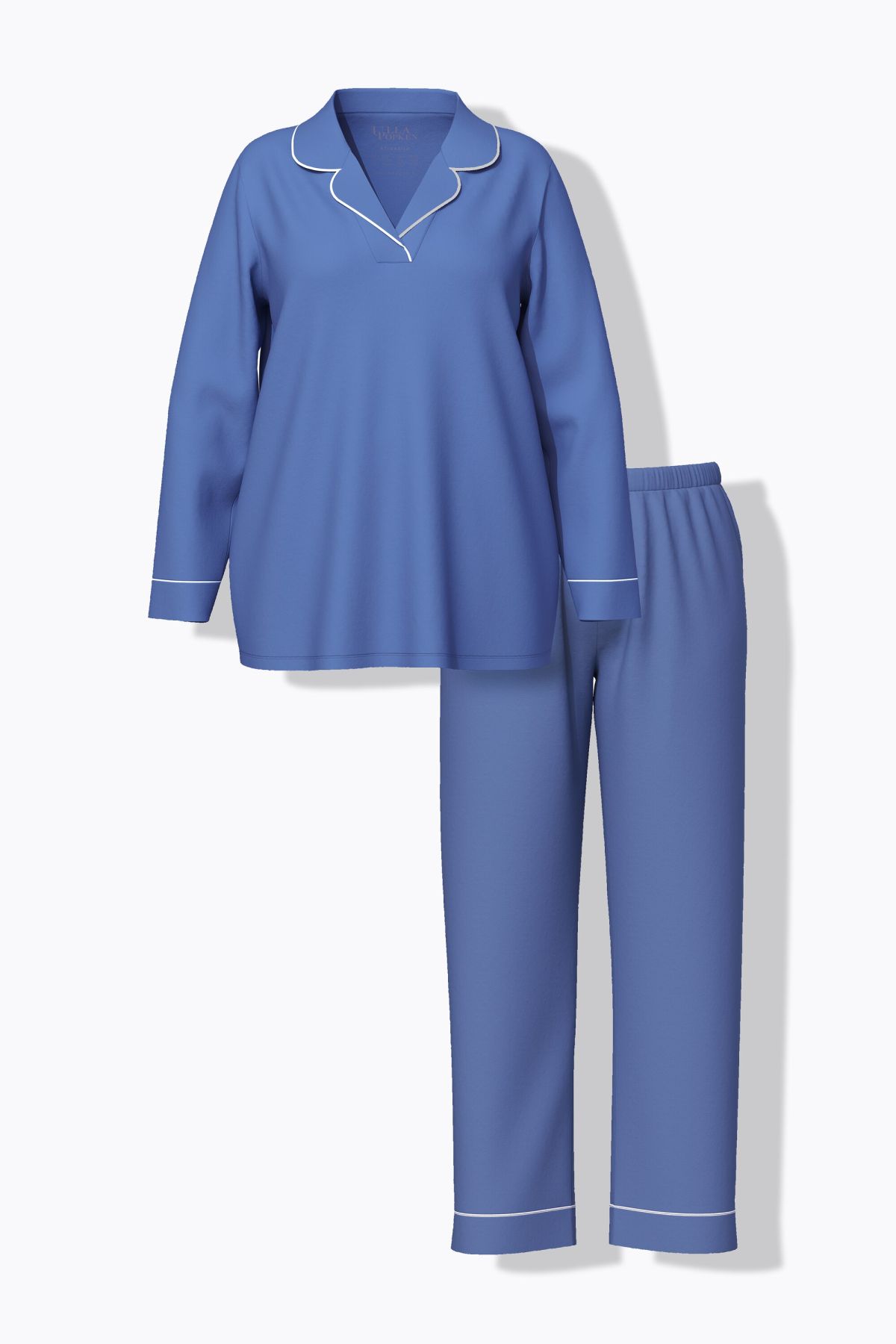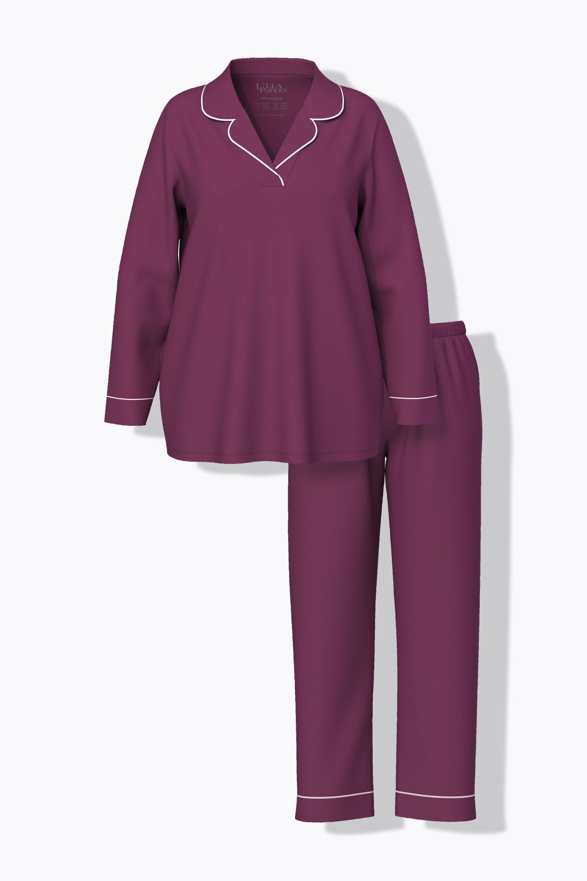 Пижама с контрастни акценти. Класическо съчетание с горнище с ревер яка и дълги ръкави. С долнище с еластична талия и странични джобове.