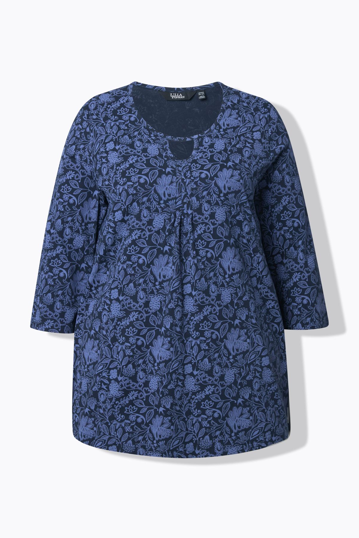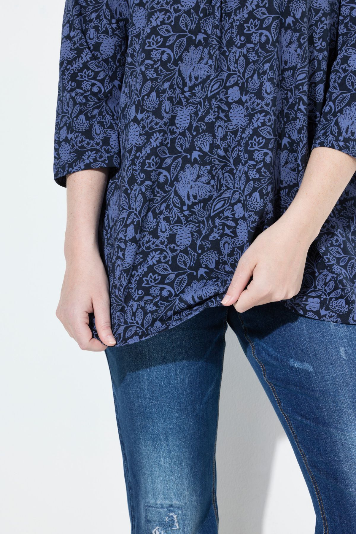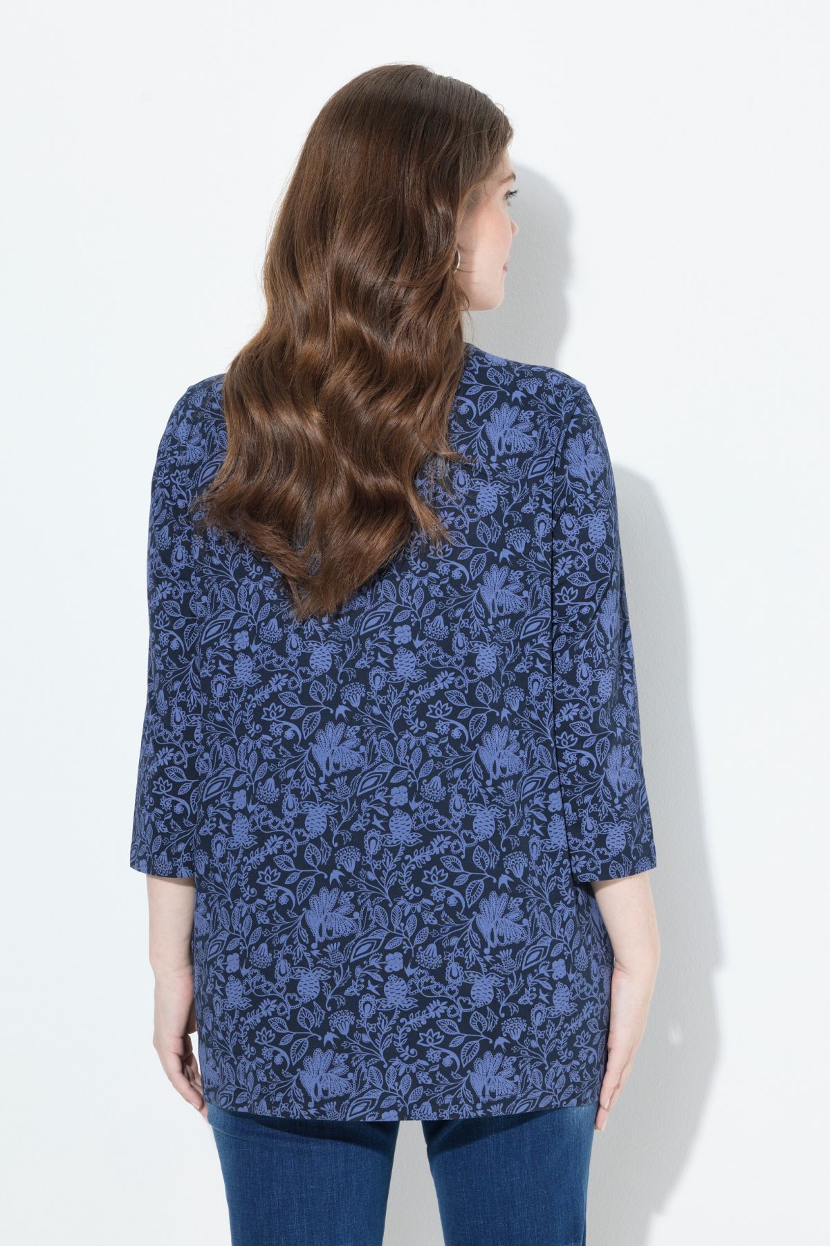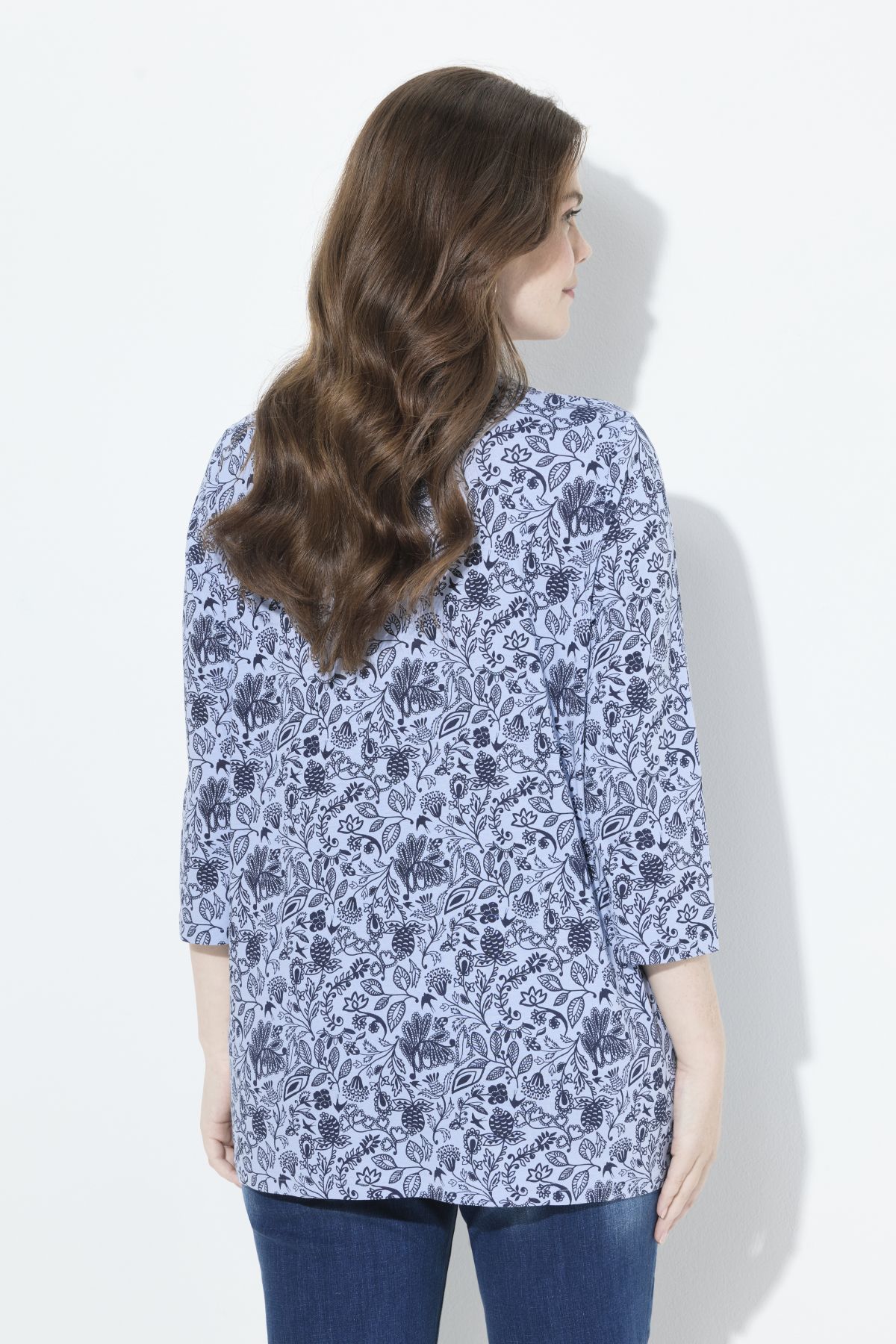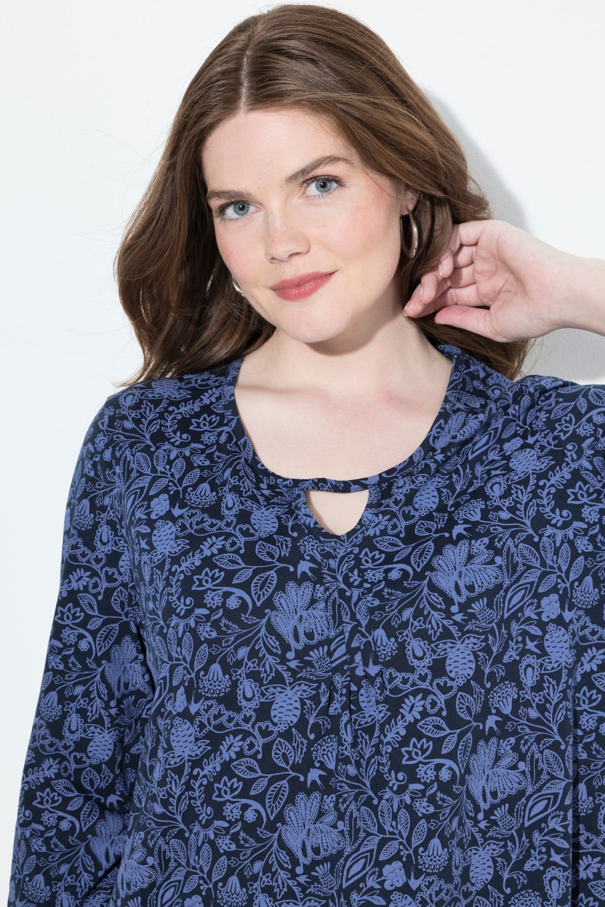 Тениска с флорален пейзли принт в традиционна градска визия. С кръгло деколте с връзка. С разкроени акценти. С дълги ръкави.