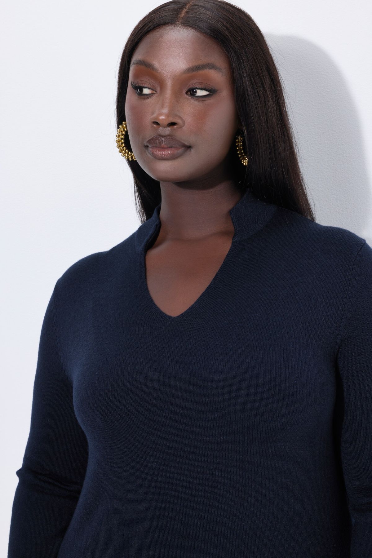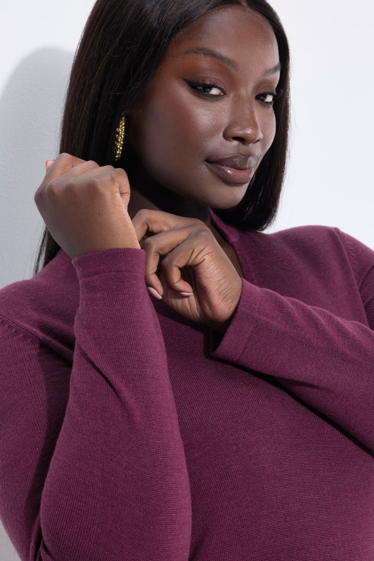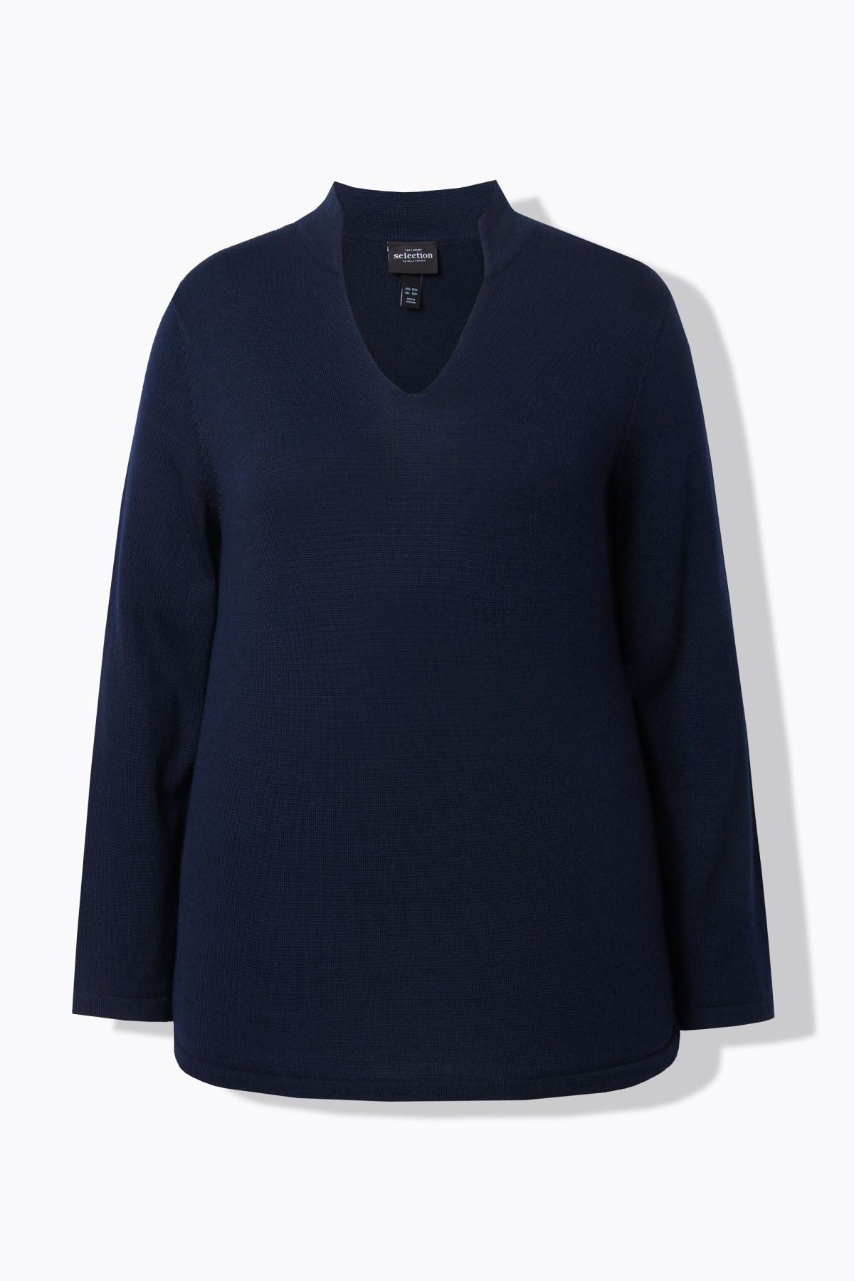 Пуловер от мека, вълнена материя в комбинация с коприна. С V - образно деколте и дълги ръкави.